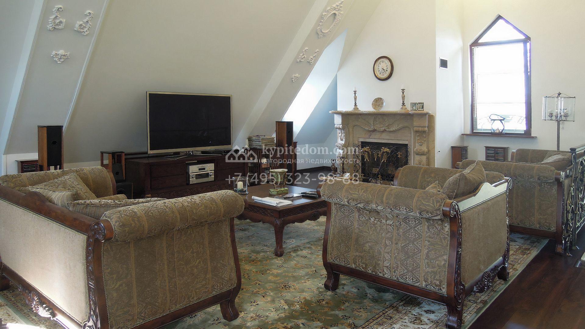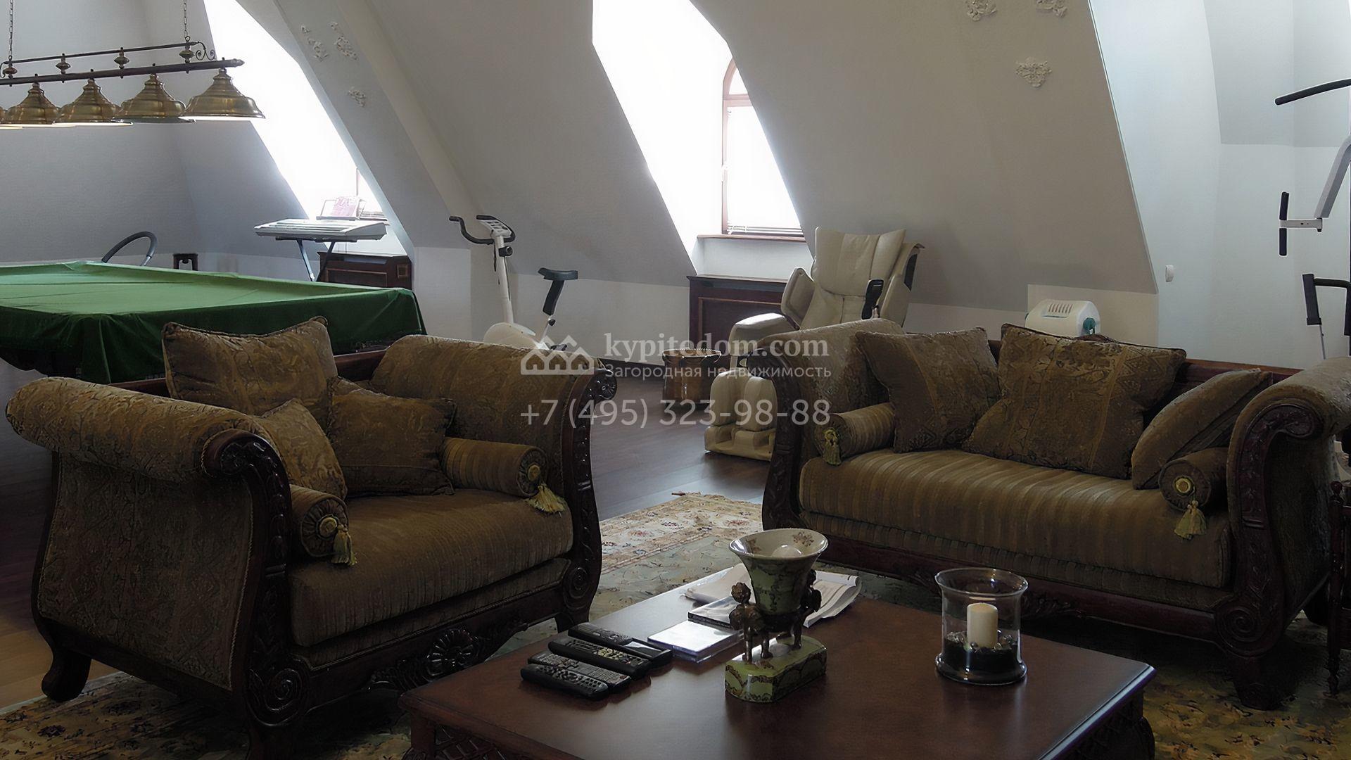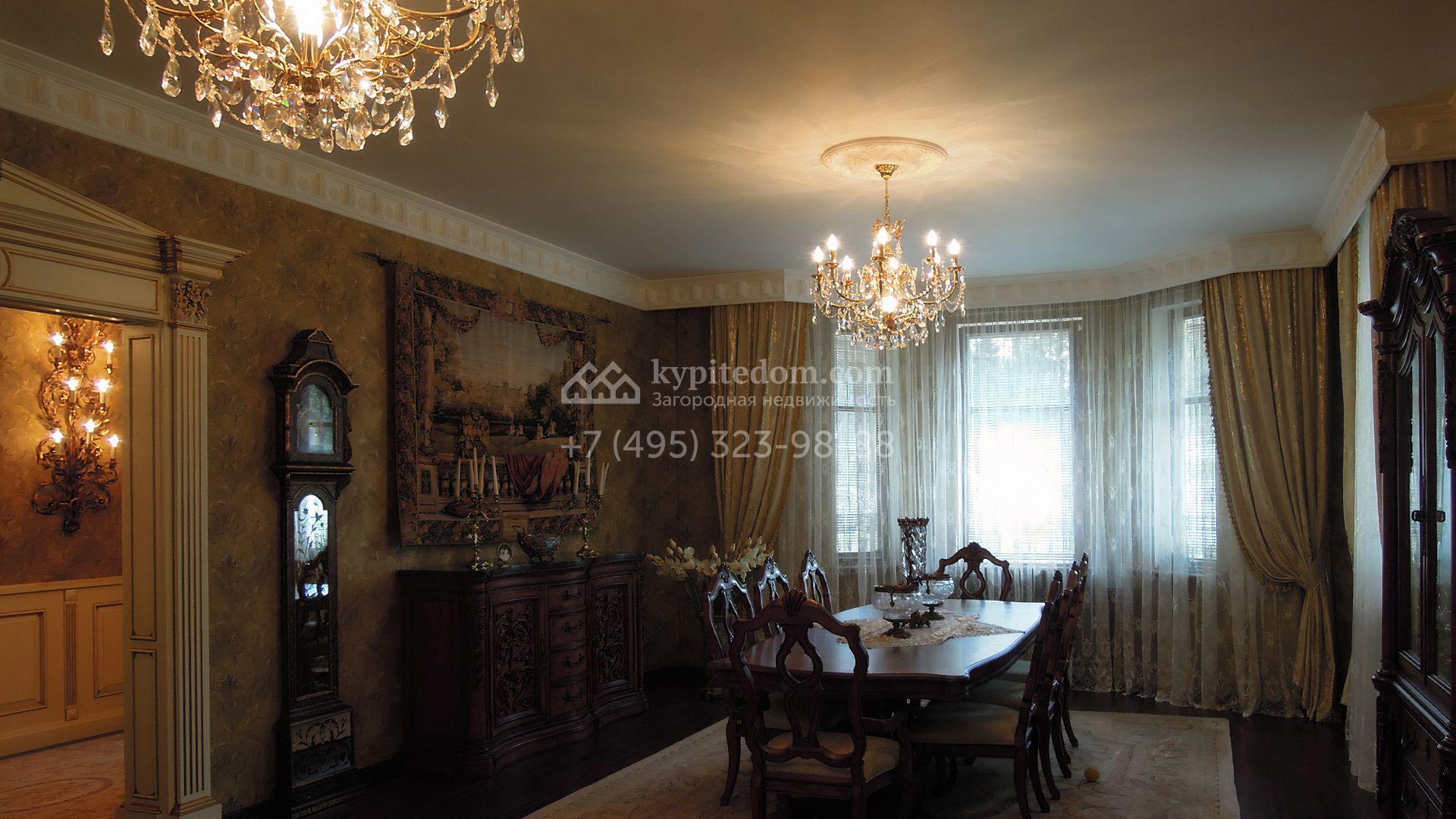 Загородная резиденция во фламандском стиле на высоком цоколе расположен на лесном участке 20 соток. Фасад резиденции 377 м² облицован штукатуркой и камнем, украшен цветными деревянными балками, резьбой, наличниками. Интерьер дома выдержали в классическом стиле в светлых тонах. Мебель выполнена из массива, установлена кухня и сантехника. В доме разместили 3 спальни, гостиную с камином, бильярдную и спортивный зал. На участке выполнили ландшафтный дизайн, в тени сосен посадили газон и кустарники, построили гараж для 2 машин с квартирой для персонала и беседку-барбекю.