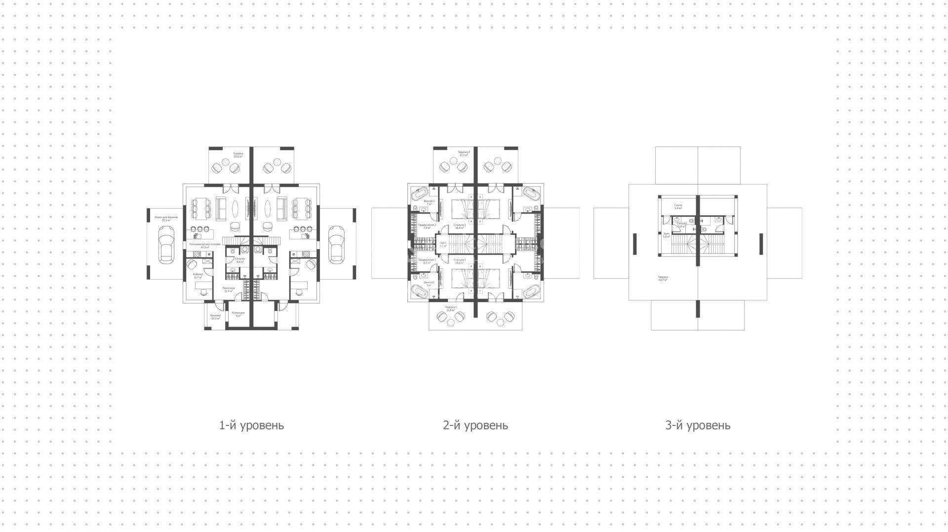 Внутри можно разместить просторную гостиную, объединенную с кухней-столовой, 6 спален и кабинет, а на террасах организовать уютные зоны для отдыха с ротанговой мебелью. Также в контуре дома предусмотрен удобный навес для двух машин. На участке легко воплотить любые ландшафтные решения — засеять газон, высадить туи по периметру для уединения, выложить аккуратные дорожки и обустроить комфортную зону для барбекю.