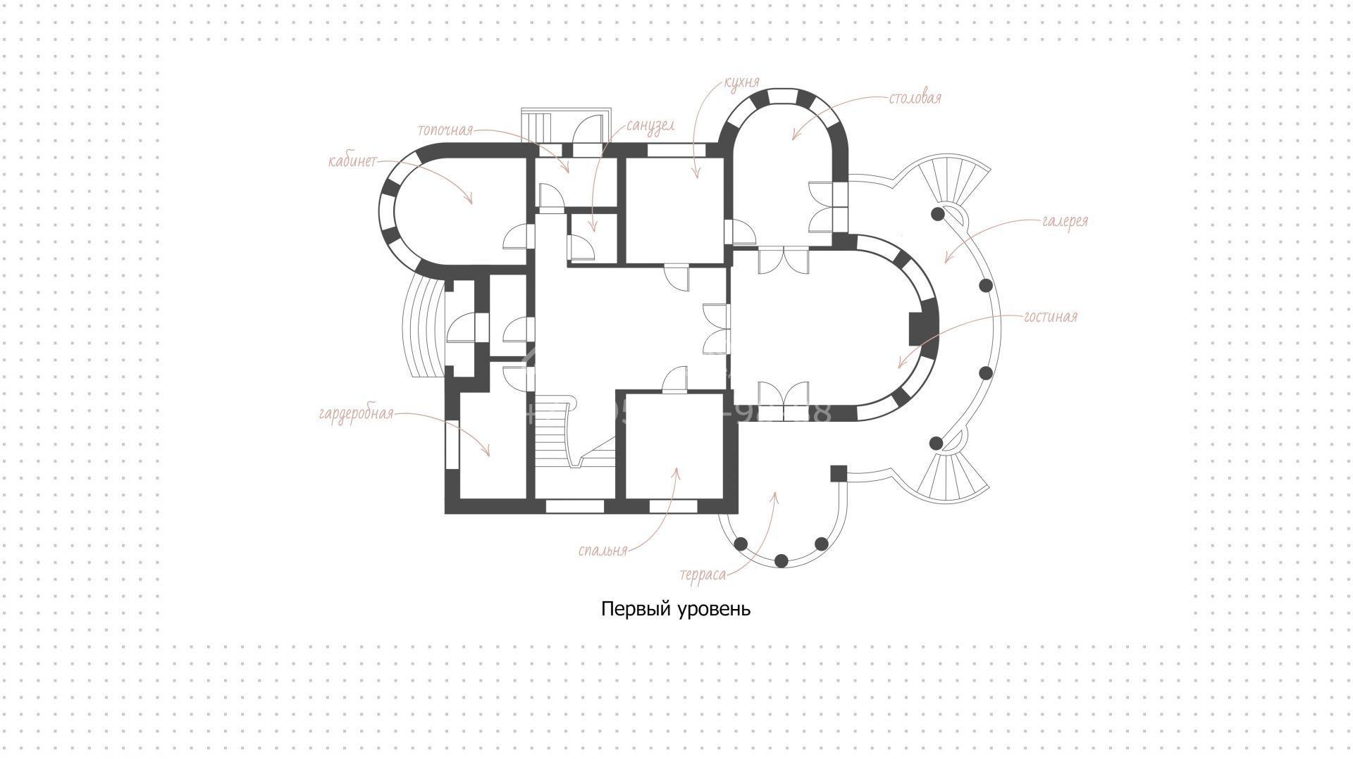 1-й уровень: тамбур, гардероб, холл, санузел, топочная, кабинет, кухня, столовая с выходом на галерею, гостиная со вторым светом, комната.