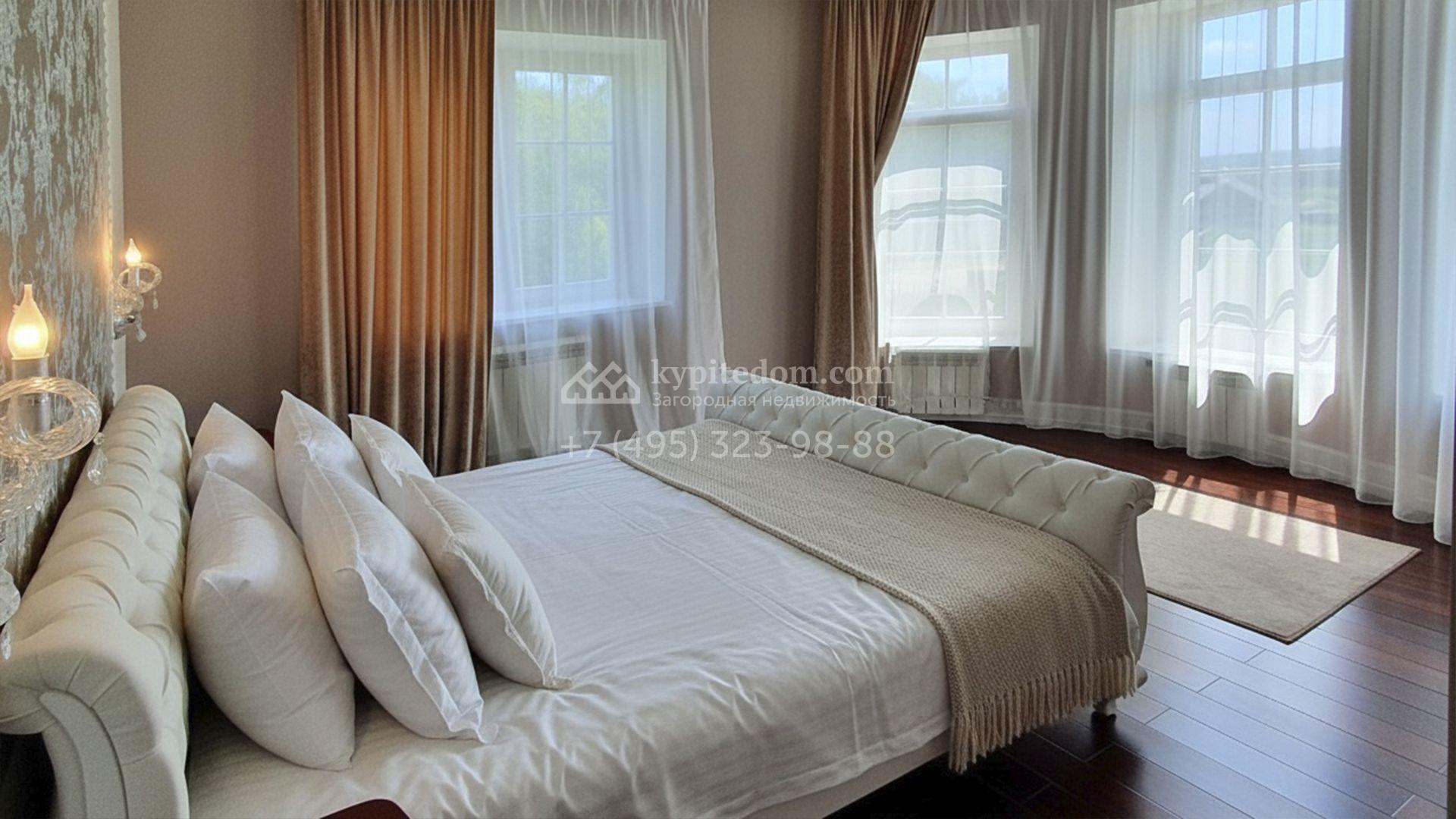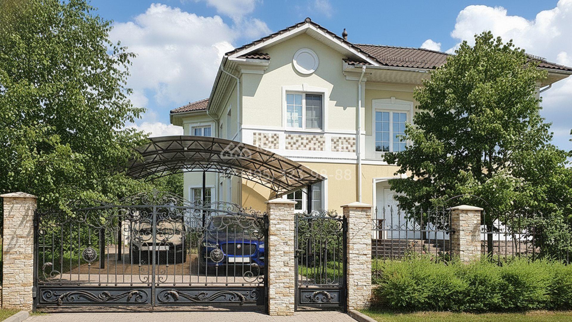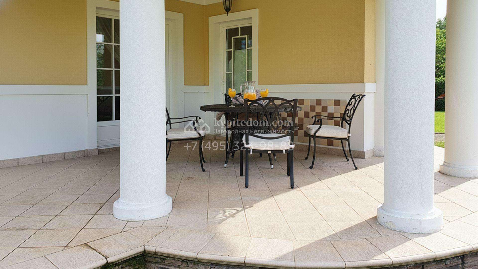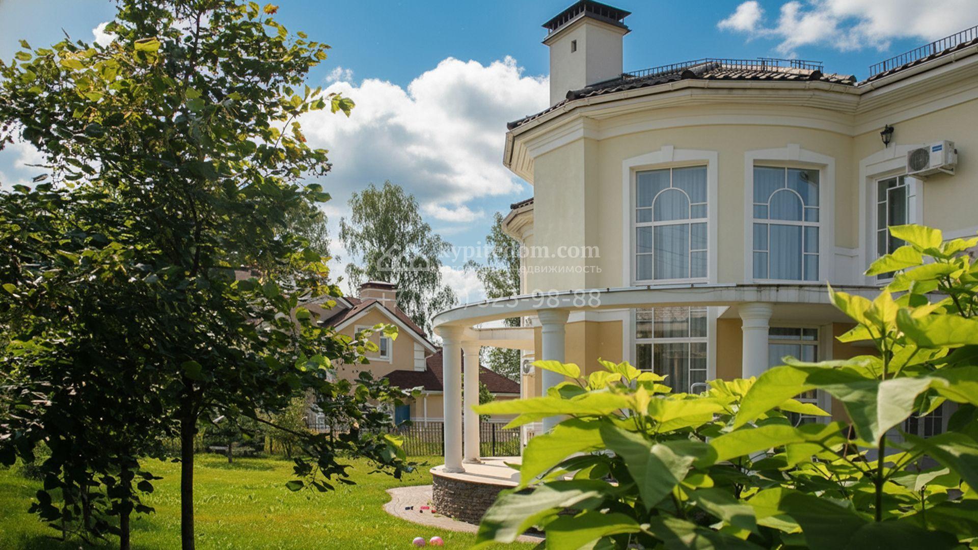 Двухэтажная резиденция площадью 365 м² расположена на участке 13 соток. Дом выдержан в итальянской традиции — с колоннами, полукруглым эркером и большим количеством остекления, а фасады оформлены белой и жёлтой штукатуркой, создавая выразительный, гармоничный облик. Интерьер выполнен в неоклассическом стиле. В отделке использованы паркетная доска, плитка с текстурой мрамора и дизайнерские обои.