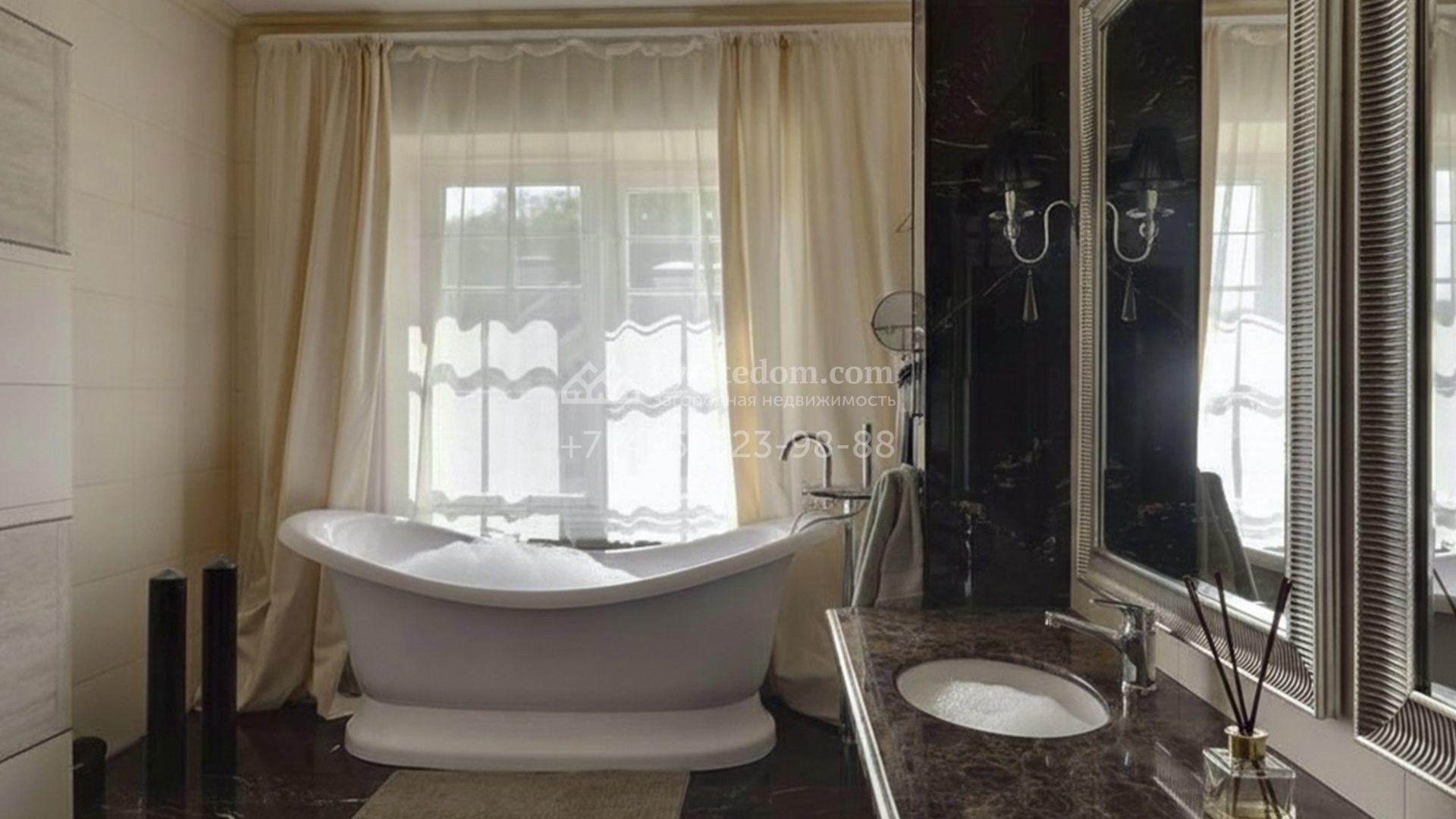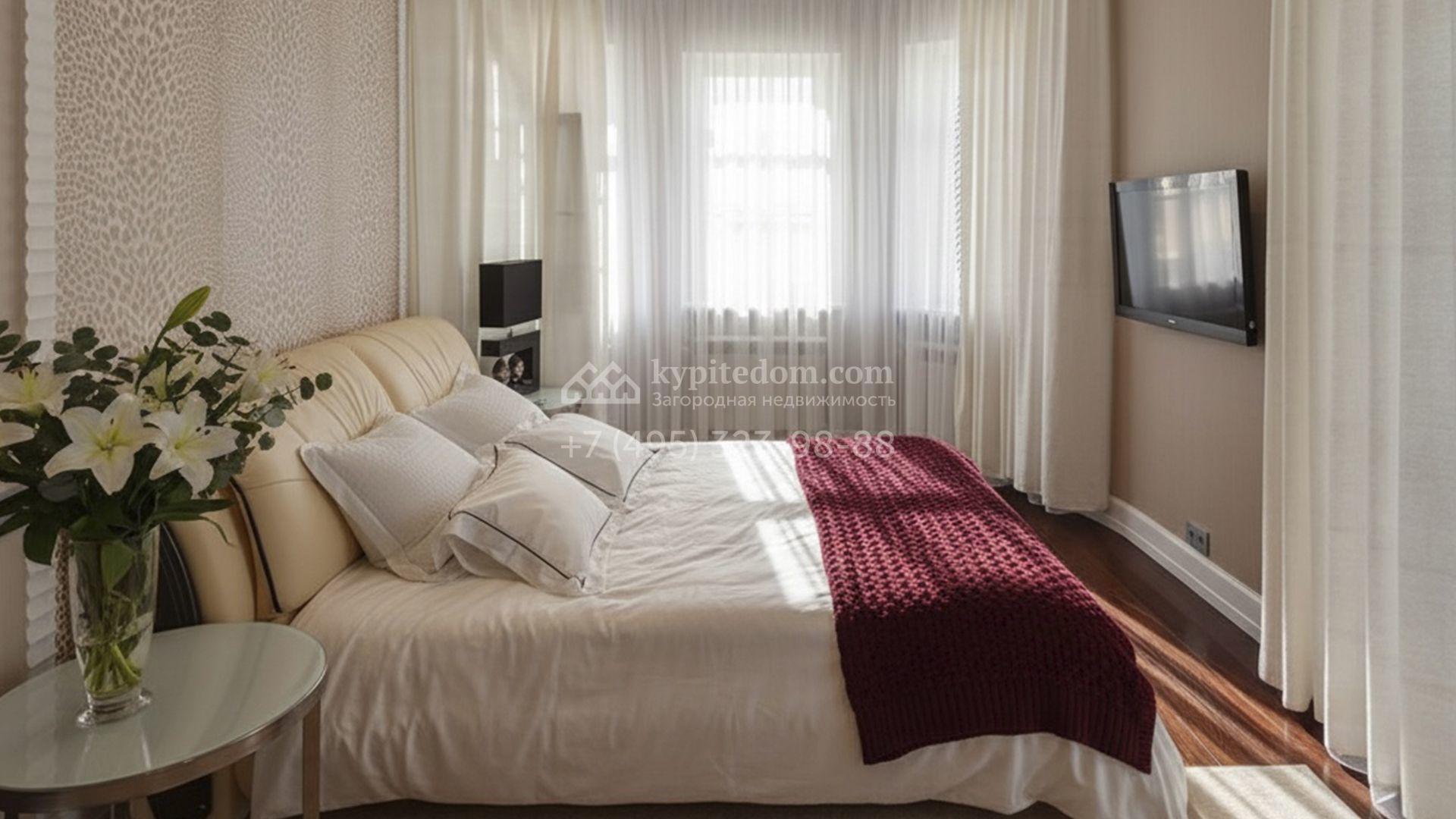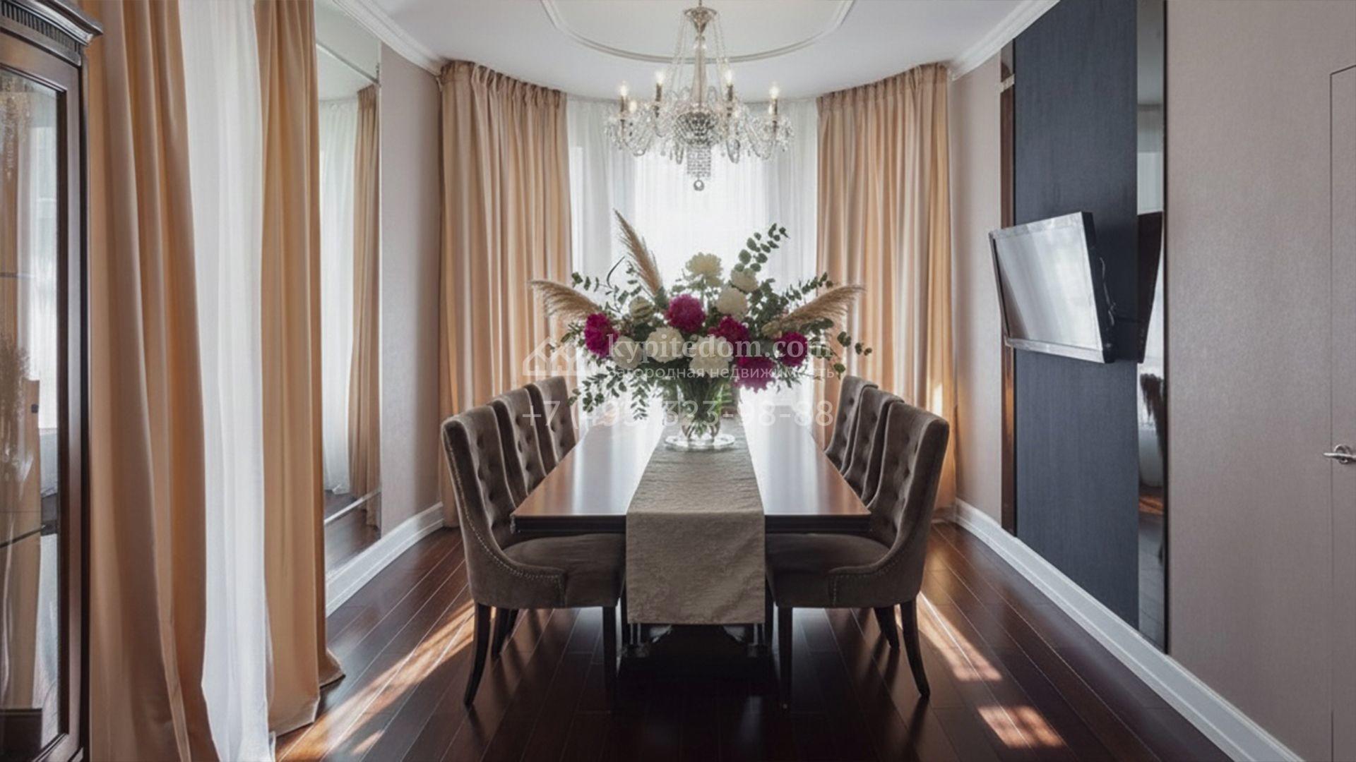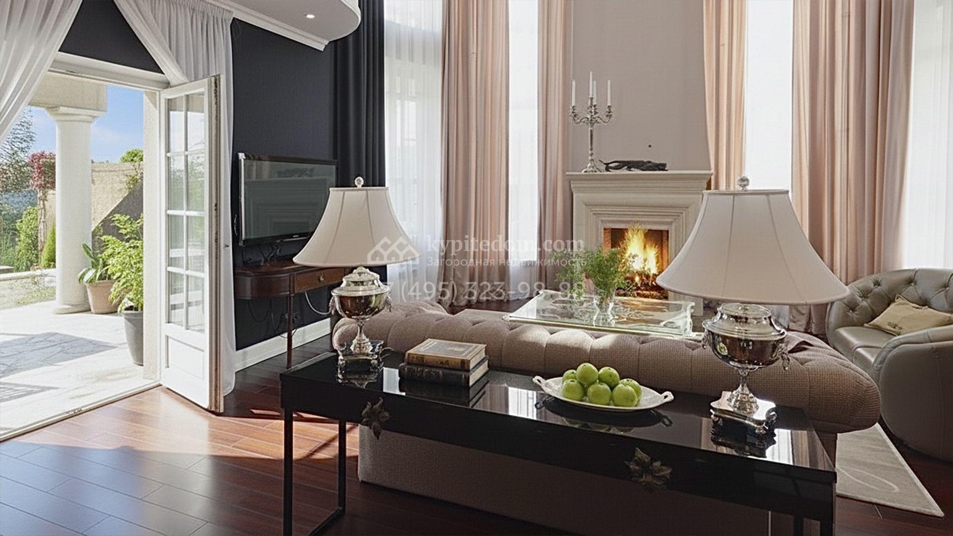 Двухэтажная резиденция площадью 365 м² расположена на участке 13 соток. Дом выдержан в итальянской традиции — с колоннами, полукруглым эркером и большим количеством остекления, а фасады оформлены белой и жёлтой штукатуркой, создавая выразительный, гармоничный облик. Интерьер выполнен в неоклассическом стиле. В отделке использованы паркетная доска, плитка с текстурой мрамора и дизайнерские обои.