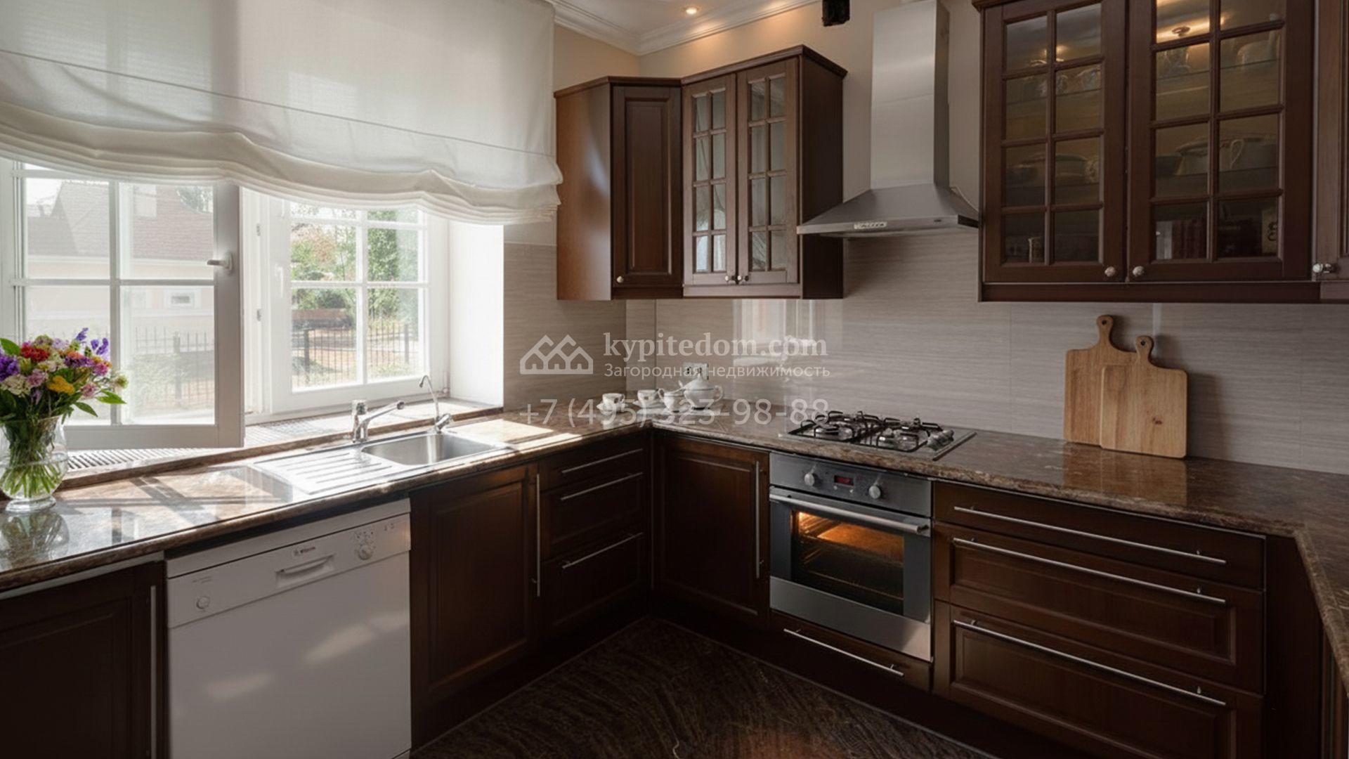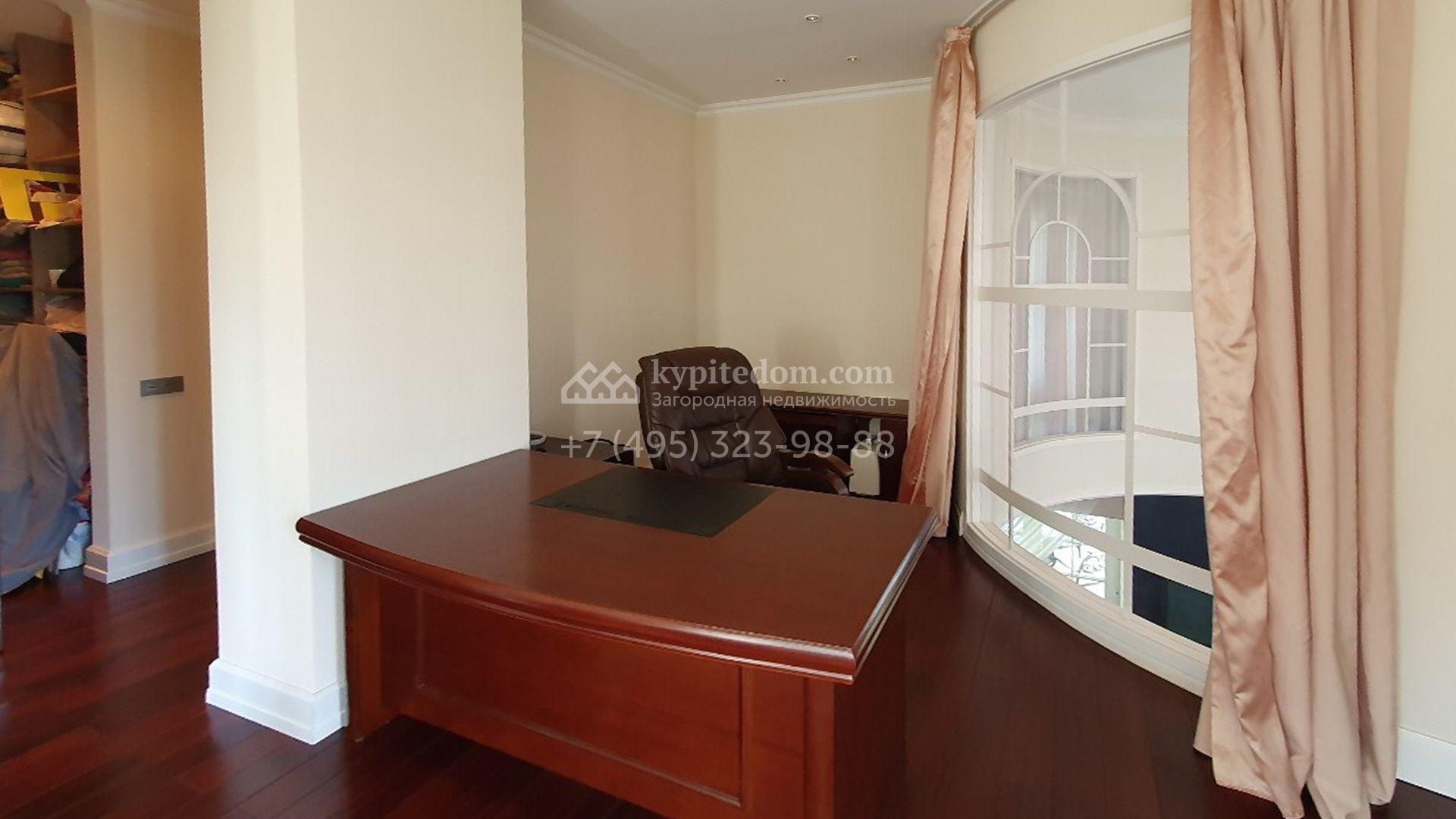 Планировка включает гостиную со вторым светом, кухню, столовую с выходом в галерею, кабинет и три спальни, каждая из которых имеет собственную гардеробную и санузел. Территория благоустроена: проведён дренаж, уложен газон, высажены деревья и организованы аккуратные дорожки. В контуре дома предусмотрен навес на две машины.