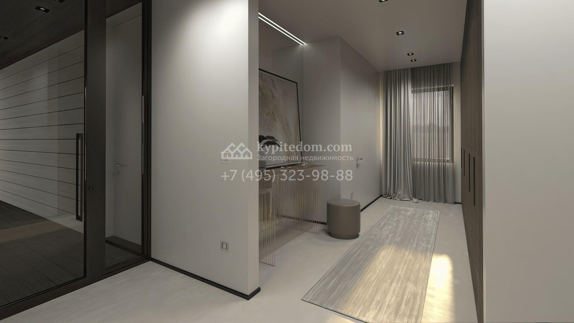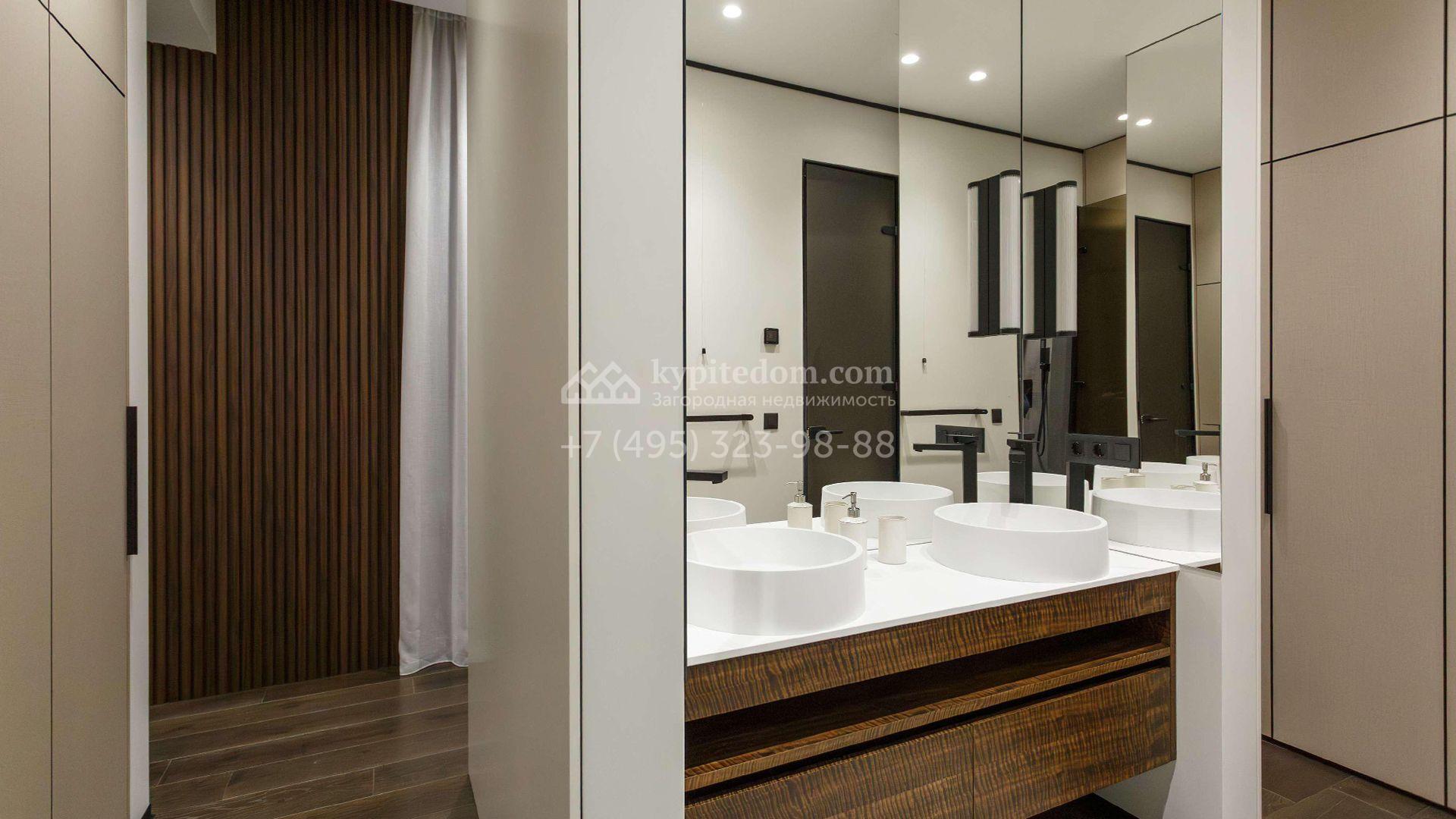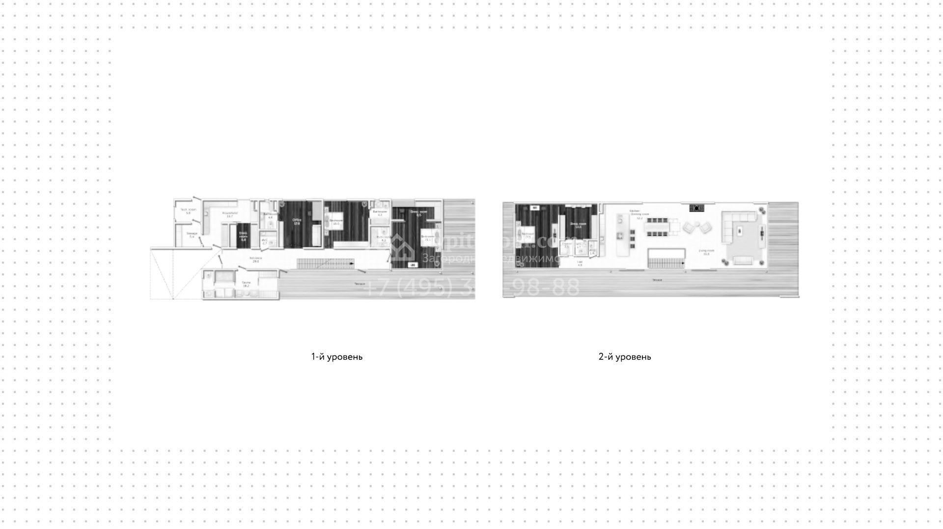 1-й уровень: спальня с санузлом, гардеробной и выходом на террасу, спальня с санузлом, кабинет с санузлом, сауна, гардеробная, постирочная, котельная.