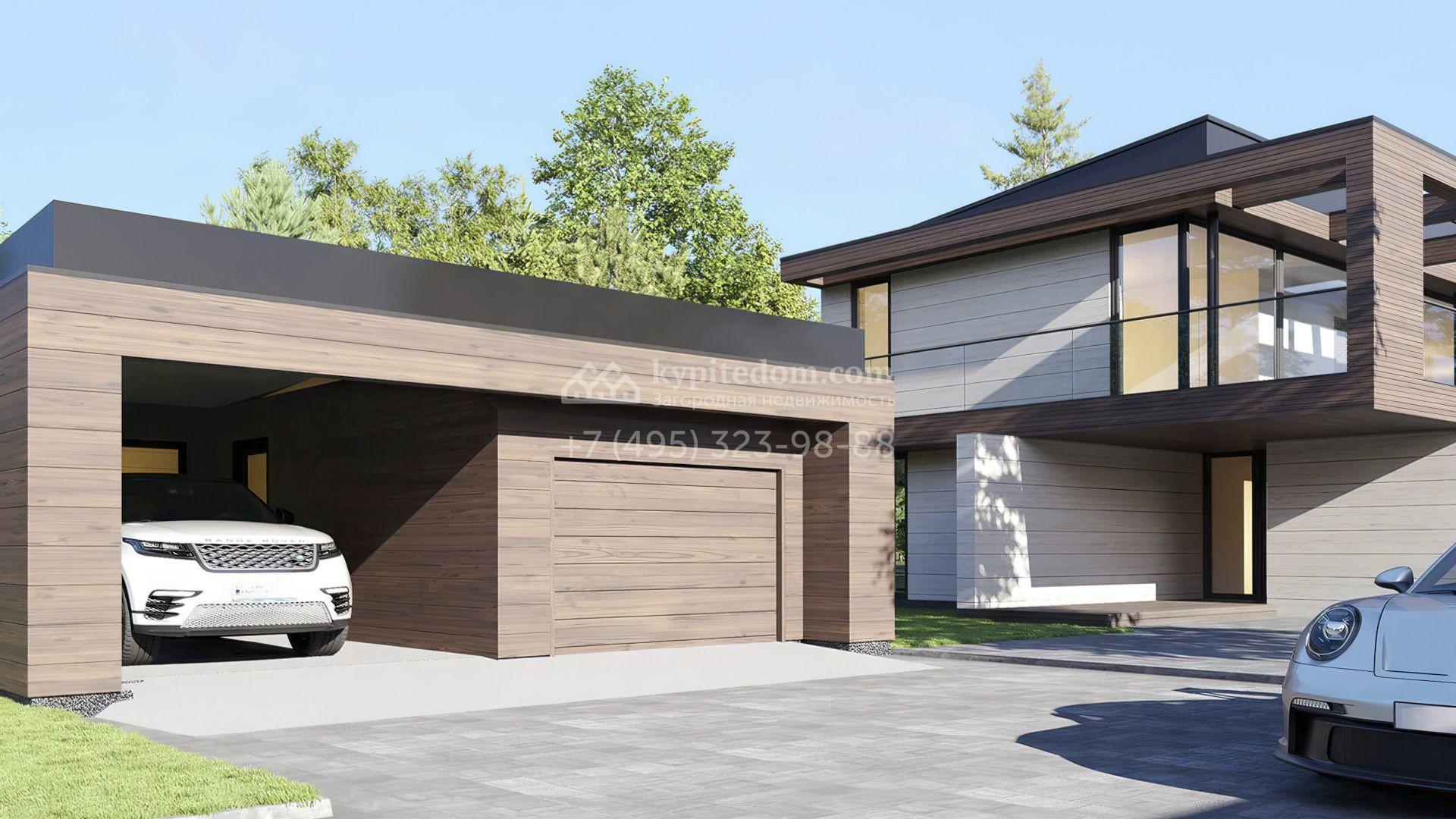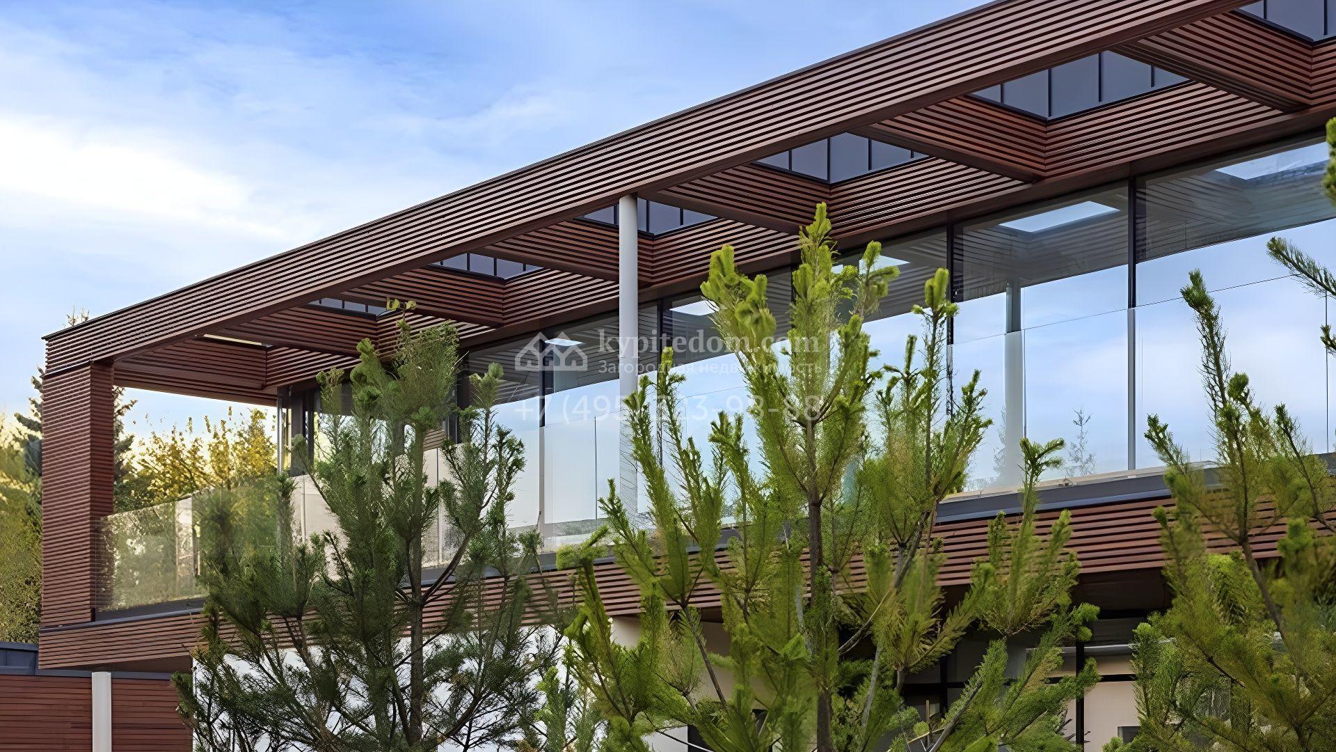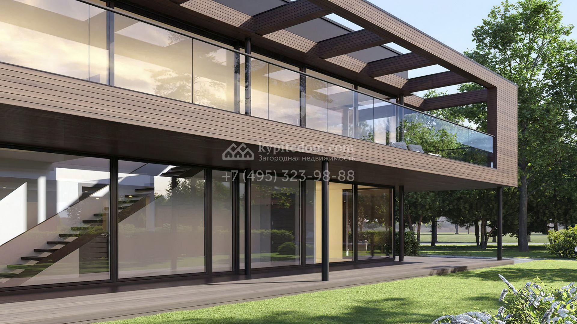 Двухэтажный дом по проекту Mantyla площадь 642 м² расположен на полевом участке 12 соток. Дом из каменных термоблоков построен по проекту финского архитектора Seppo Mantyla. Фасад здания отличается деревянной облицовкой, просторными террасами и панорамным остеклением. В доме гостиная-столовая расположена на втором этаже. Спустившись, можно попасть в приватную зону со спальнями хозяев и кабинетом. Интерьер выполнен в эстетике минимализма.