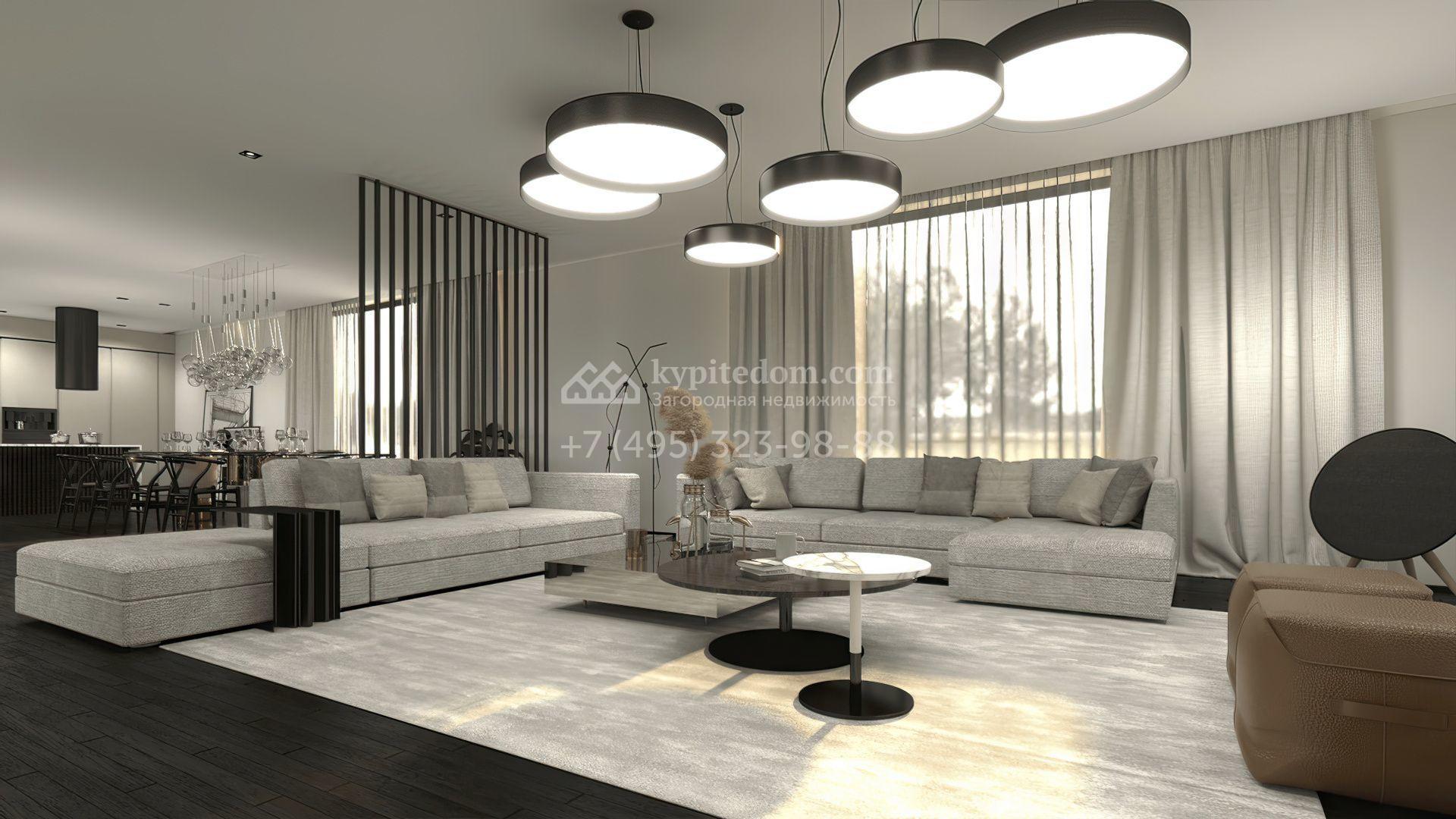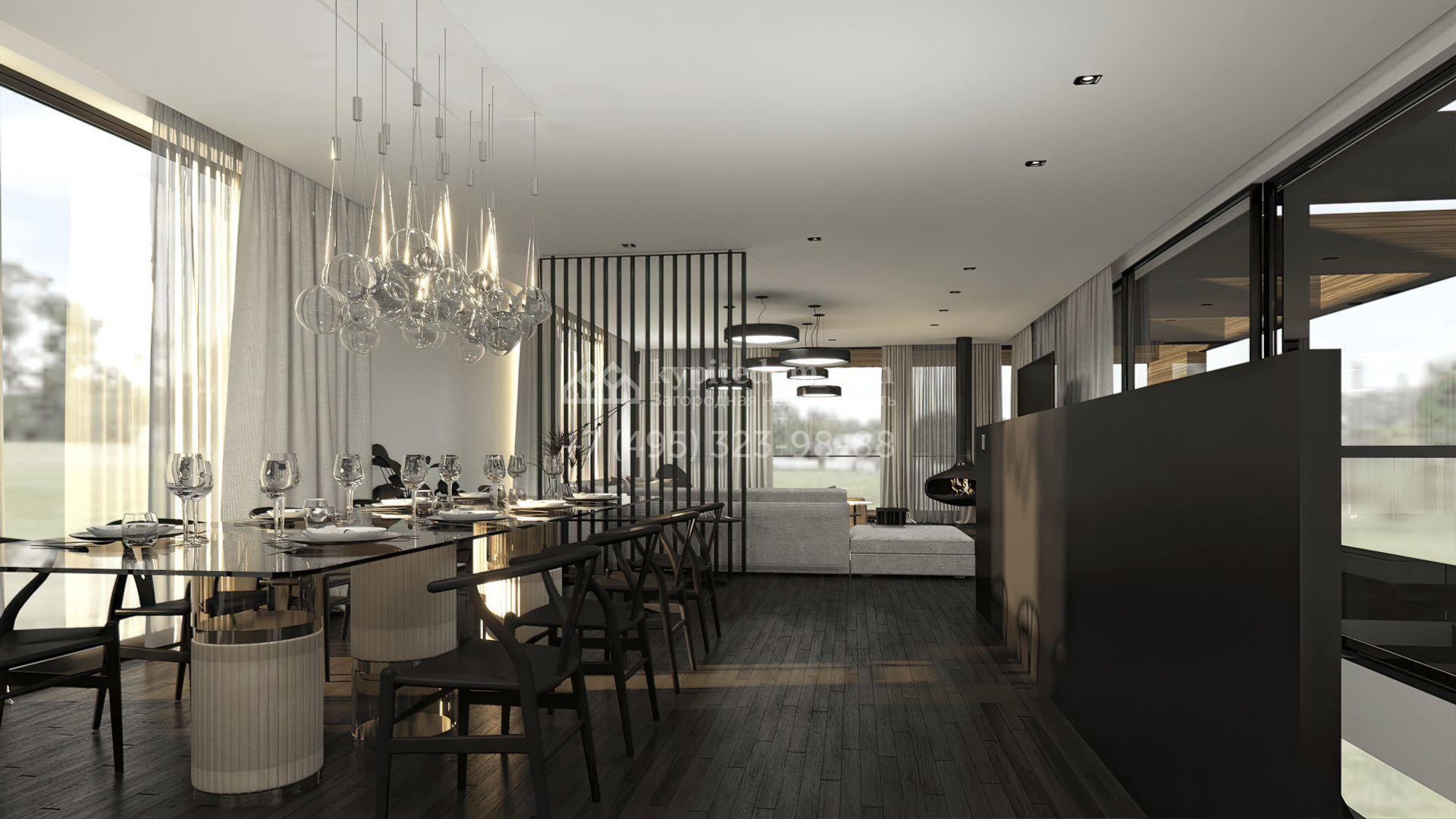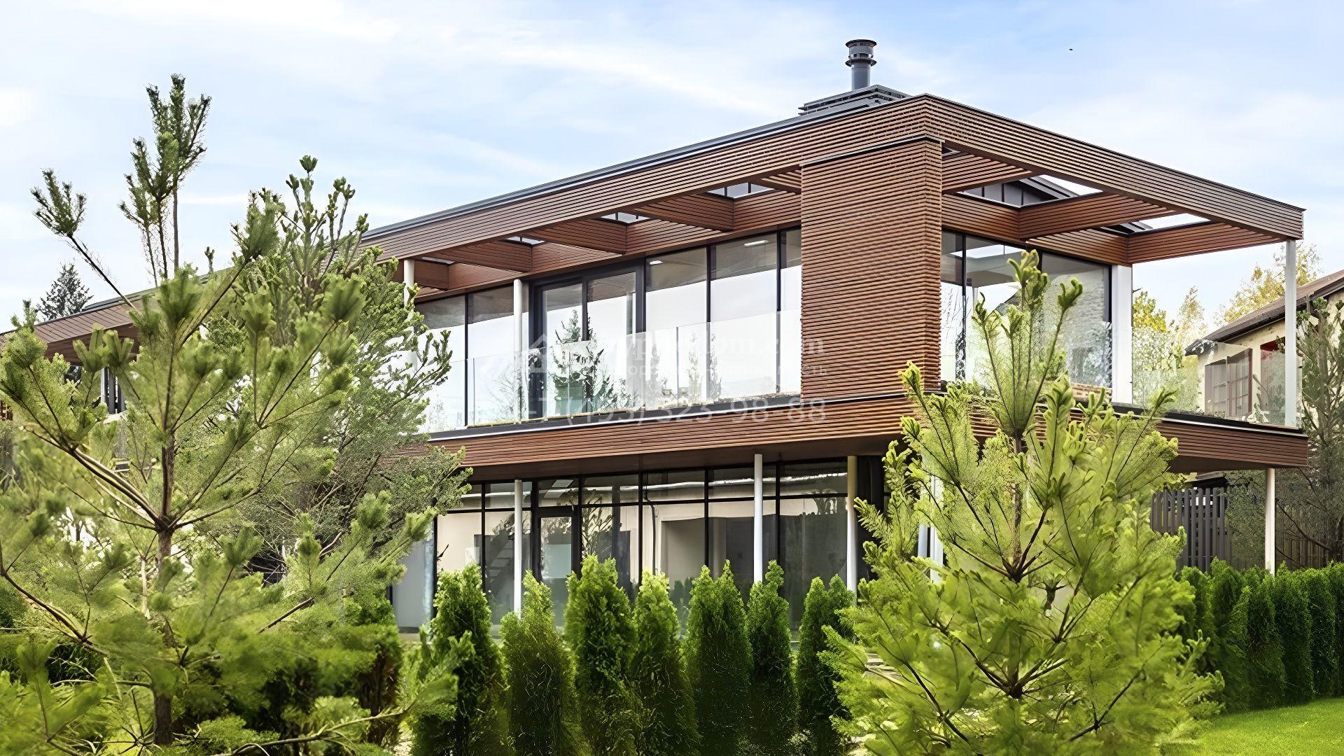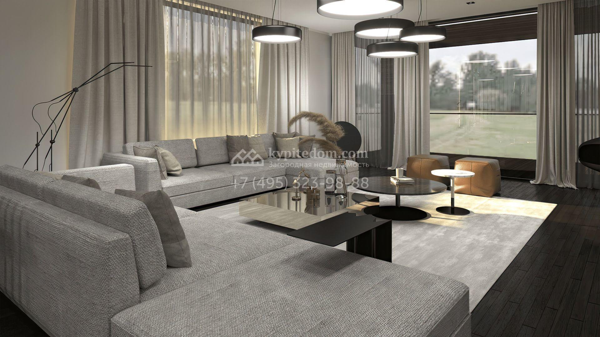 Двухэтажный дом по проекту Mantyla площадь 642 м² расположен на полевом участке 12 соток. Дом из каменных термоблоков построен по проекту финского архитектора Seppo Mantyla. Фасад здания отличается деревянной облицовкой, просторными террасами и панорамным остеклением. В доме гостиная-столовая расположена на втором этаже. Спустившись, можно попасть в приватную зону со спальнями хозяев и кабинетом. Интерьер выполнен в эстетике минимализма.
