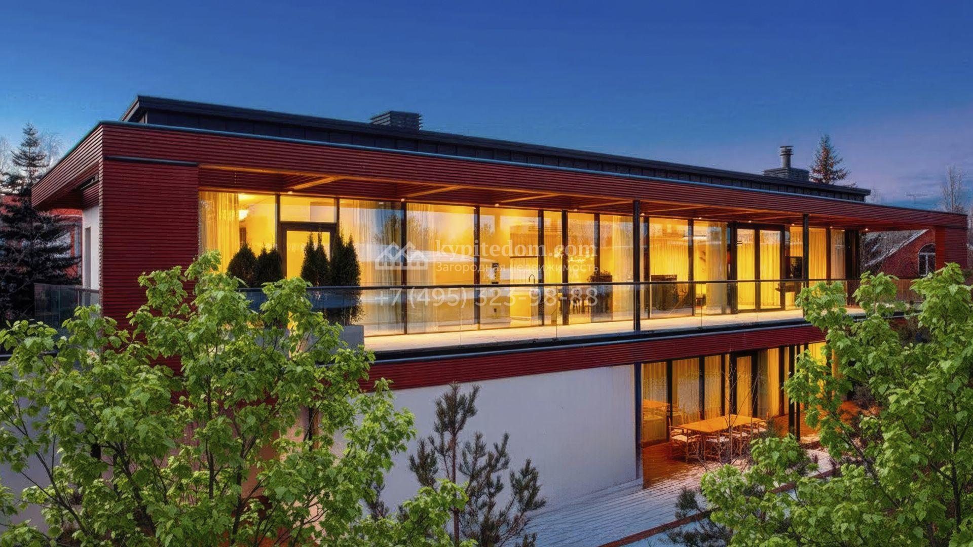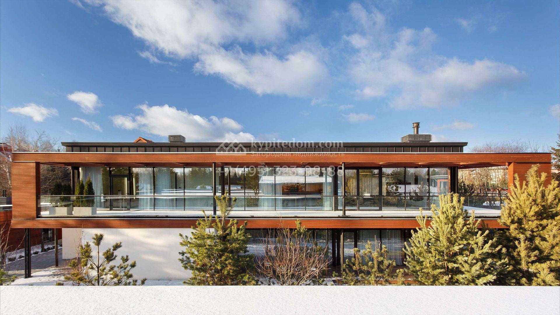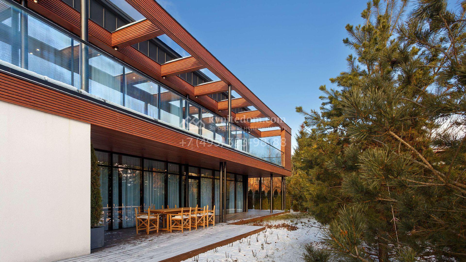 Двухэтажный дом по проекту Mantyla площадь 488 м² расположен на полевом участке 12 соток. Дом из каменных термоблоков построен по проекту финского архитектора Seppo Mantyla. Фасад здания отличается деревянной облицовкой, просторными террасами и панорамным остеклением. В доме гостиная-столовая расположена на втором этаже. Спустившись, можно попасть в приватную зону со спальнями хозяев и кабинетом. Интерьер выполнен в эстетике минимализма.