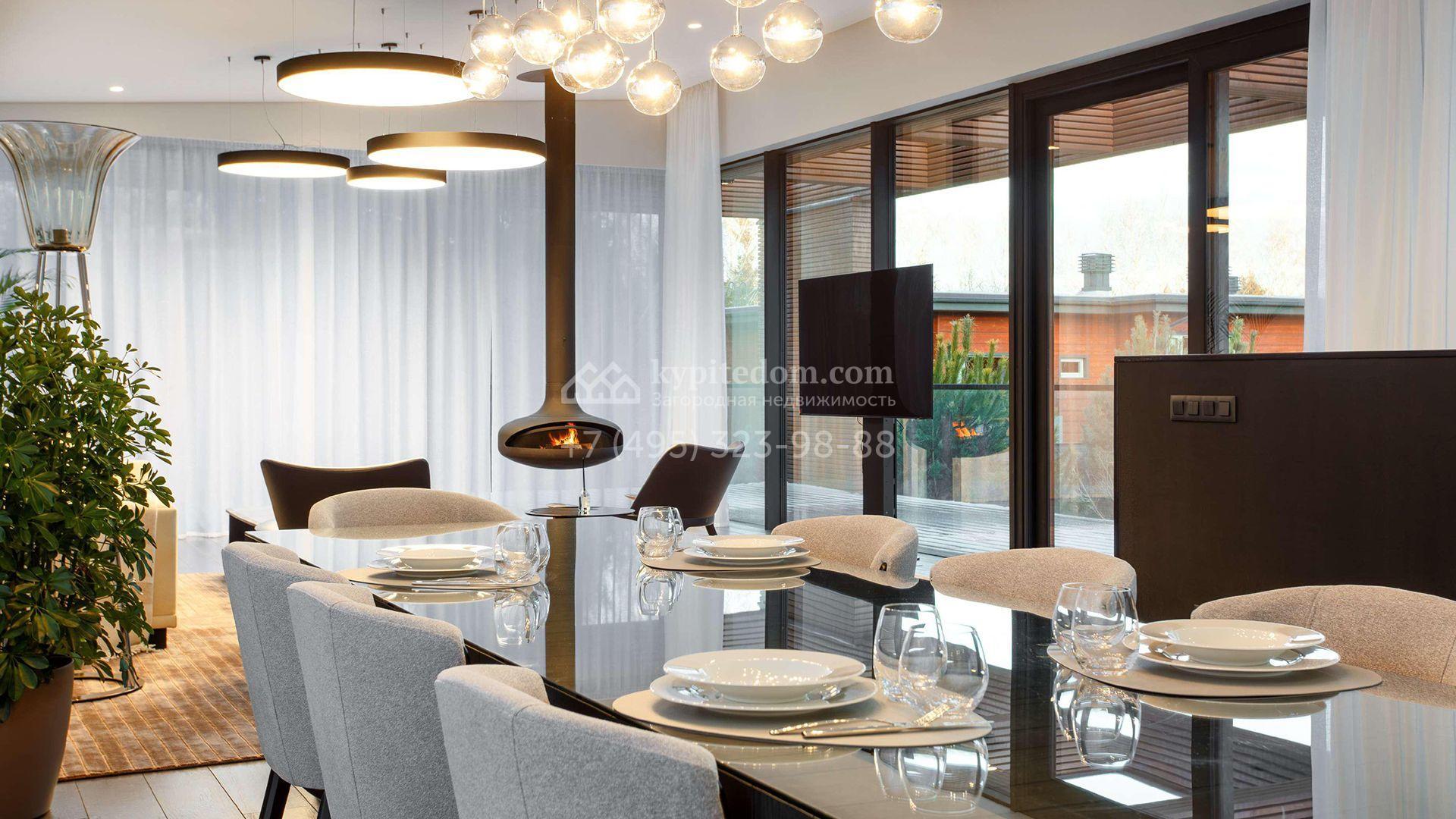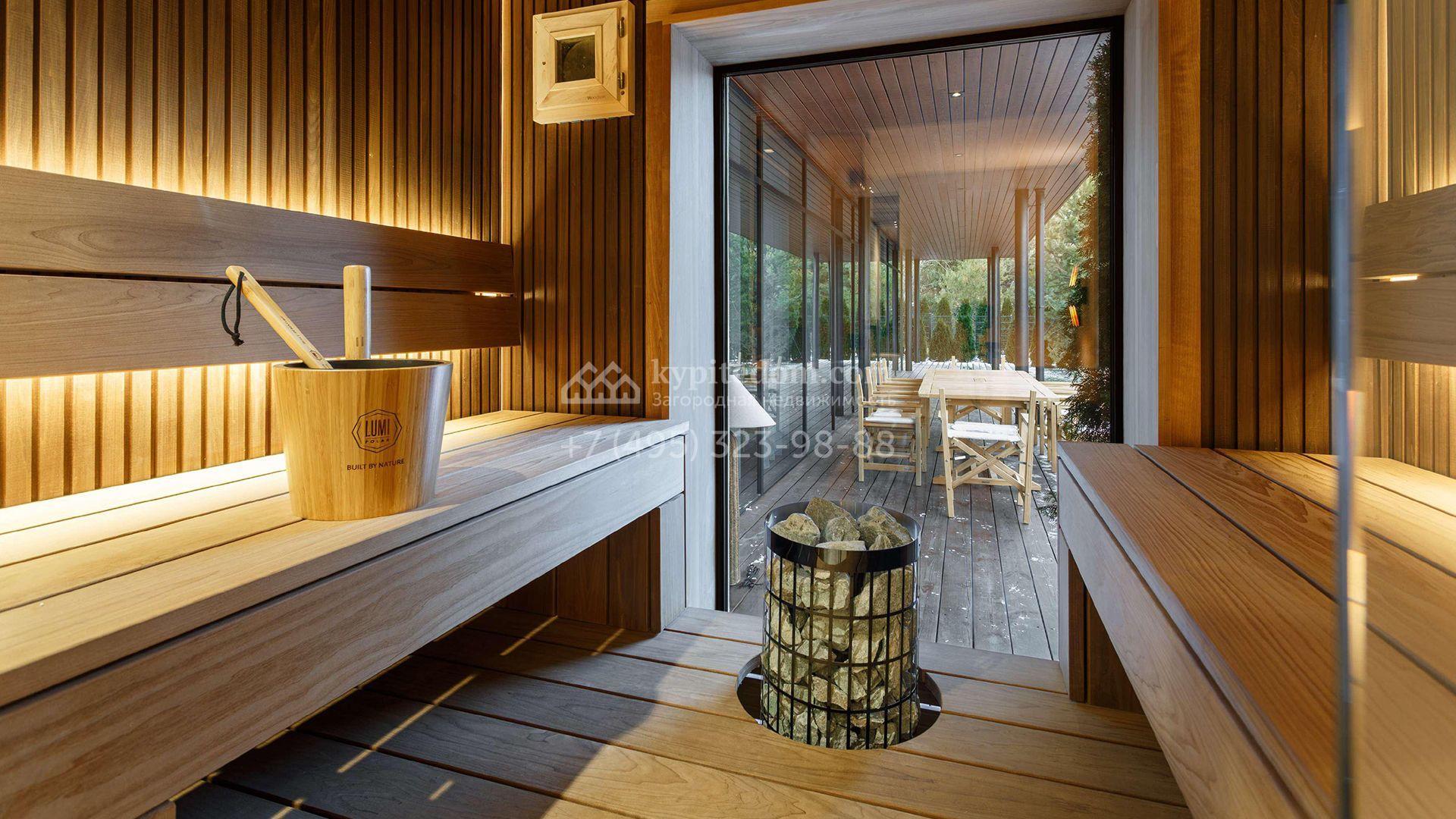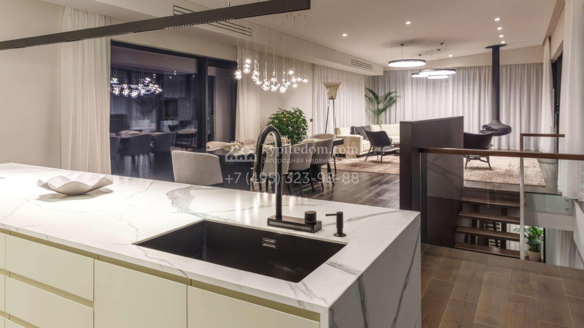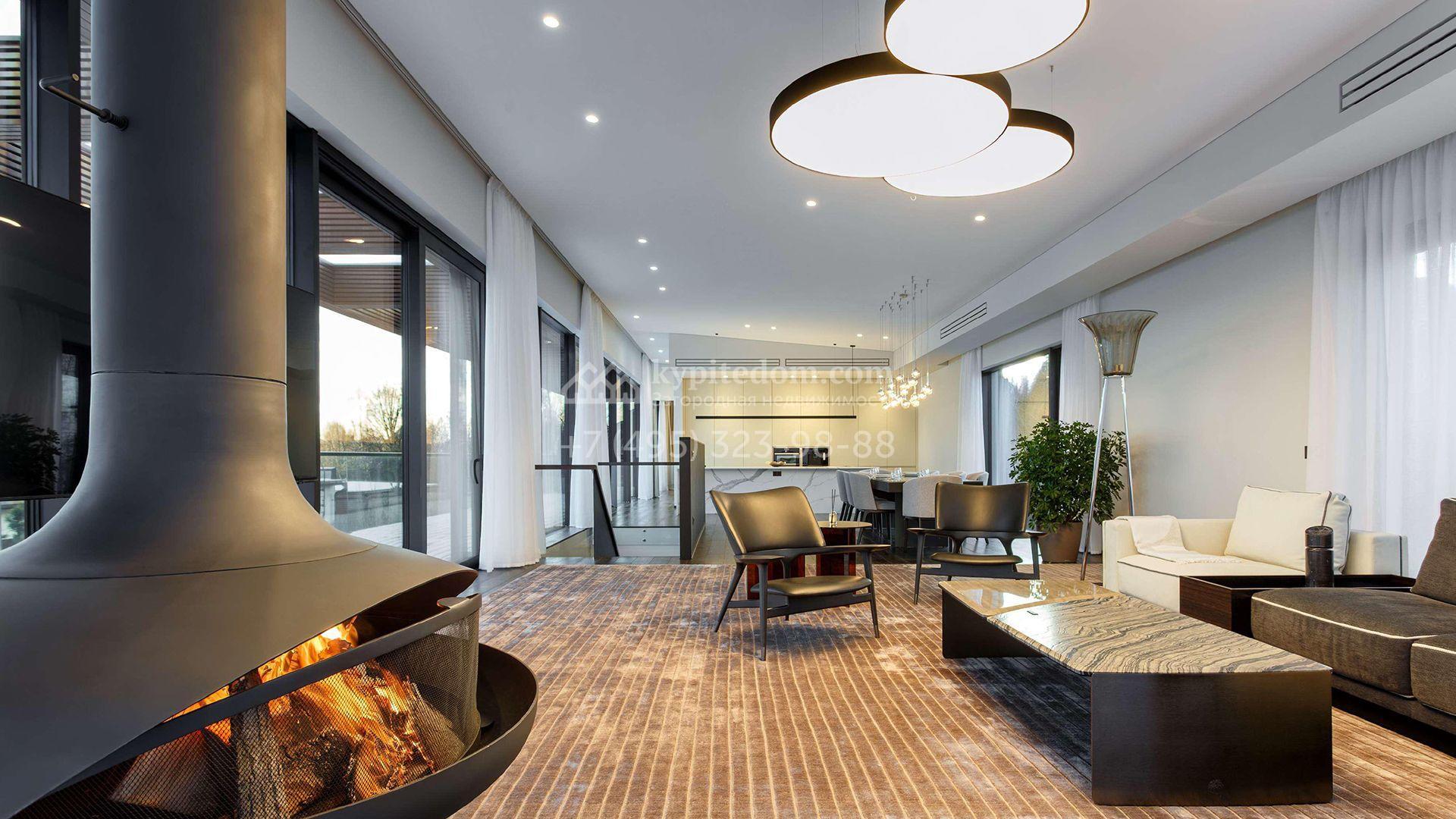 Двухэтажный дом по проекту Mantyla площадь 488 м² расположен на полевом участке 12 соток. Дом из каменных термоблоков построен по проекту финского архитектора Seppo Mantyla. Фасад здания отличается деревянной облицовкой, просторными террасами и панорамным остеклением. В доме гостиная-столовая расположена на втором этаже. Спустившись, можно попасть в приватную зону со спальнями хозяев и кабинетом. Интерьер выполнен в эстетике минимализма.