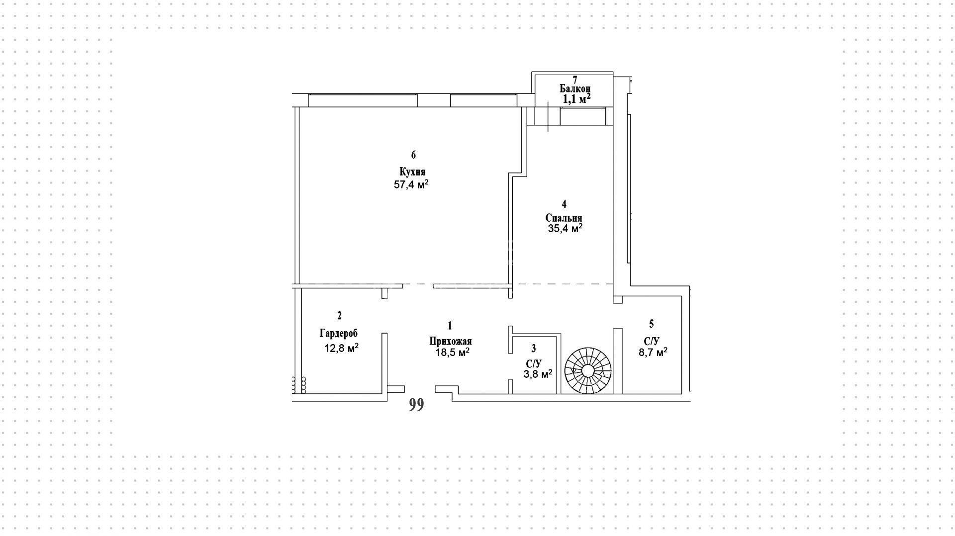 Двухуровневая квартира, общей площадью 187 м². Квартира продается без отделки, внутри просторный холл с гардеробной, гостевой санузел, большая кухня. На втором уровне — спальня с личной ванной комнатой и выходом на балкон.