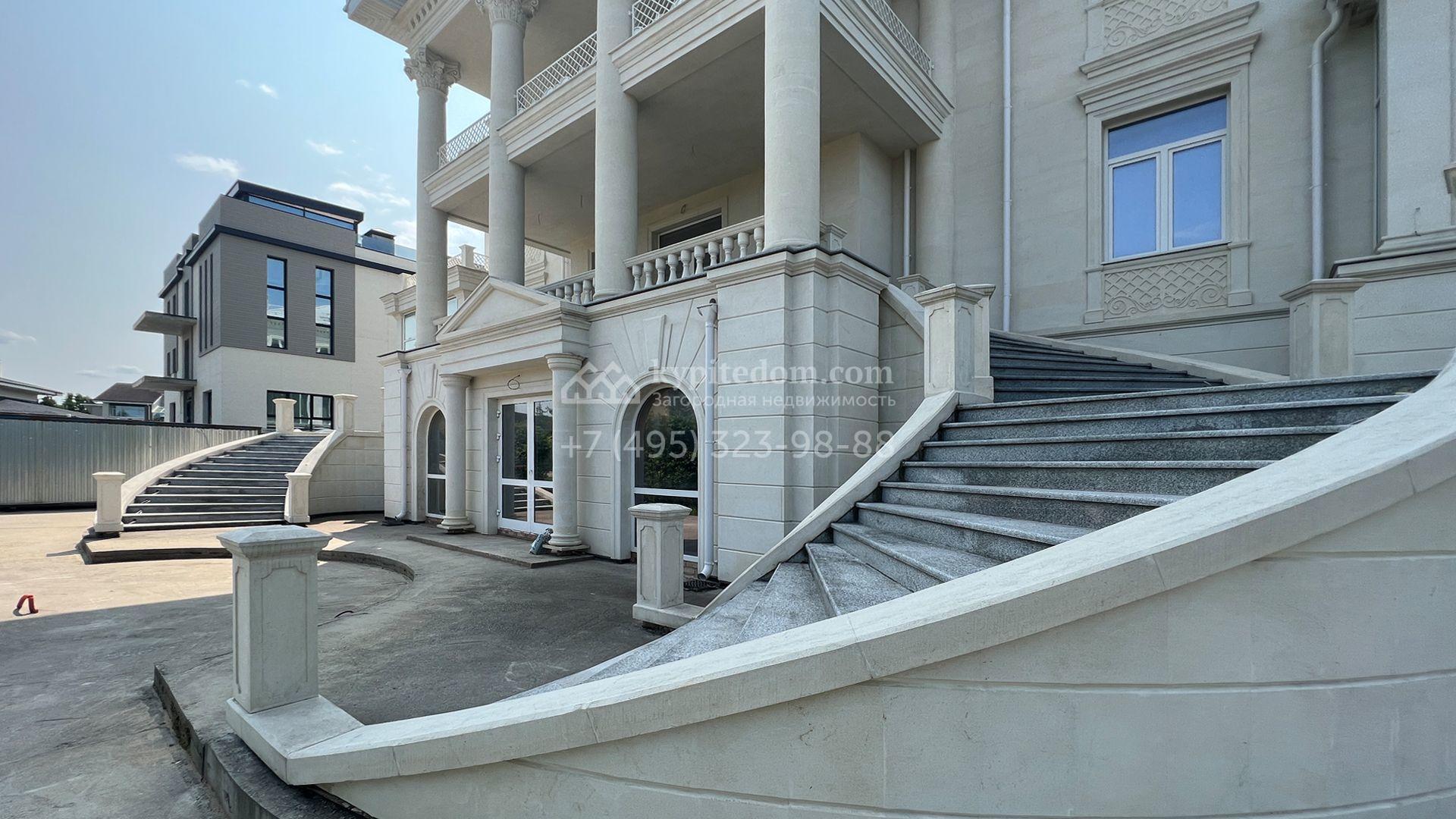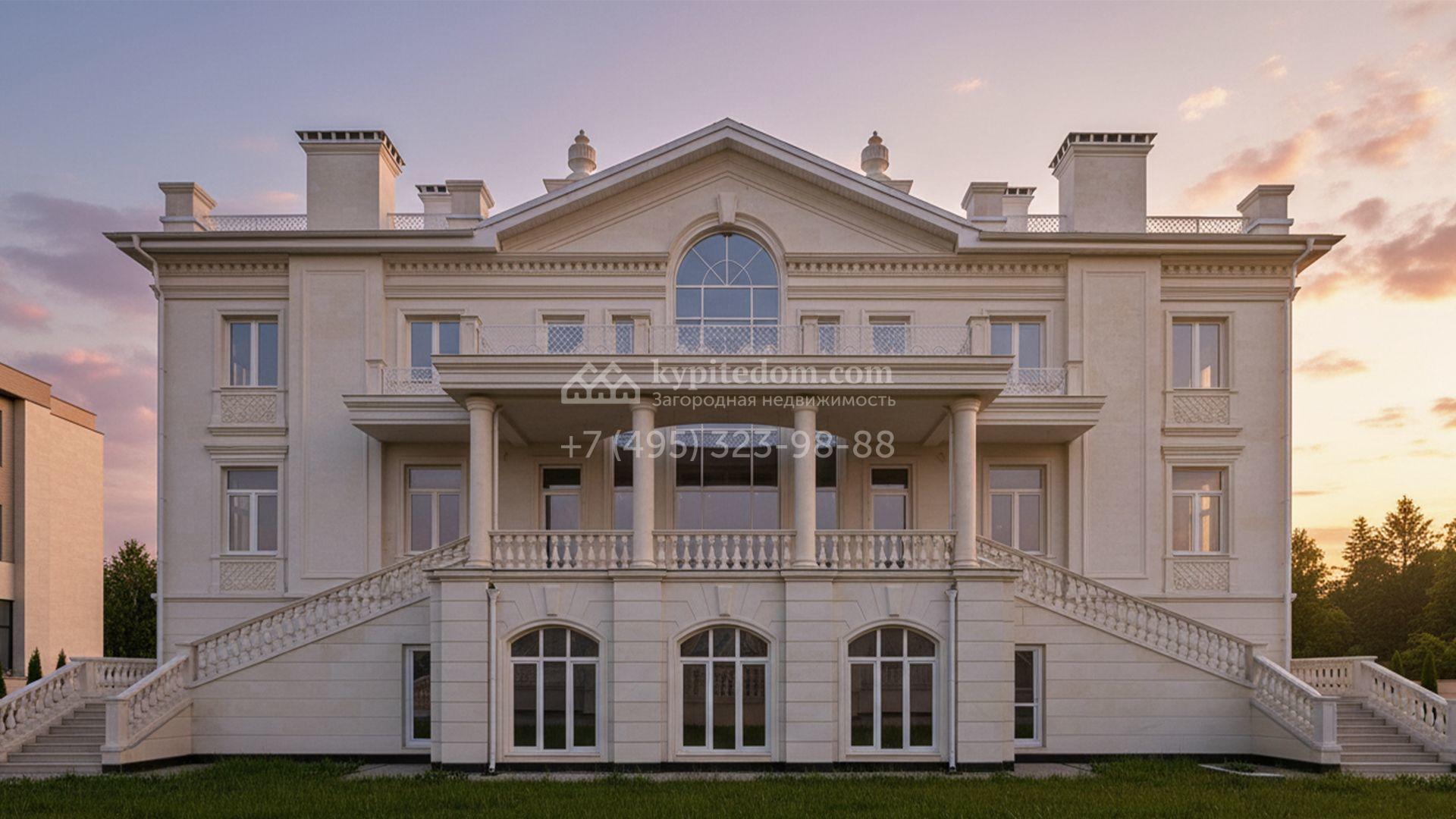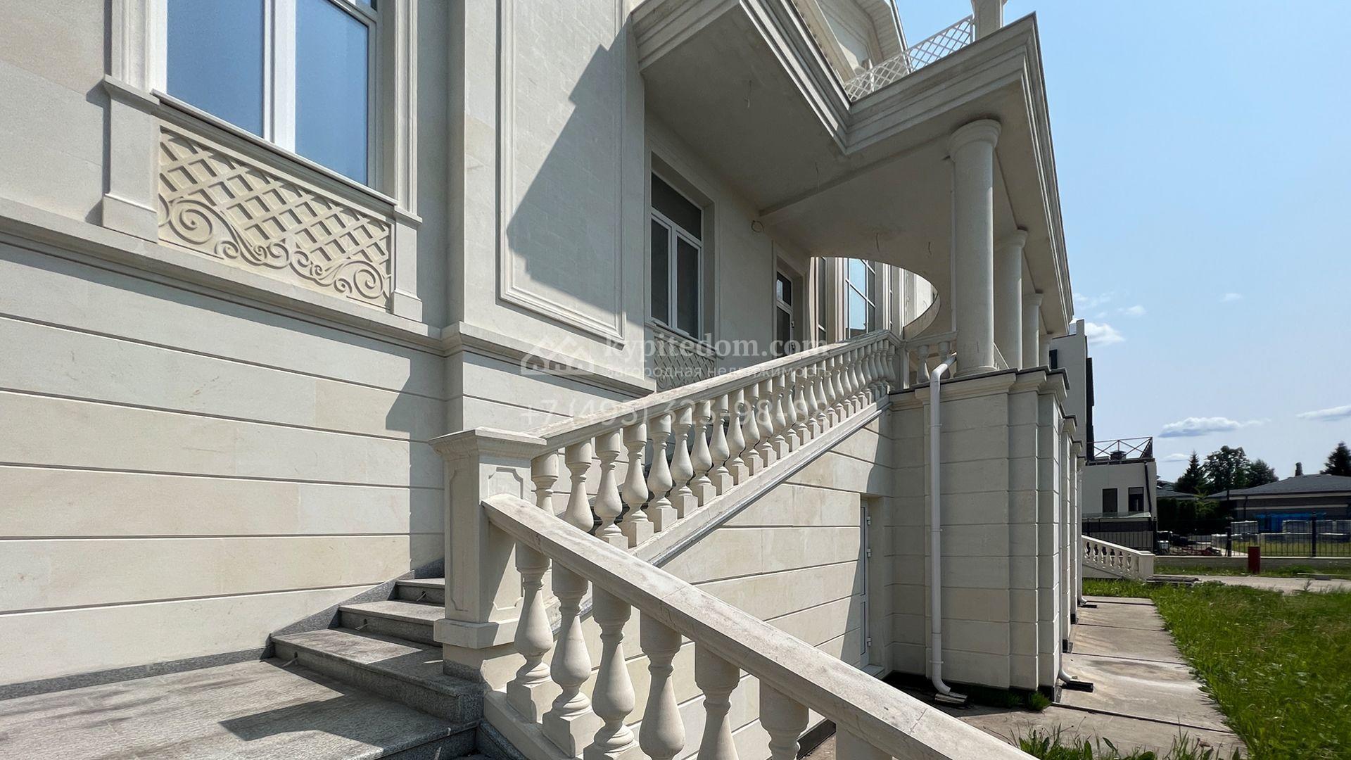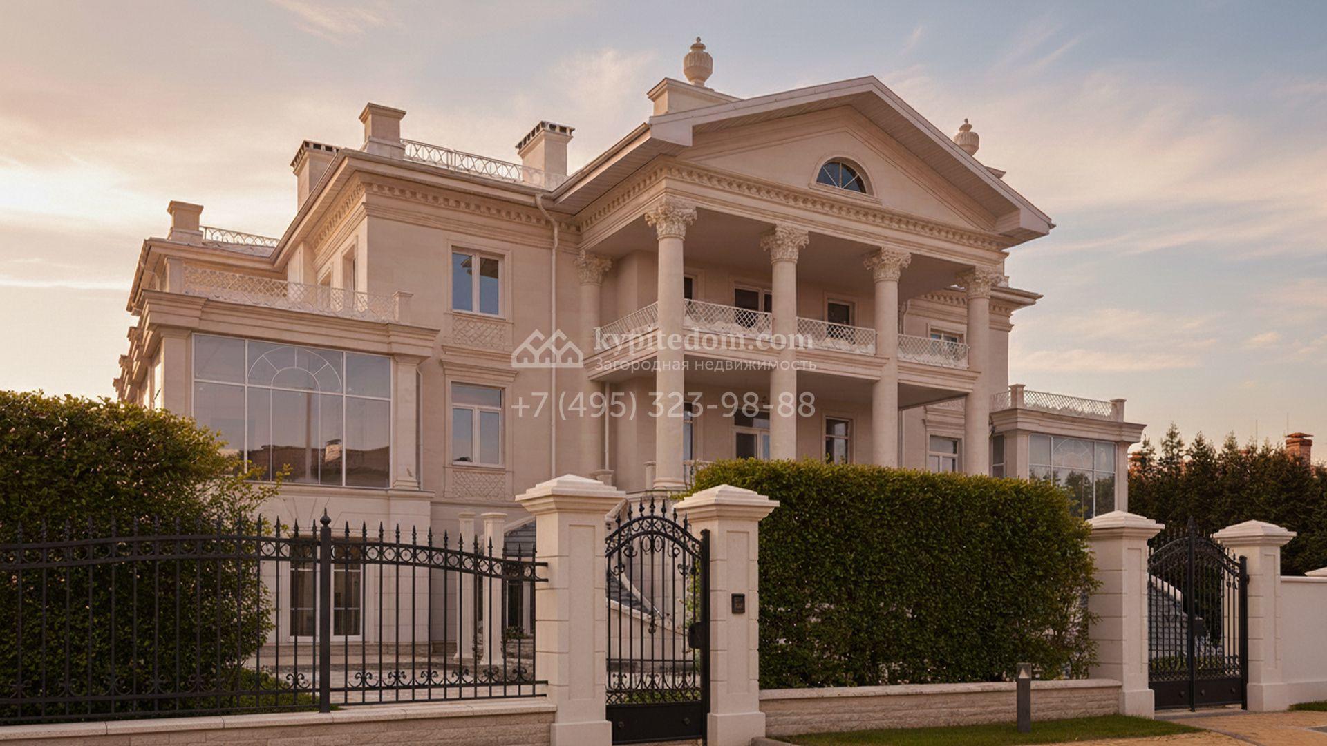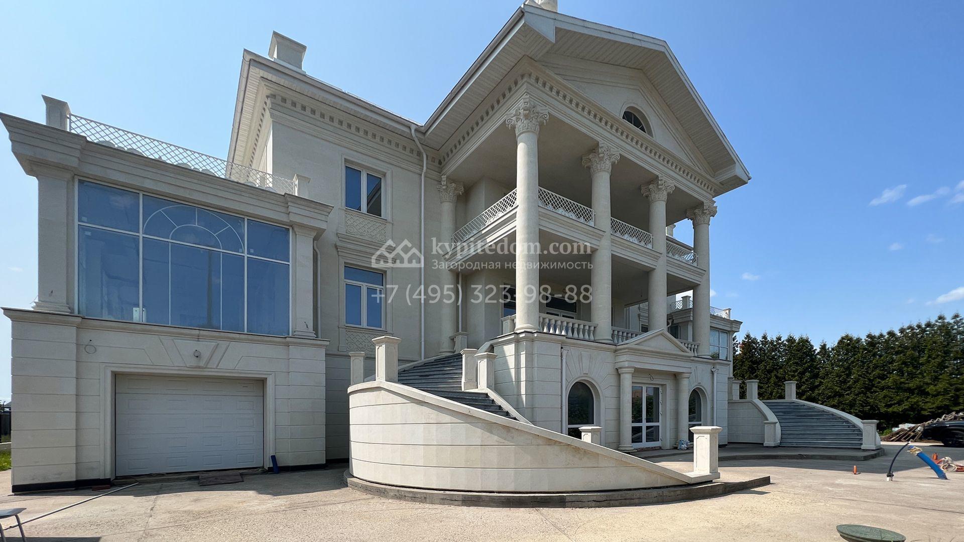 Загородный особняк площадью 1400 м² построен на полевом участке 23 сотки. Кремовый фасад здания выполнен в классическом стиле, декорирован колоннами, балясинами, рустовкой и резными элементами. Коттедж без отделки позволяет реализовать индивидуальный дизайн-проект. Планировкой дома предусмотрены семь спален, каминная, столовая-гостиная с большим аквариумом, кухня, кабинет с выходом в зимний сад, тренажёрный зал, зона отдыха, хаммамы и русская баня. В контуре дома расположены блок для персонала и два гаража. Резиденция оборудована системой «умный дом». Перед входной группой произведены работы для установки фонтана.