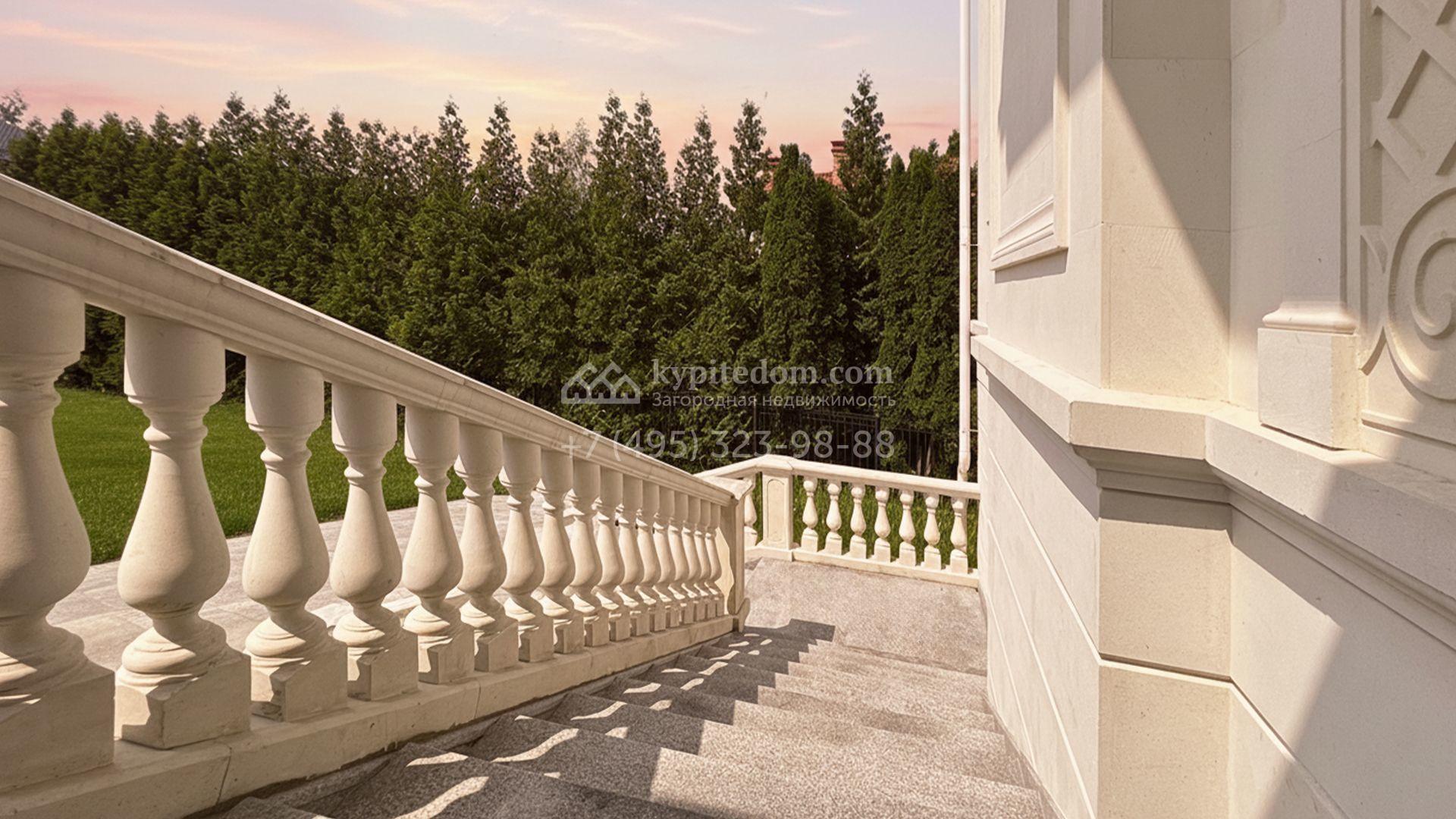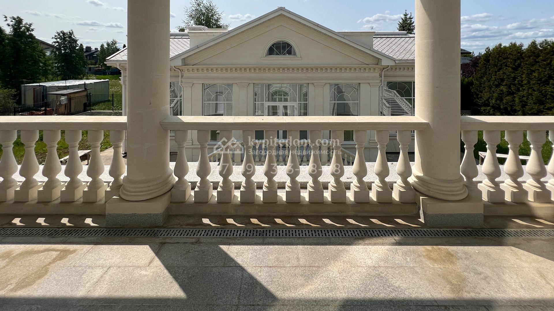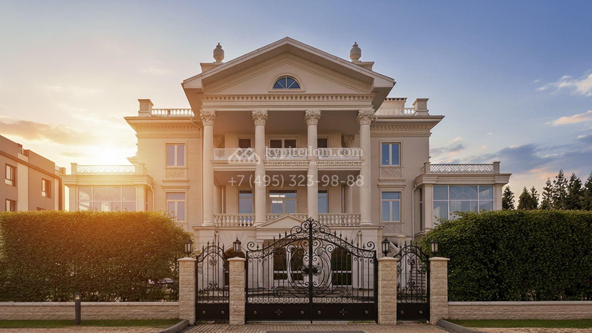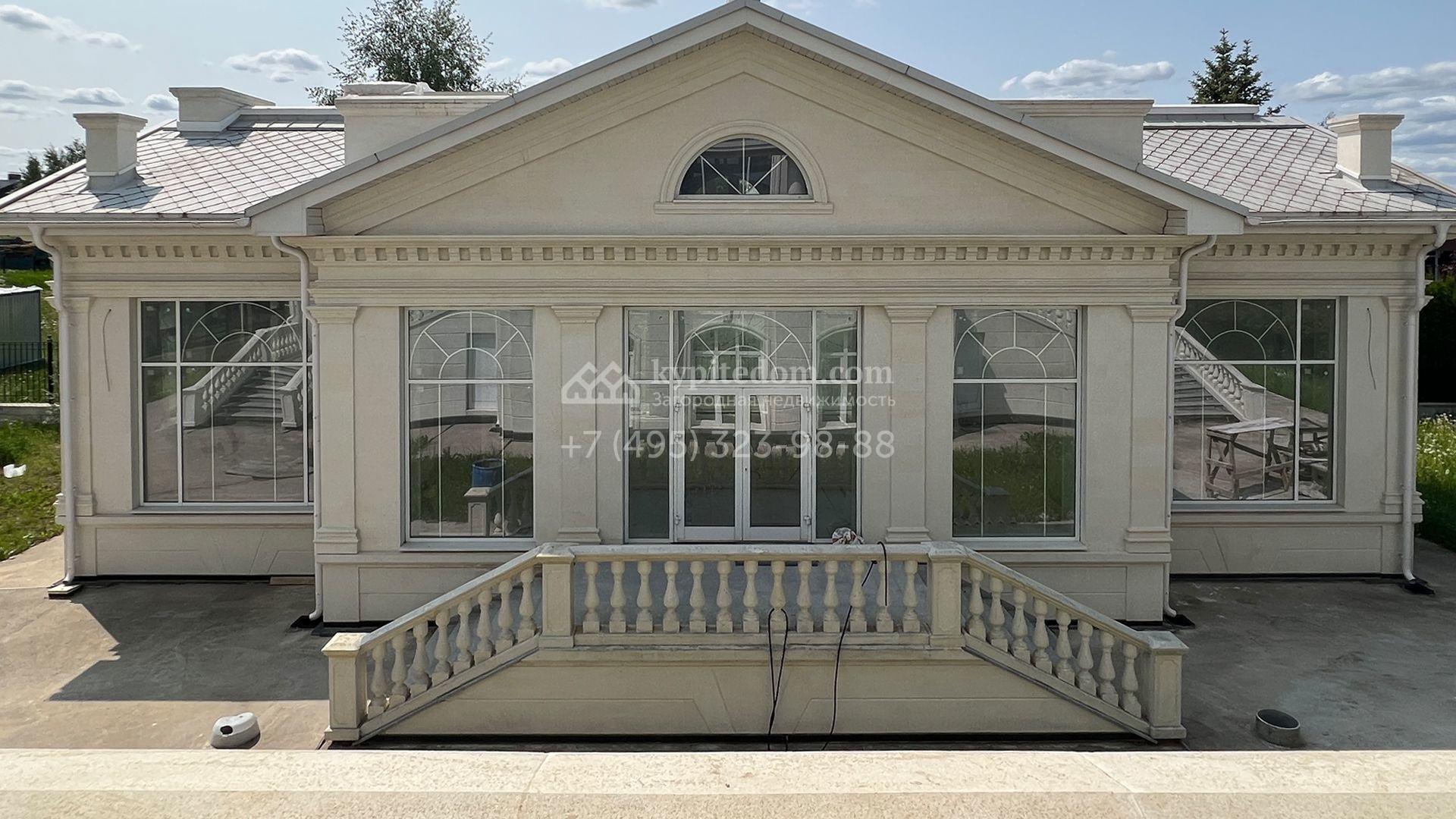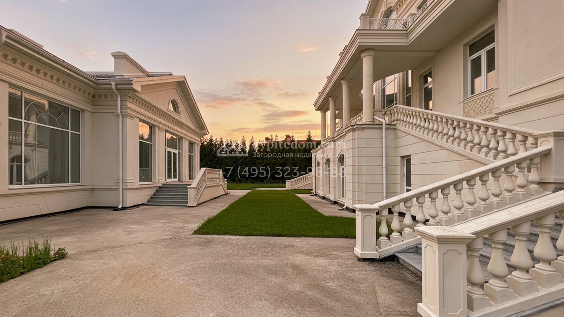 Загородный особняк площадью 1400 м² построен на полевом участке 23 сотки. Кремовый фасад здания выполнен в классическом стиле, декорирован колоннами, балясинами, рустовкой и резными элементами. Коттедж без отделки позволяет реализовать индивидуальный дизайн-проект. Планировкой дома предусмотрены семь спален, каминная, столовая-гостиная с большим аквариумом, кухня, кабинет с выходом в зимний сад, тренажёрный зал, зона отдыха, хаммамы и русская баня. В контуре дома расположены блок для персонала и два гаража. Резиденция оборудована системой «умный дом». Перед входной группой произведены работы для установки фонтана.