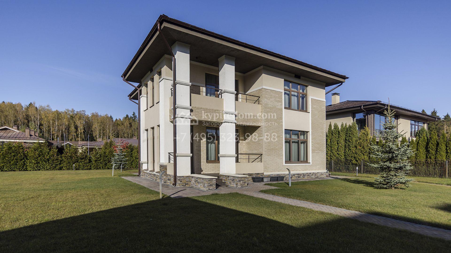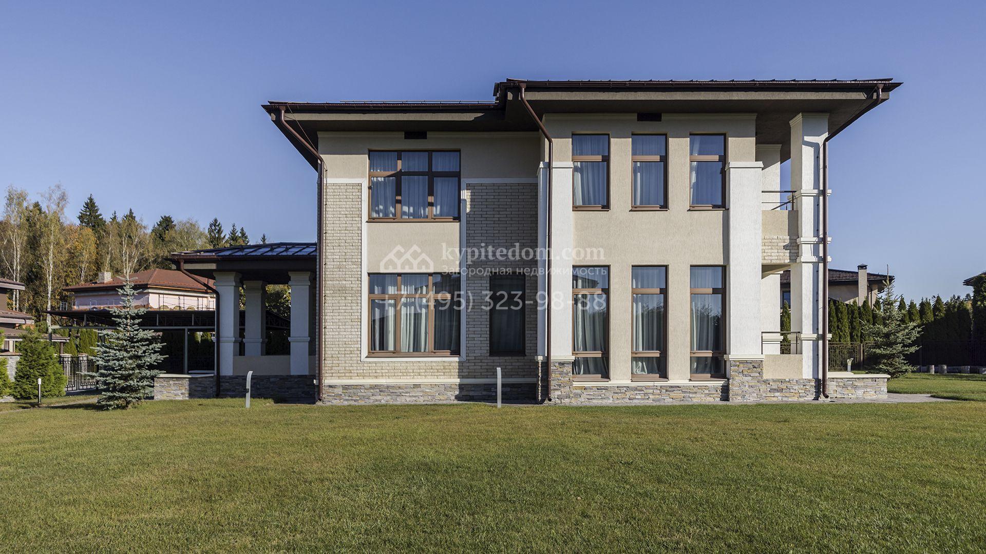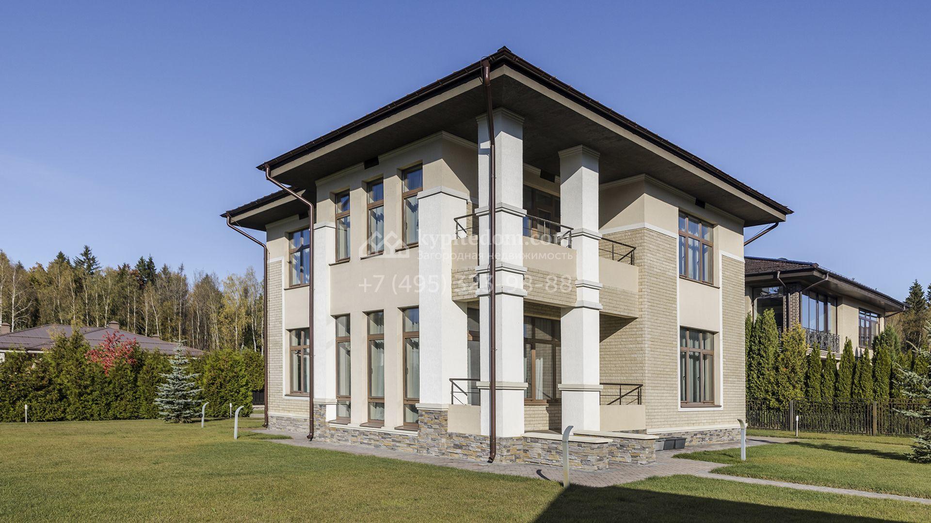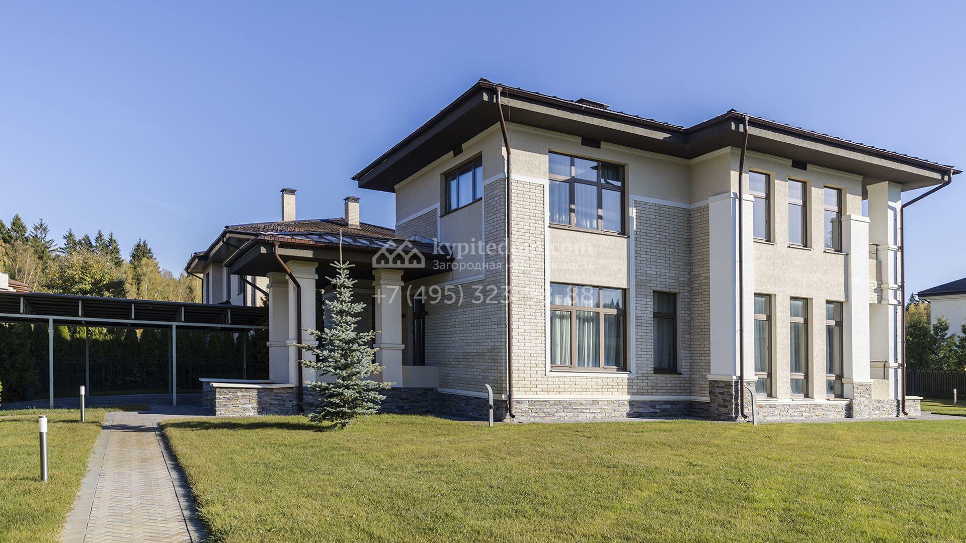 Загородный дом площадью 214 м² расположен на полевом участке 17 соток. Современный фасад облицован штукатуркой, клинкерным кирпичом, а также декорирован белоснежными колоннами и плиткой с фактурой камня по цоколю. Интерьер выдержан в спокойных тонах и дополнен комфортной мебелью, бытовой техникой и сантехникой.