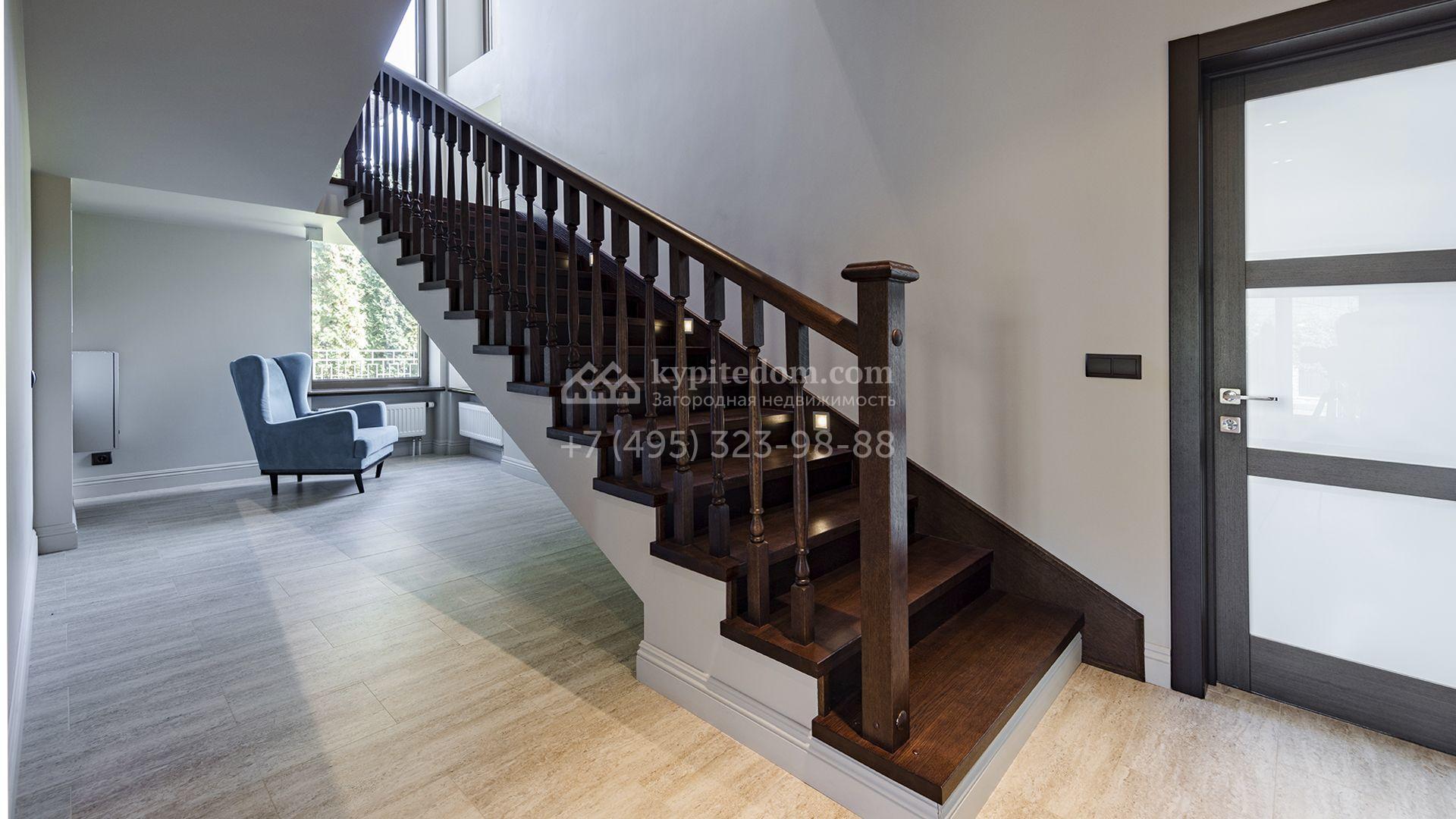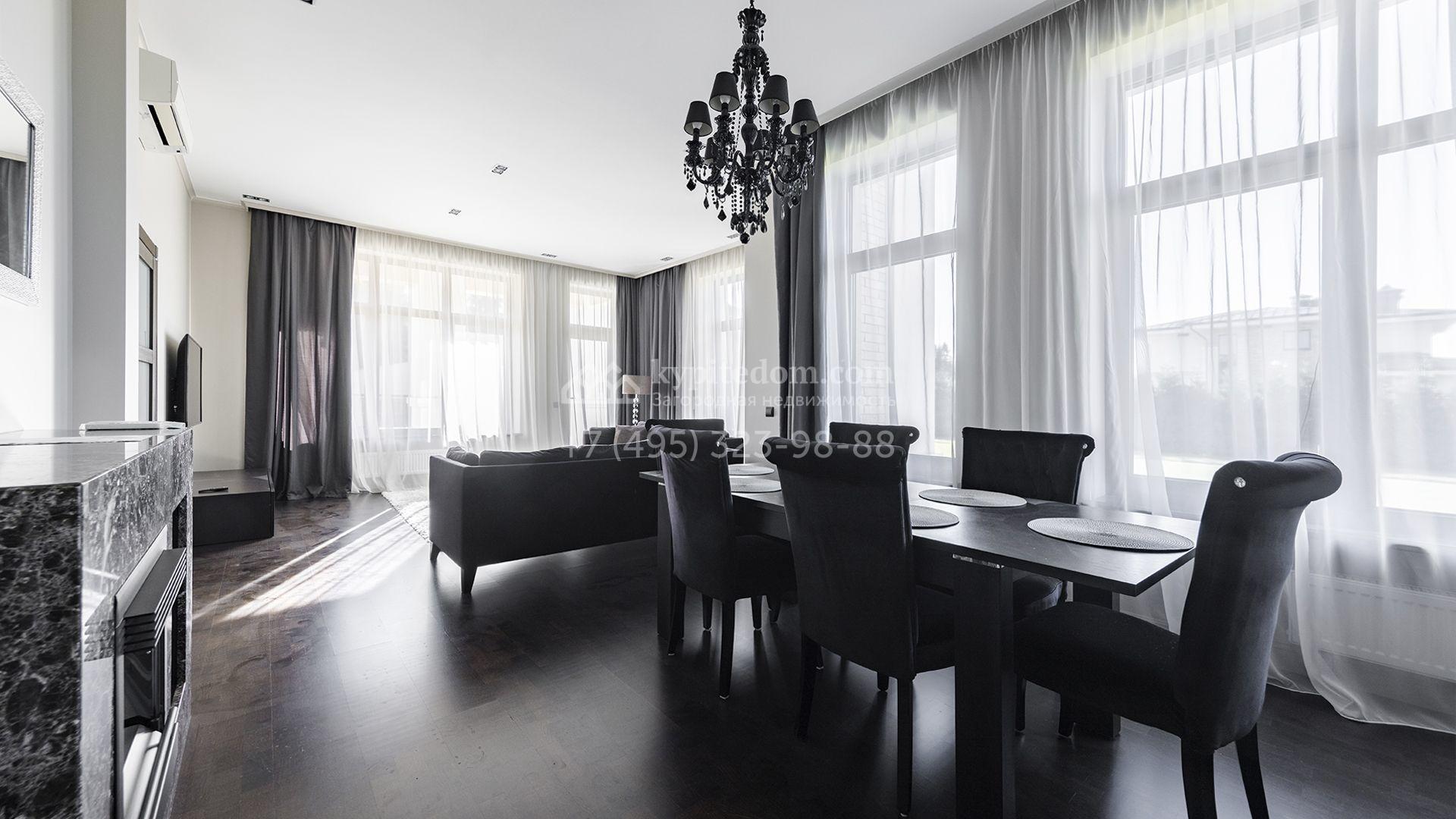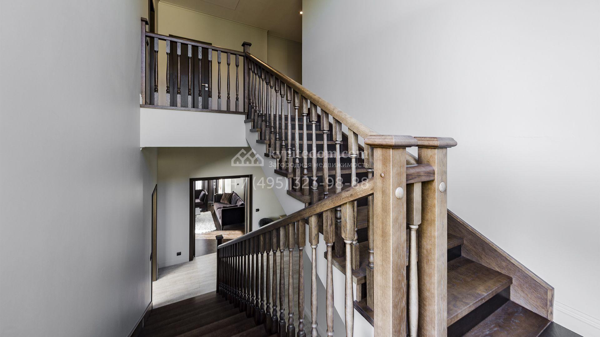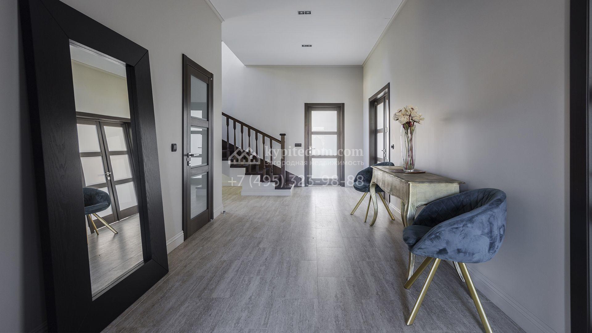 Загородный дом площадью 214 м² расположен на полевом участке 17 соток. Современный фасад облицован штукатуркой, клинкерным кирпичом, а также декорирован белоснежными колоннами и плиткой с фактурой камня по цоколю. Интерьер выдержан в спокойных тонах и дополнен комфортной мебелью, бытовой техникой и сантехникой.