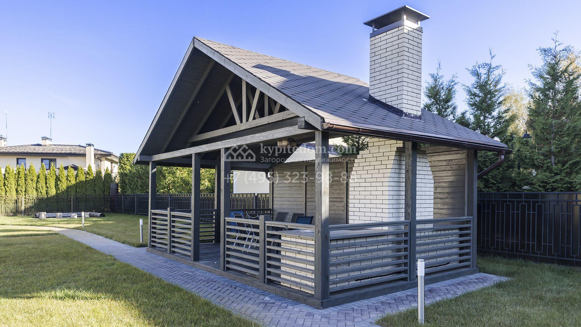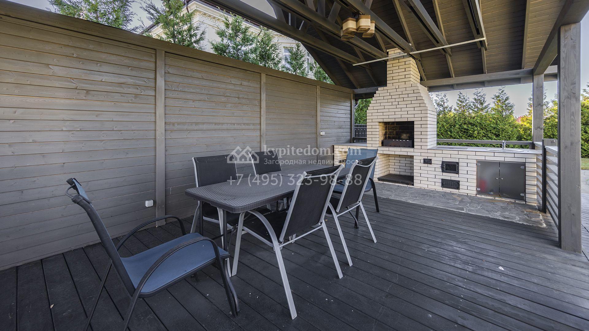 В коттедже спланировали просторную гостиную-кухню-столовую с камином и TV-зоной, террасу, 3 спальни, кабинет и 2 гардеробные. Рядом с основным зданием построены навес для автомобилей и беседка для барбекю, где можно уютно провести вечер с друзьями и семьей. В рамках ландшафтного дизайна на участке засеян газон, высажены хвойные деревья и вымощены дорожки, вдоль которых оборудовано уличное освещение.