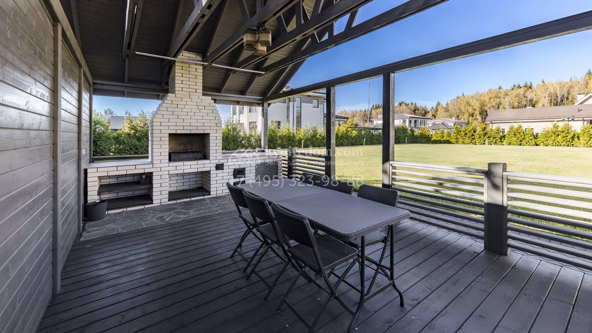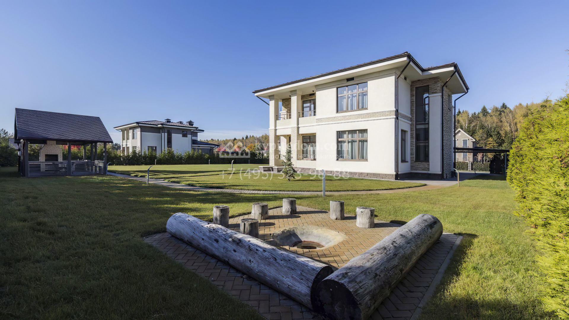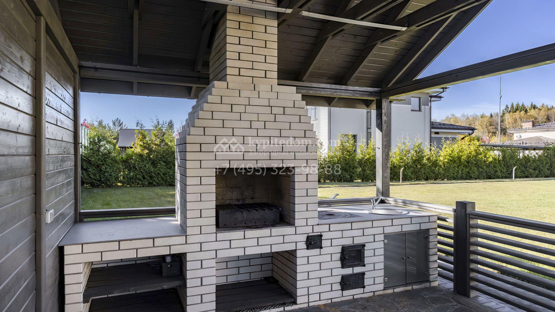 В коттедже спланировали уютную кухню-гостиную с камином, 3 спальни, кабинет и террасу. Рядом с основным зданием возведены навес для автомобилей и обустроенная беседка для барбекю. В рамках ландшафтного дизайна на участке засеян газон, высажены хвойные деревья, дорожки вымощены брусчаткой и оборудовано уличное освещение.