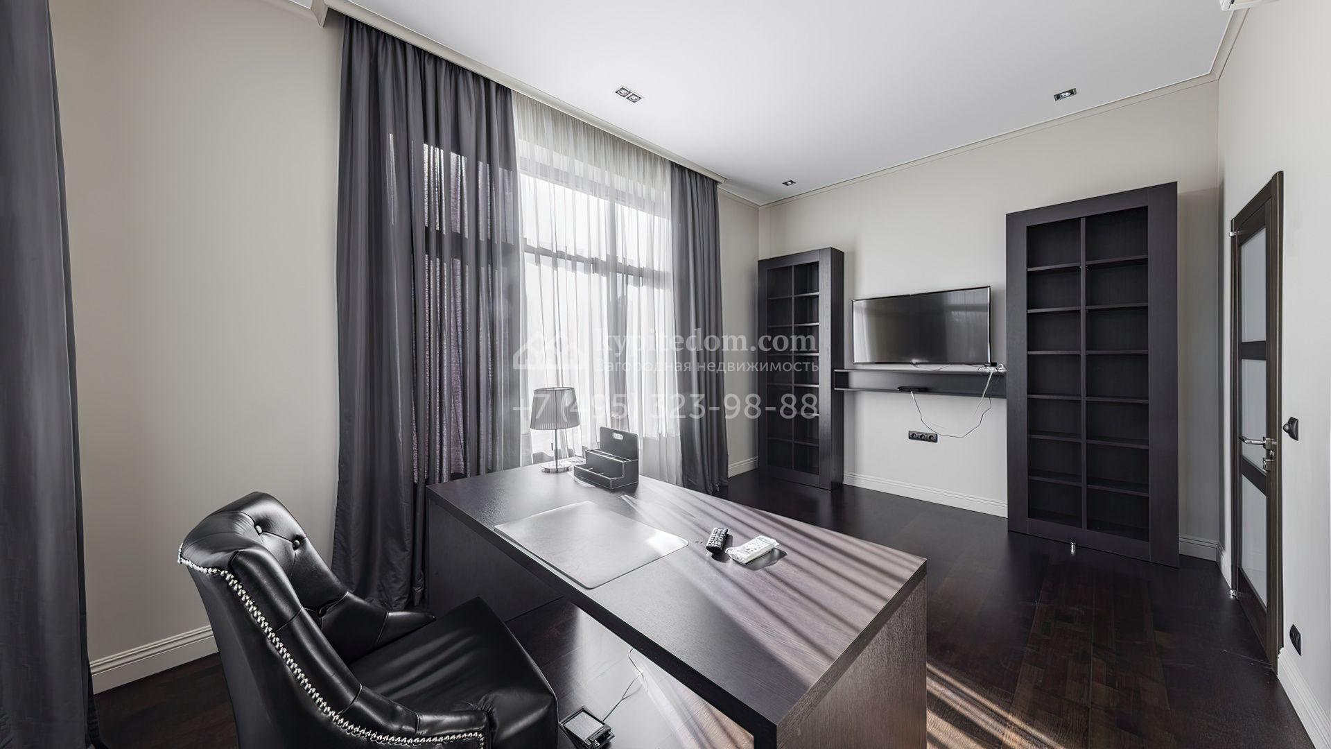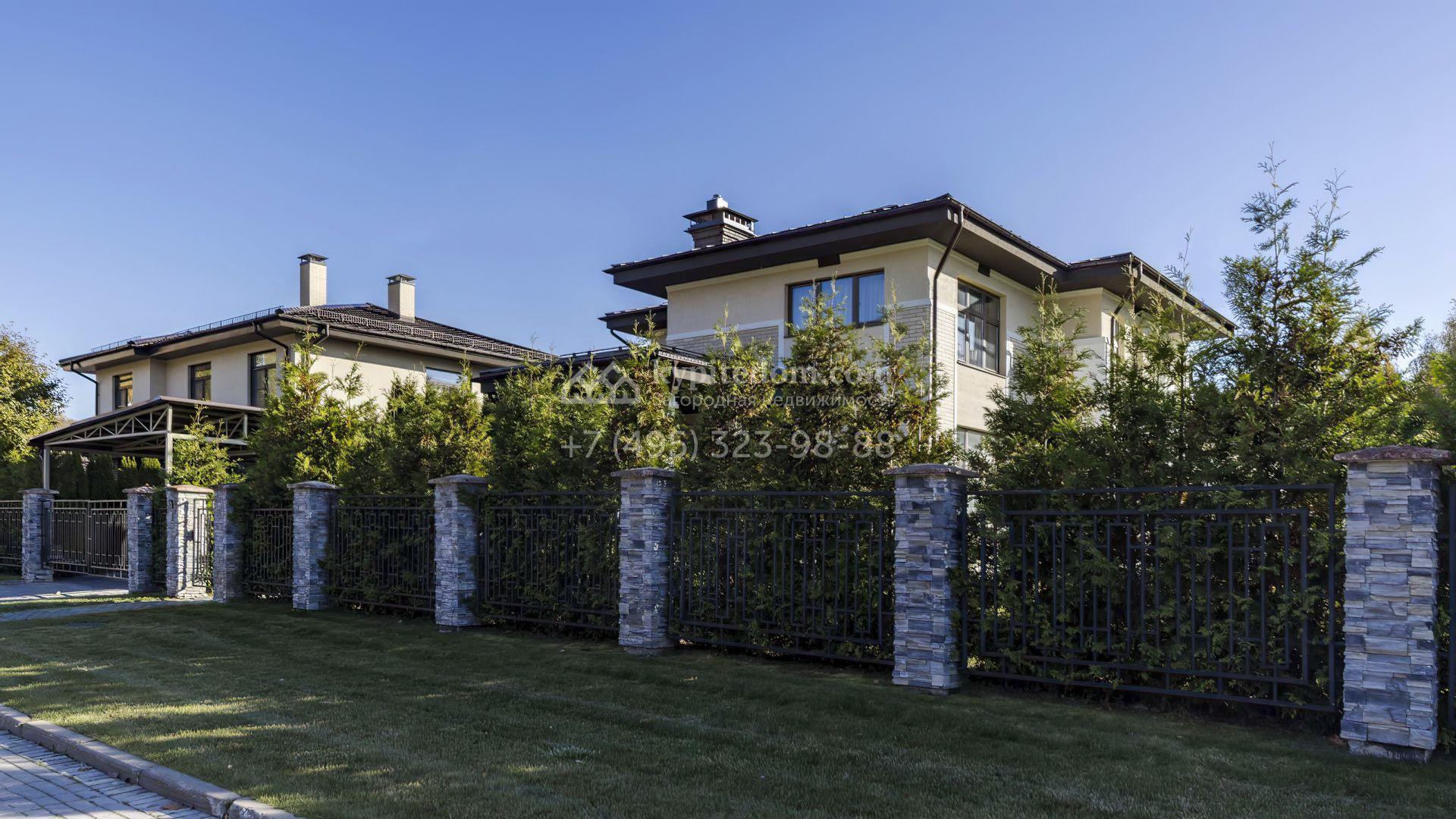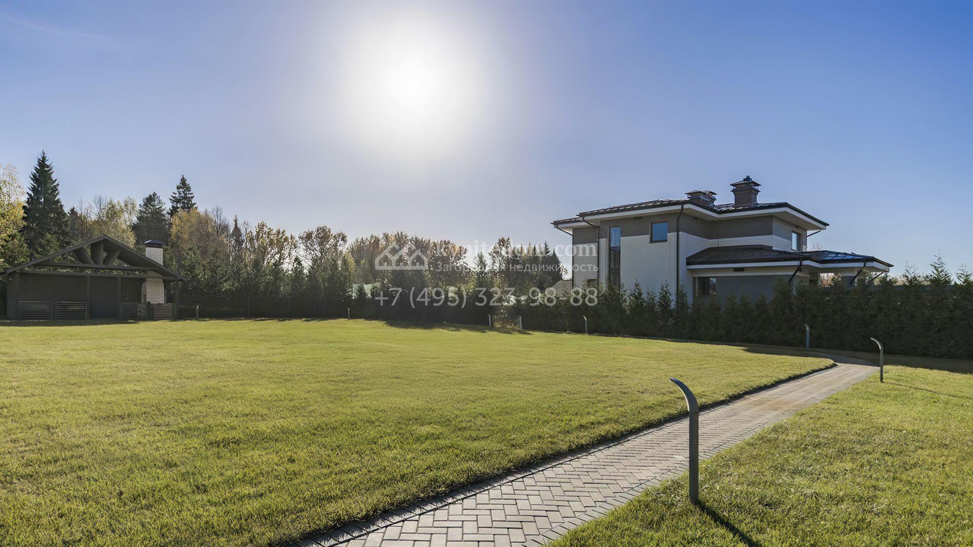 В коттедже спланировали уютную кухню-гостиную с камином, 3 спальни, кабинет и террасу. Рядом с основным зданием возведены навес для автомобилей и обустроенная беседка для барбекю. В рамках ландшафтного дизайна на участке засеян газон, высажены хвойные деревья, дорожки вымощены брусчаткой и оборудовано уличное освещение.