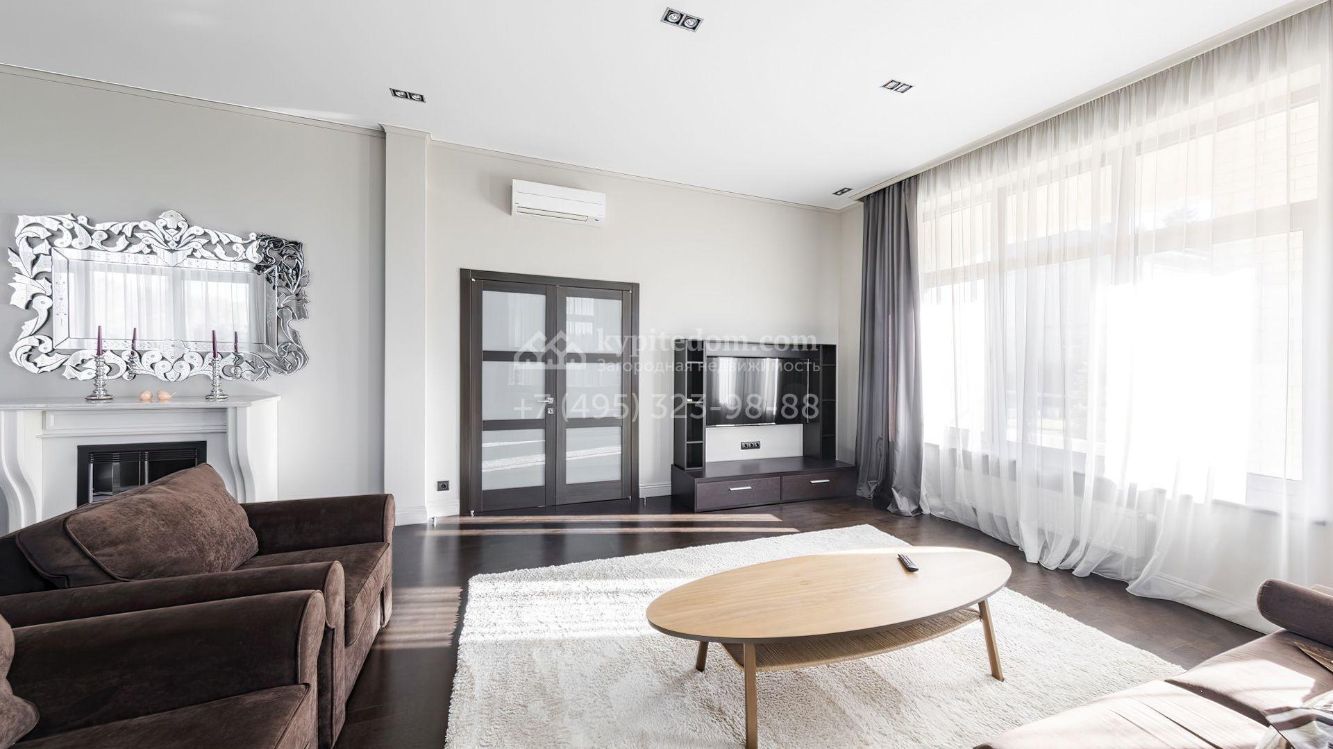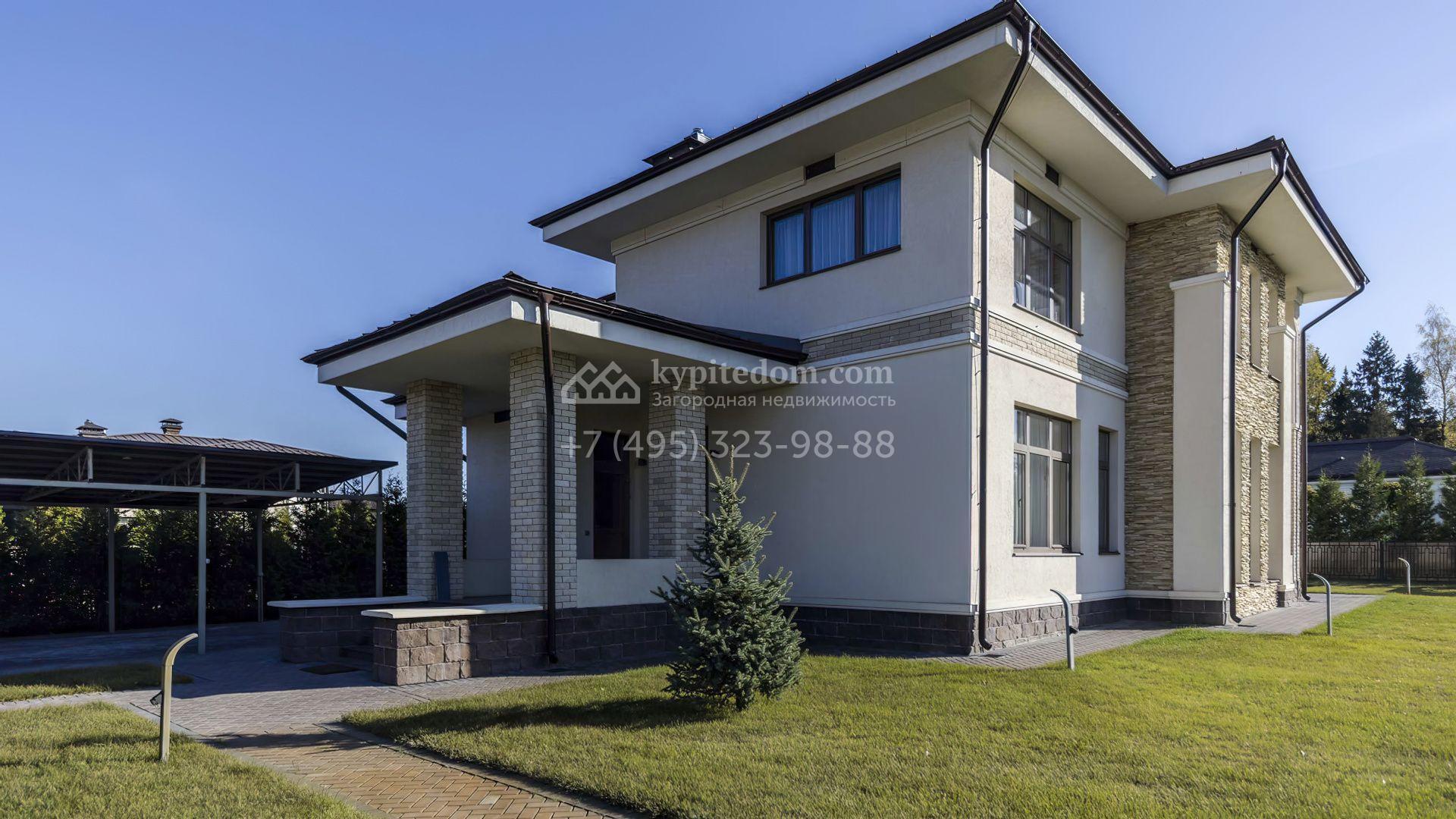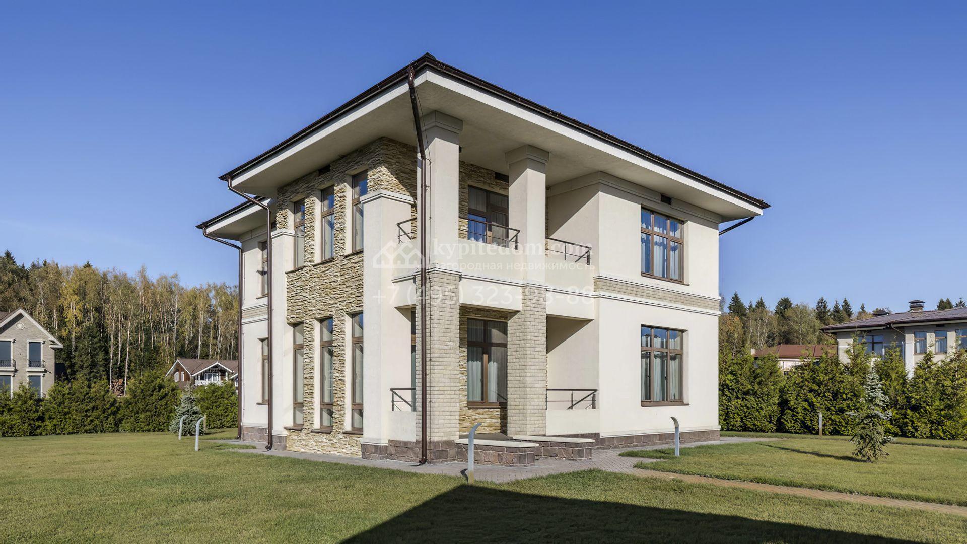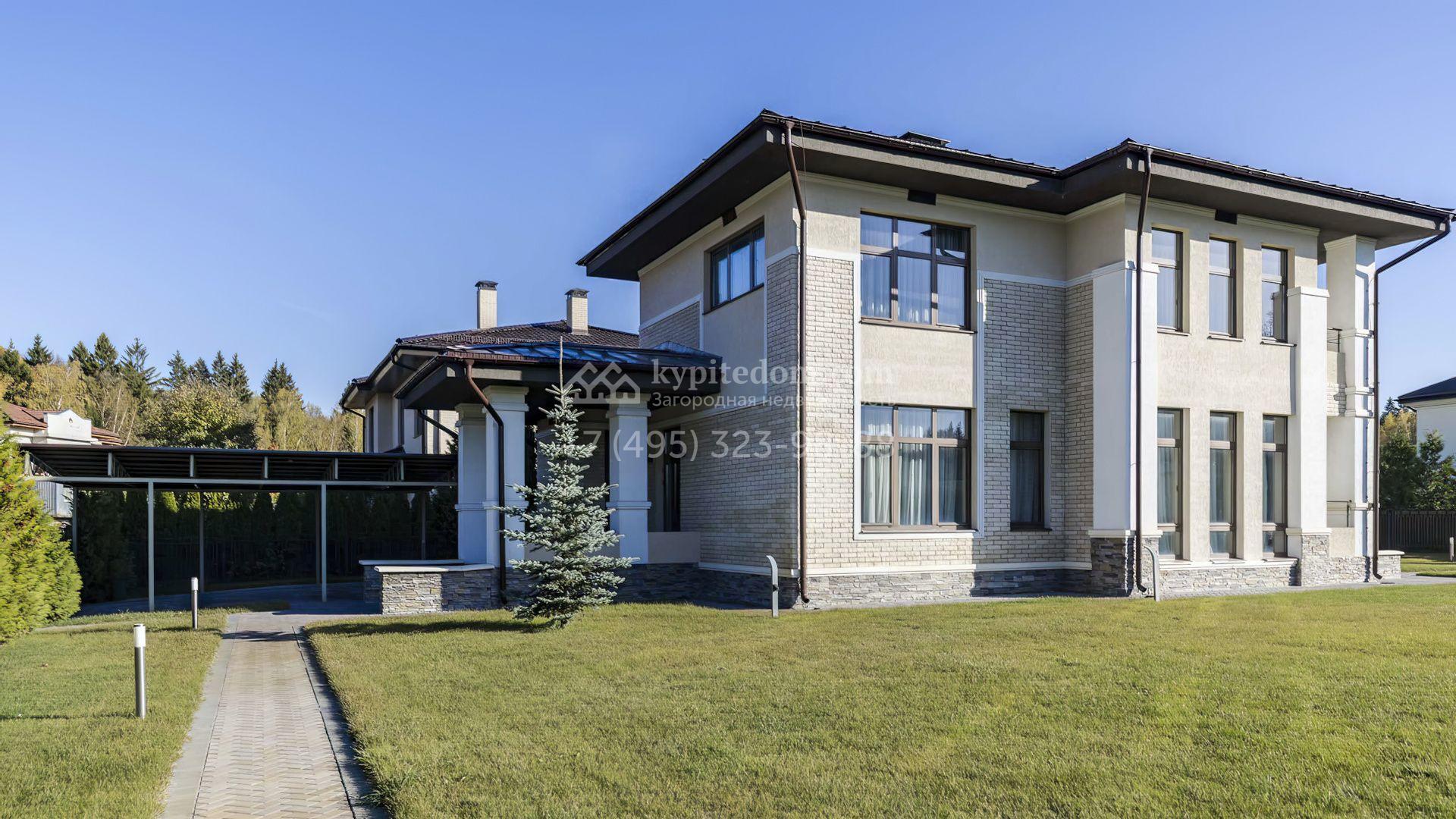 Загородный дом площадью 214 м² расположен на просторном полевом участке 19 соток. Современный фасад с большими окнами облицован бежевой штукатуркой и серым клинкерным кирпичом. Интерьер выдержан в спокойных тонах, дополнен мебелью, бытовой техникой Bosch и сантехникой.
