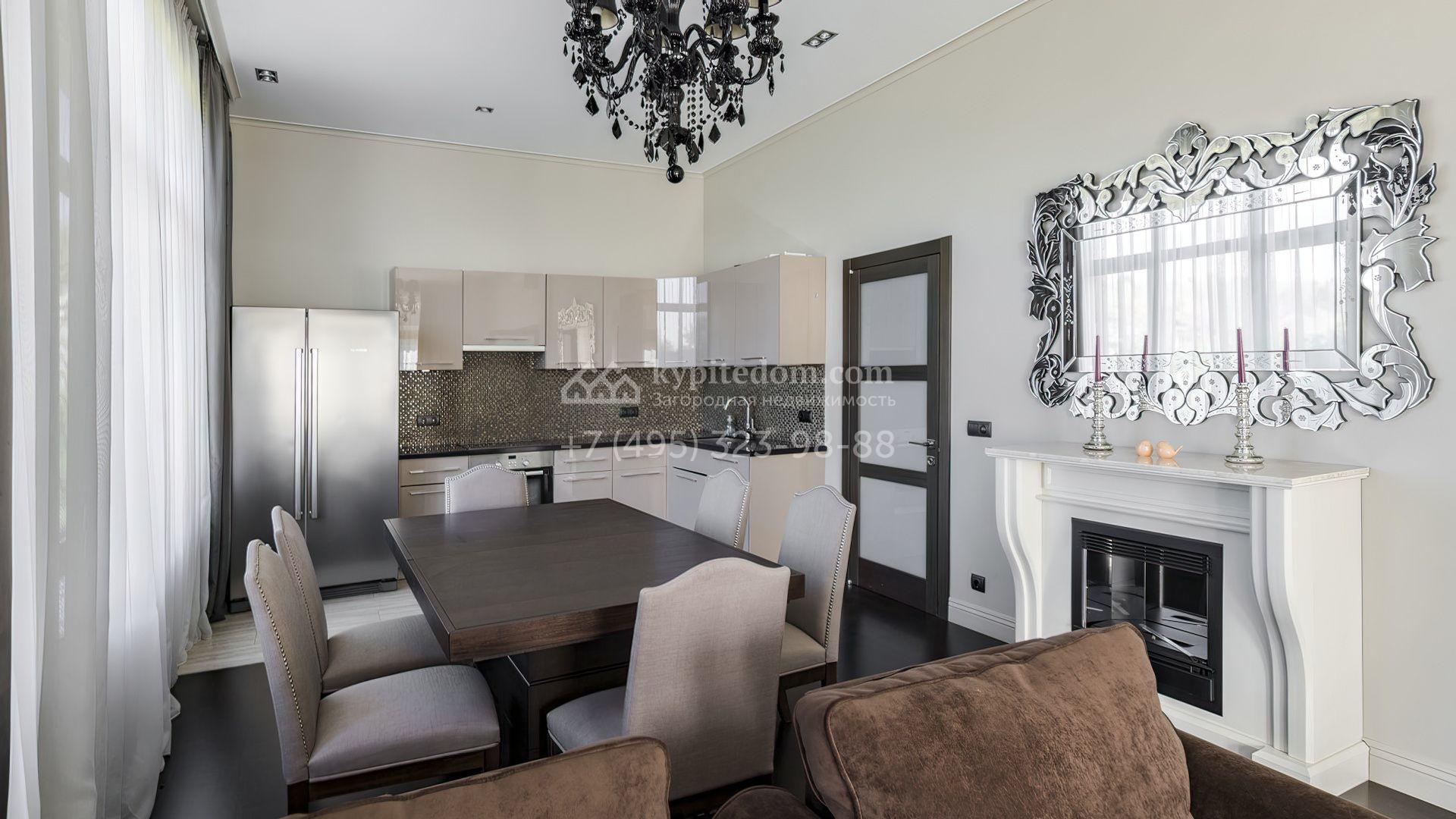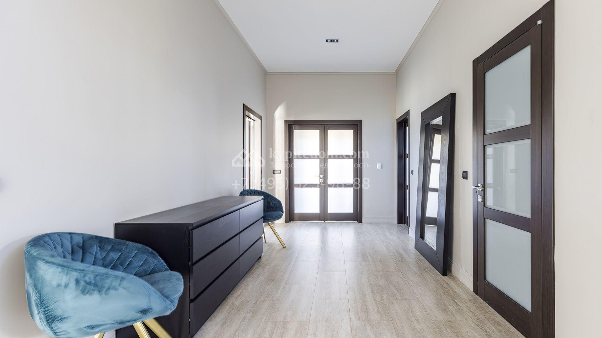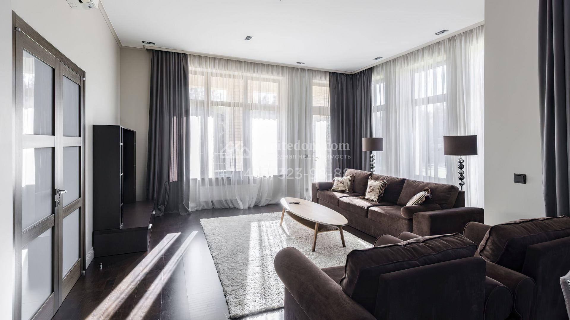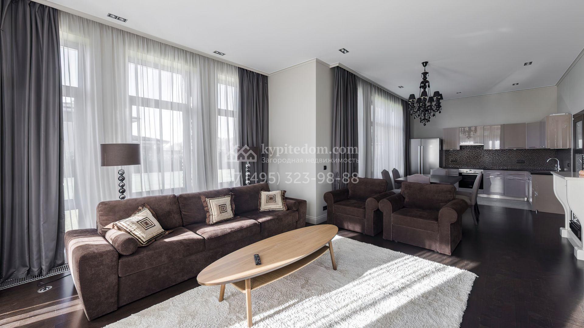 Загородный дом площадью 214 м² расположен на просторном полевом участке 19 соток. Современный фасад с большими окнами облицован бежевой штукатуркой и серым клинкерным кирпичом. Интерьер выдержан в спокойных тонах, дополнен мебелью, бытовой техникой Bosch и сантехникой.