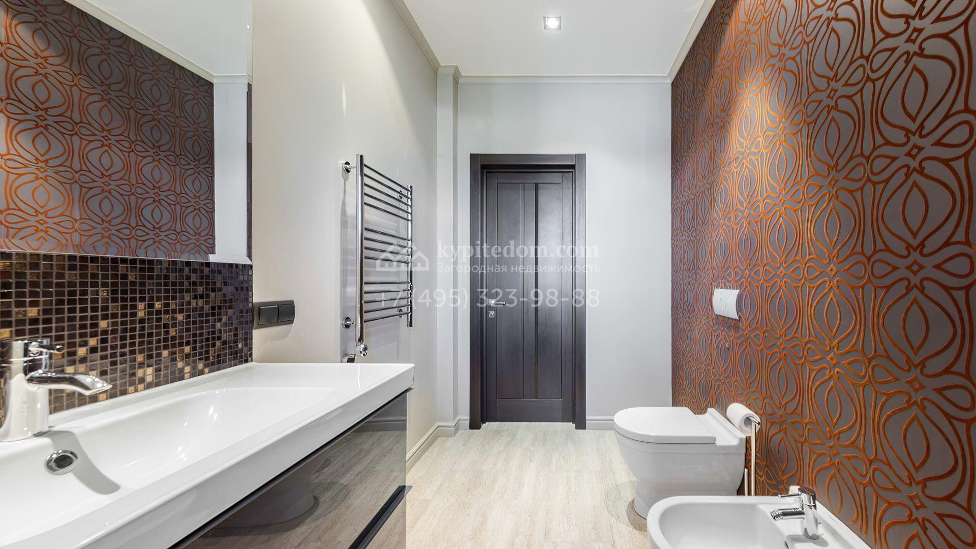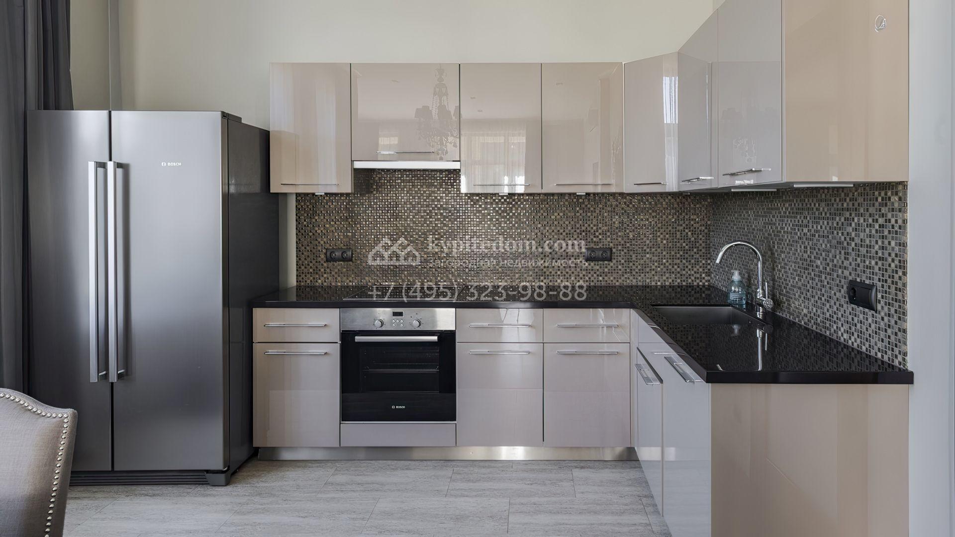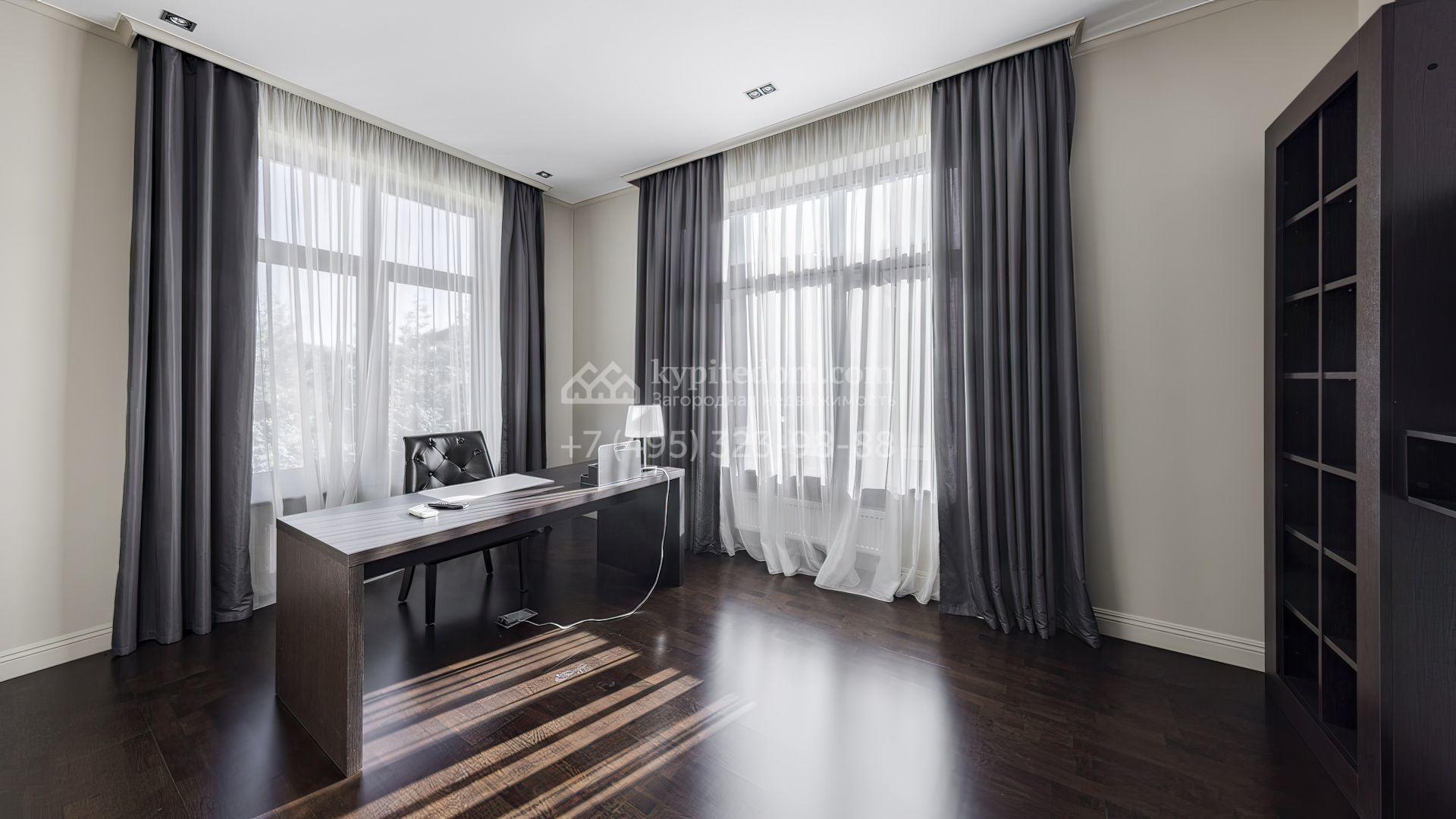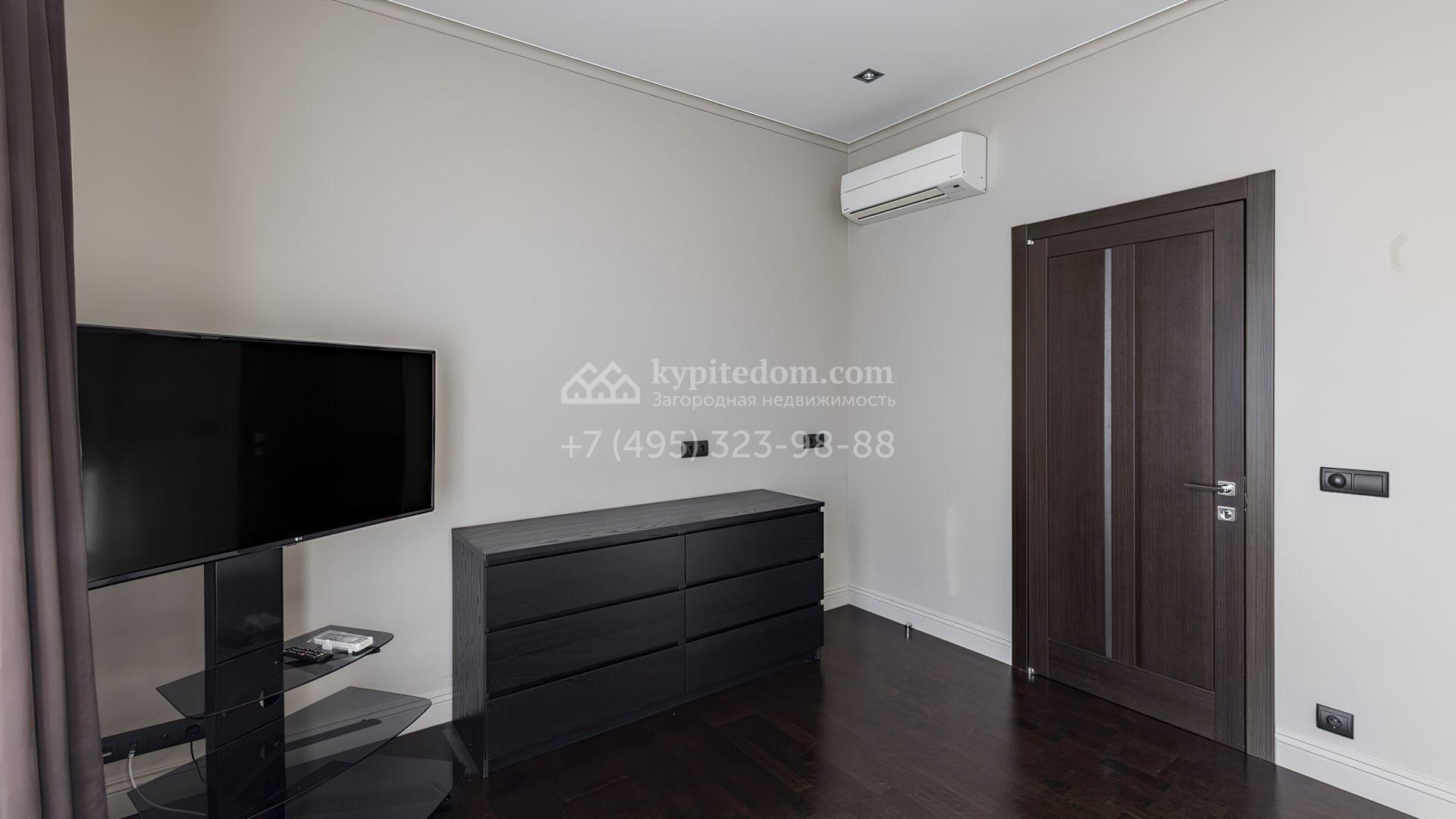 Загородный дом площадью 214 м² расположен на просторном полевом участке 19 соток. Современный фасад с большими окнами облицован бежевой штукатуркой и серым клинкерным кирпичом. Интерьер выдержан в спокойных тонах, дополнен мебелью, бытовой техникой Bosch и сантехникой.