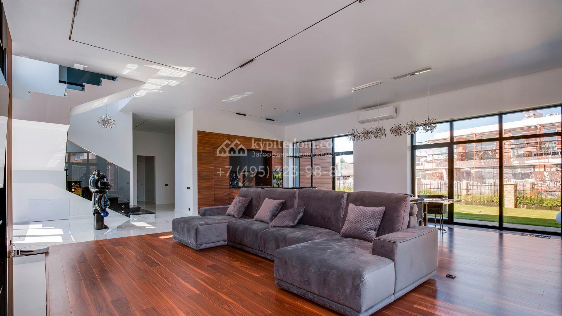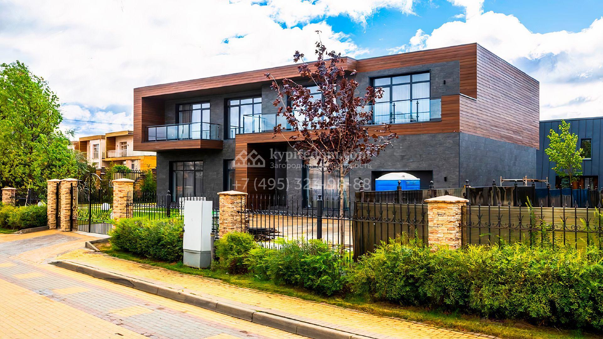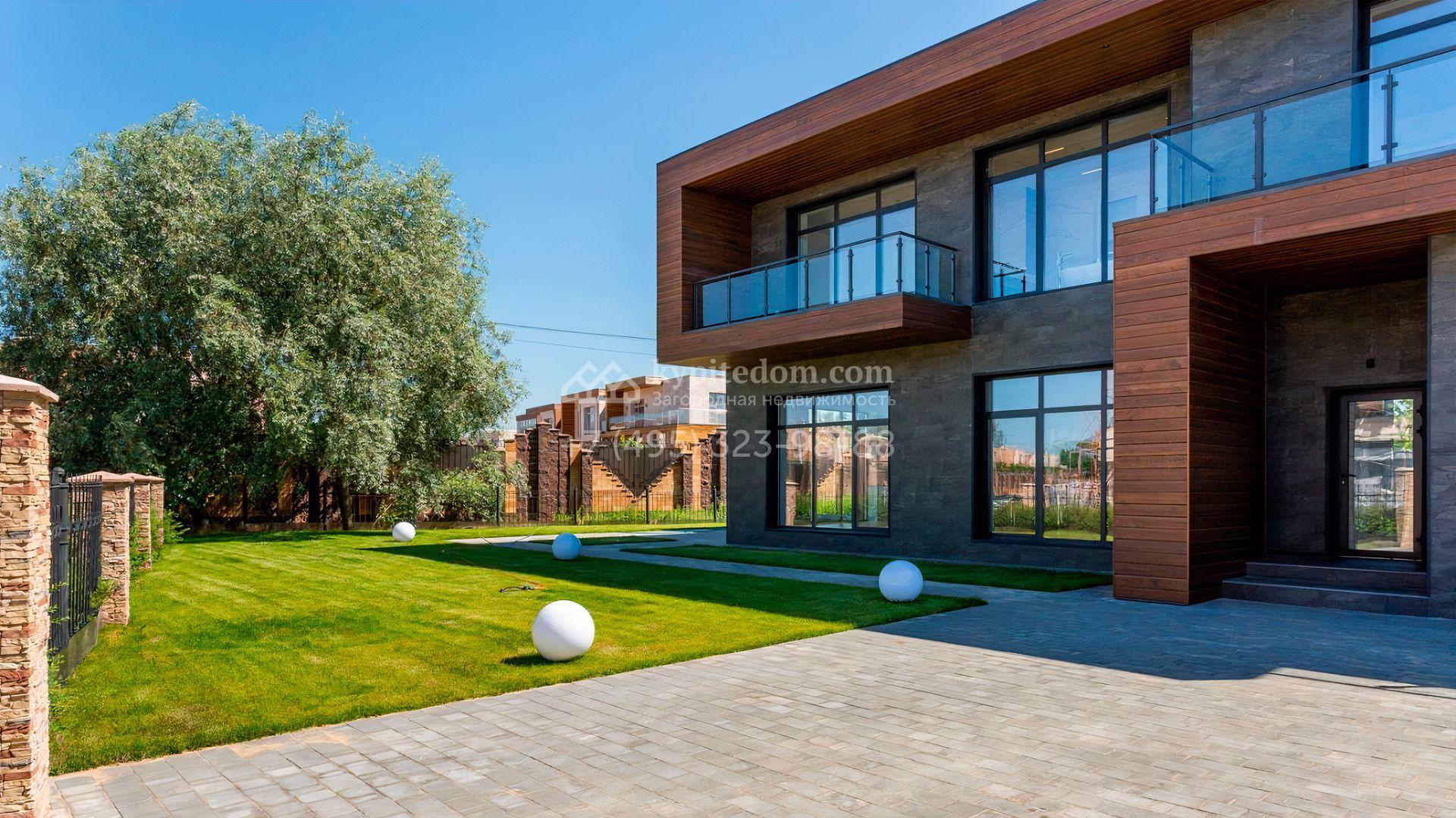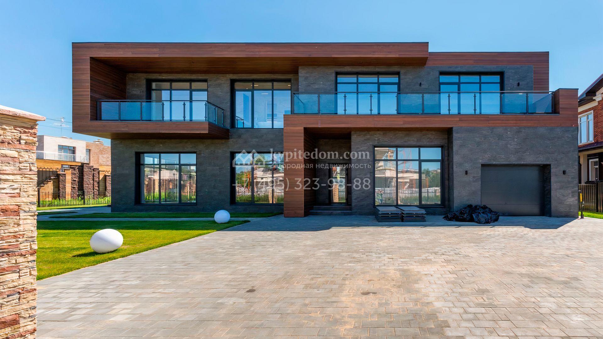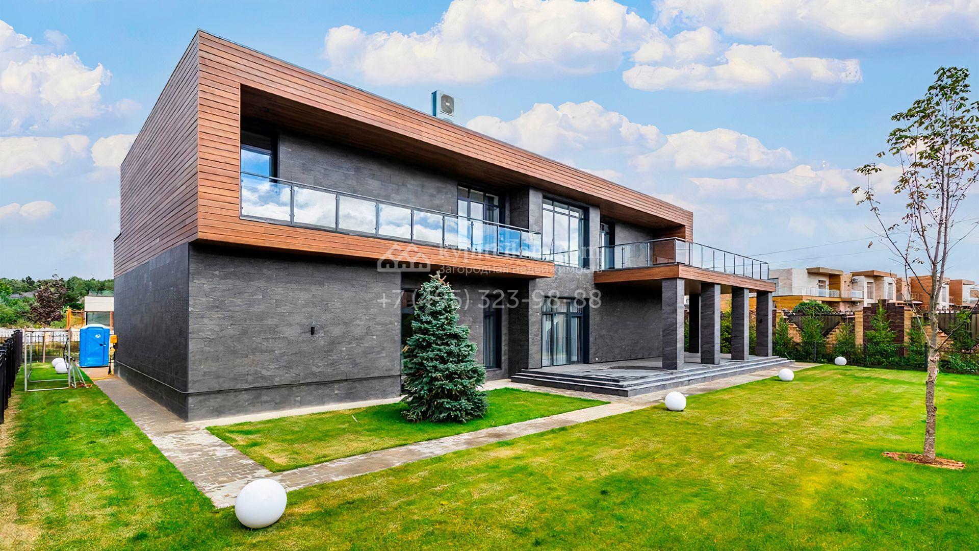 Загородный дом площадью 545 м² постороен на полевом участке 12 соток. Современный фасад с панорамными окнами облицован камнем и деревом. Интерьер выдержан в светлых оттенках, полы выполнены из керамогранита и орехового паркета, ванные комнаты оборудованы сантехникой Villeroy&Boch. В коттедже спланировали 4 спальни, объединенные единым пространством гостиная, кухня и столовая, гараж на 2 машины. На участке засеян газон, вымощены дорожки, оборудована система автополива и высажены деревья.