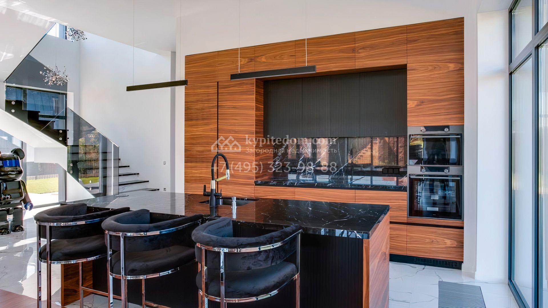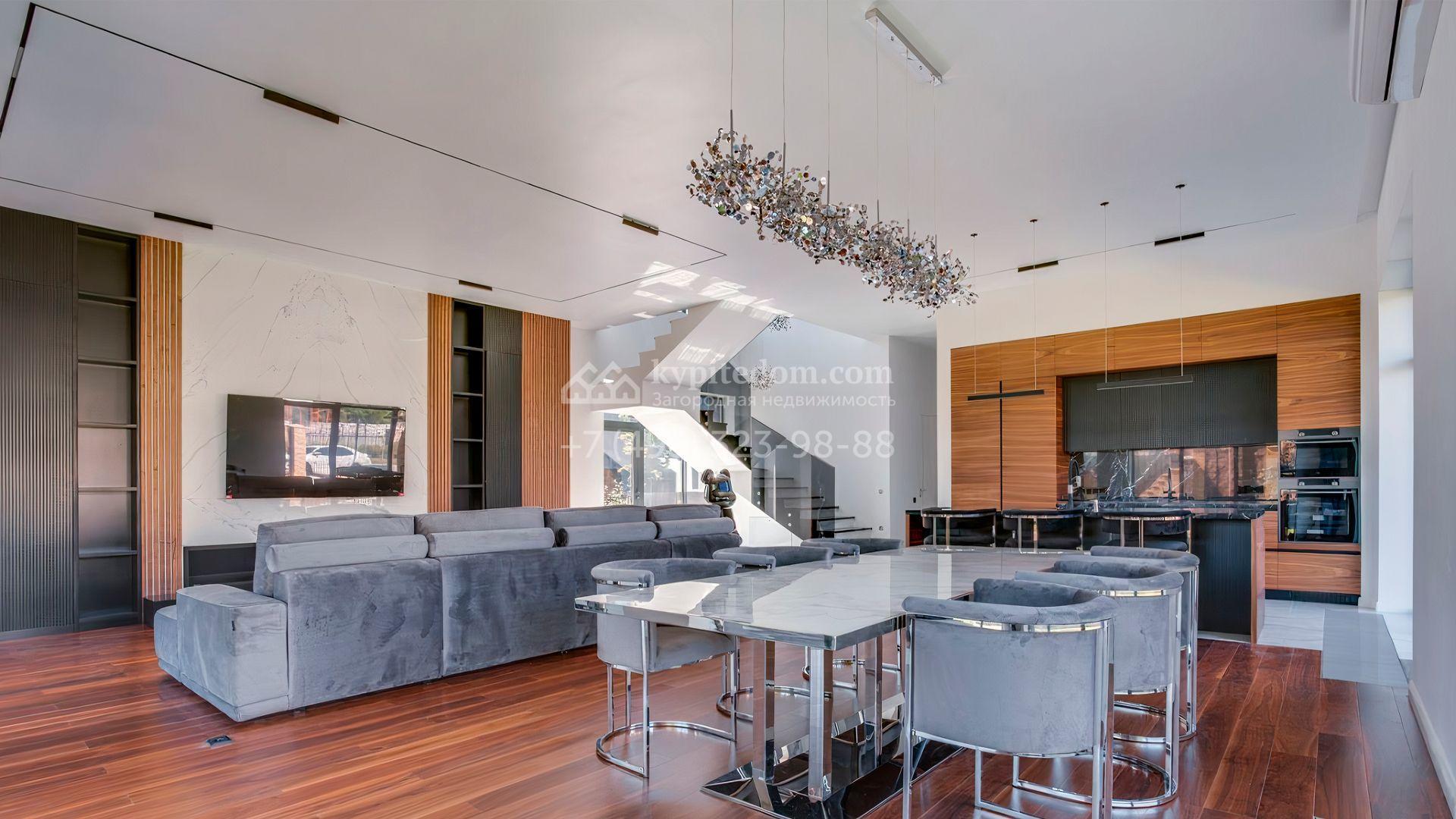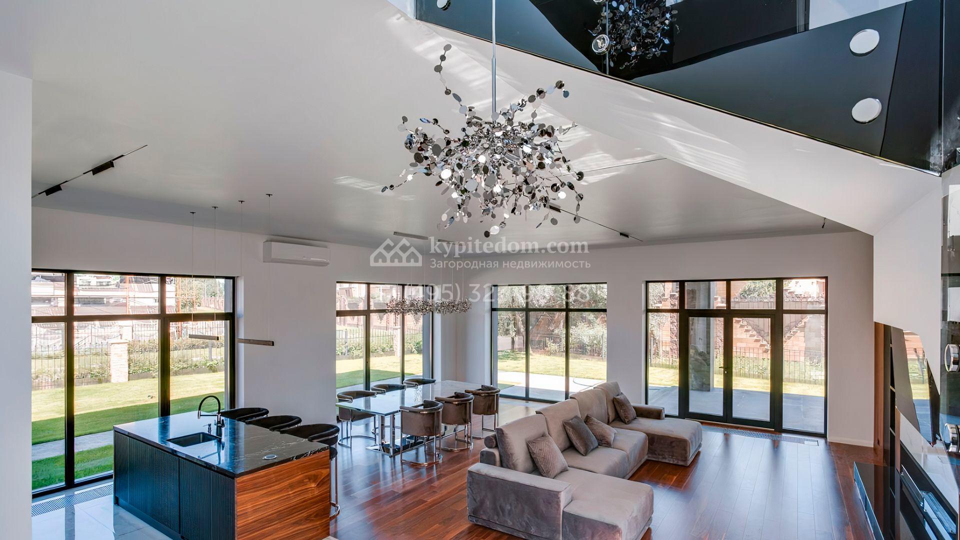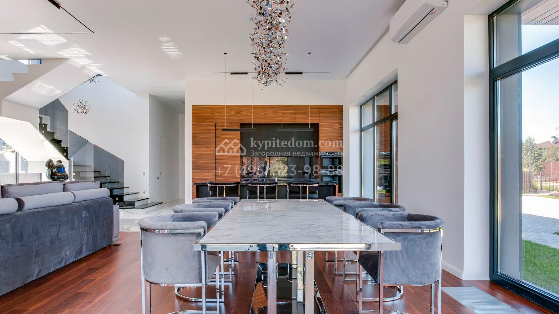 Загородный дом площадью 545 м² постороен на полевом участке 12 соток. Современный фасад с панорамными окнами облицован камнем и деревом. Интерьер выдержан в светлых оттенках, полы выполнены из керамогранита и орехового паркета, ванные комнаты оборудованы сантехникой Villeroy&Boch. В коттедже спланировали 4 спальни, объединенные единым пространством гостиная, кухня и столовая, гараж на 2 машины. На участке засеян газон, вымощены дорожки, оборудована система автополива и высажены деревья.