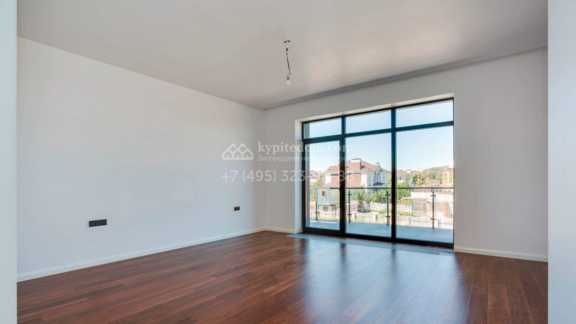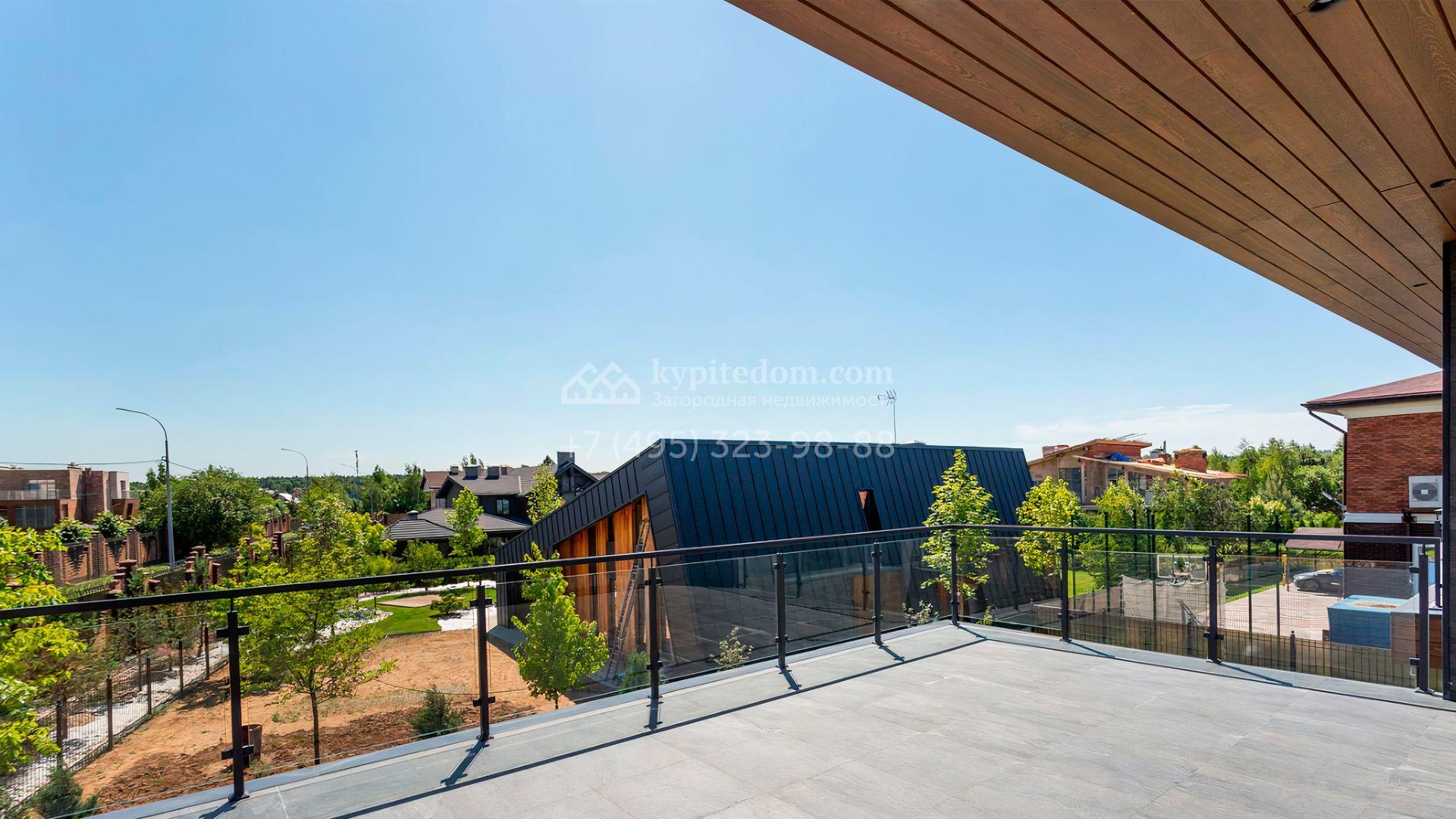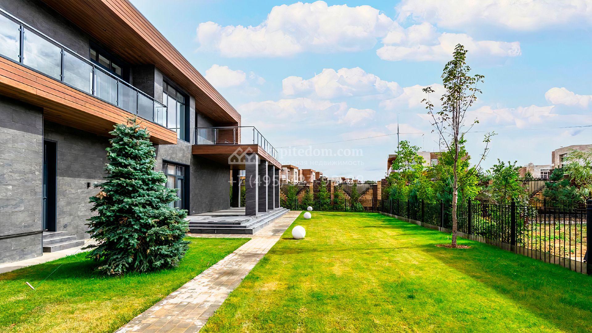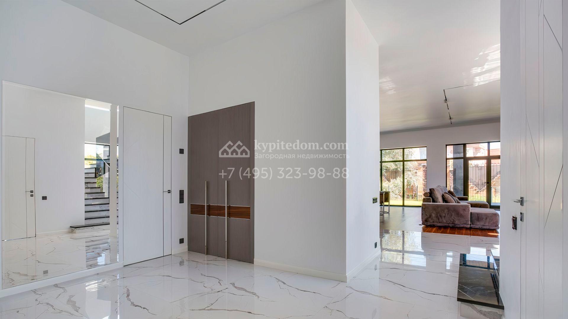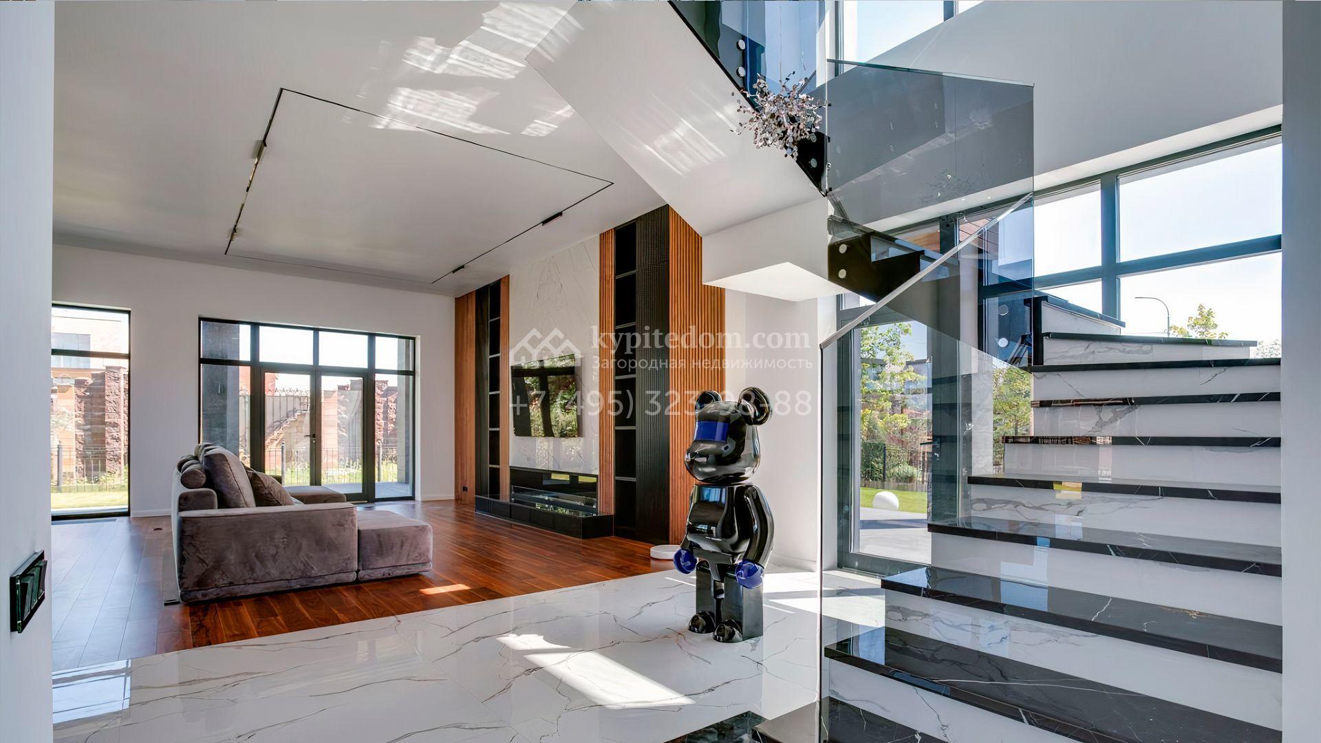 Загородный дом площадью 545 м² постороен на полевом участке 12 соток. Современный фасад с панорамными окнами облицован камнем и деревом. Интерьер выдержан в светлых оттенках, полы выполнены из керамогранита и орехового паркета, ванные комнаты оборудованы сантехникой Villeroy&Boch. В коттедже спланировали 4 спальни, объединенные единым пространством гостиная, кухня и столовая, гараж на 2 машины. На участке засеян газон, вымощены дорожки, оборудована система автополива и высажены деревья.