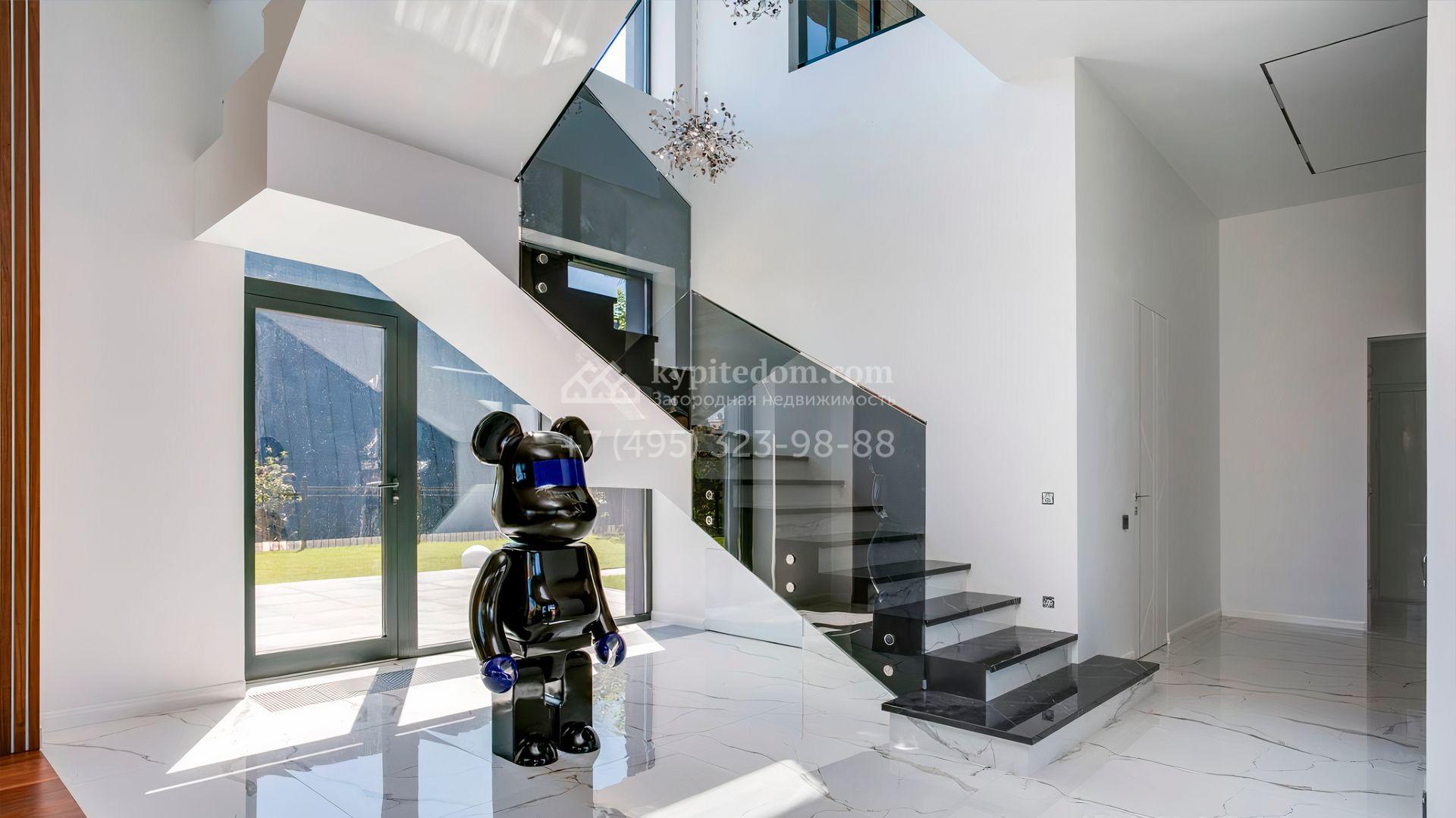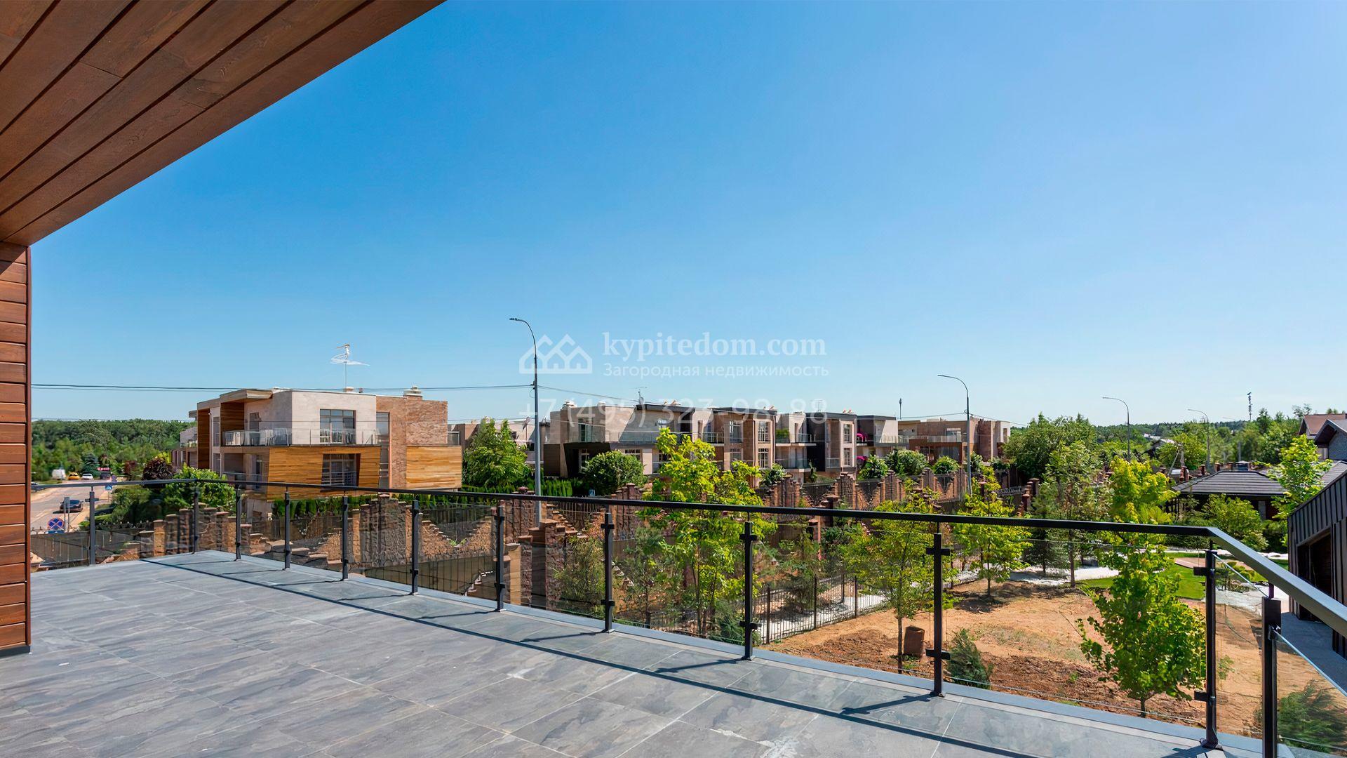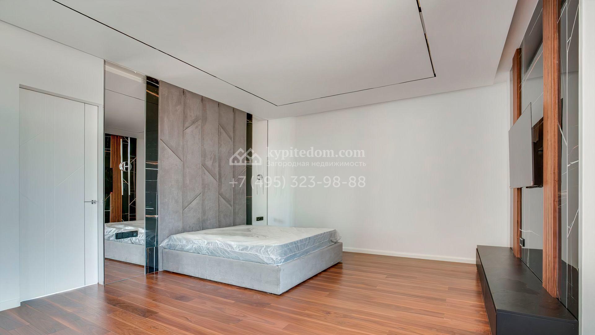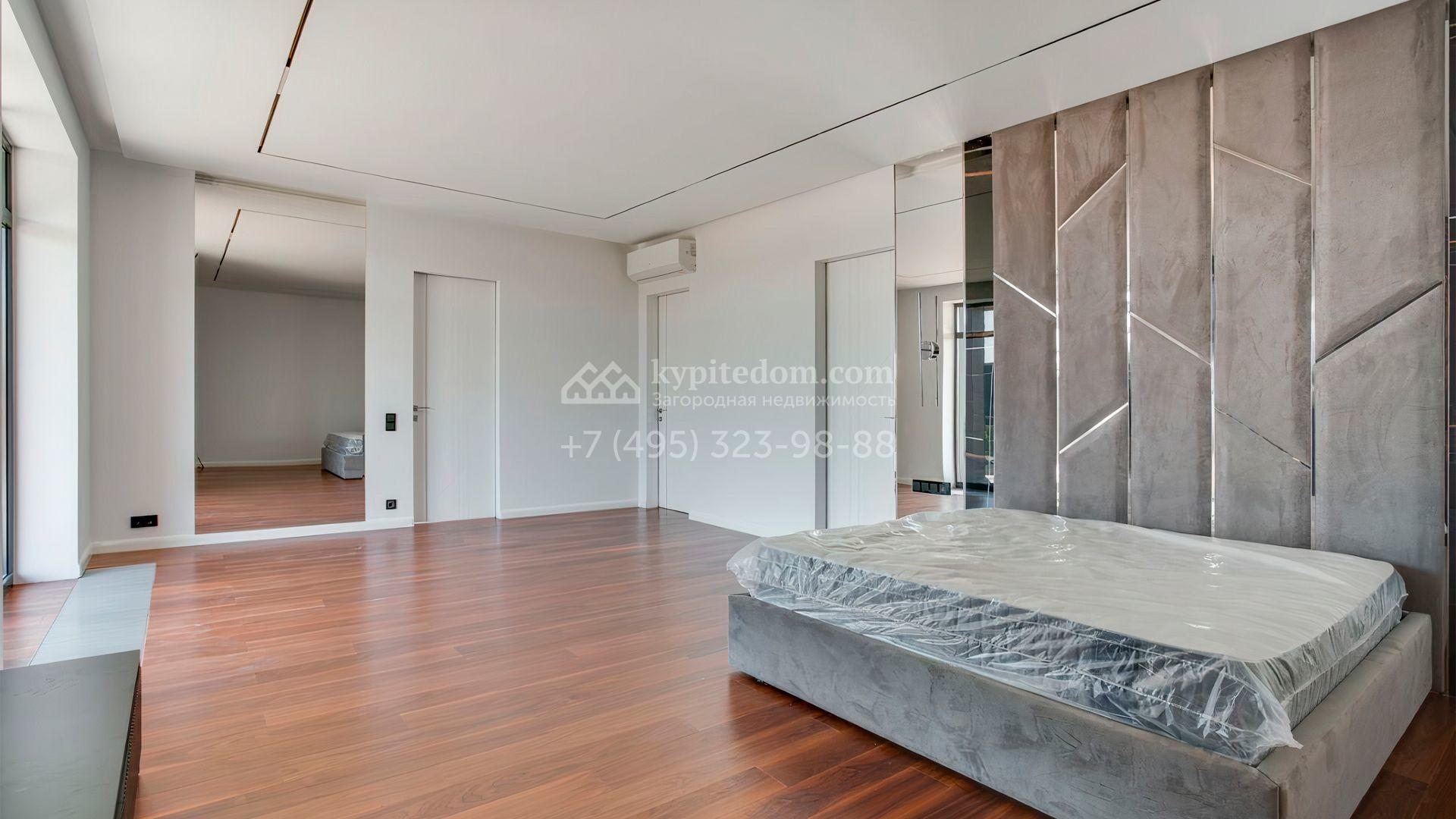 Загородный дом площадью 545 м² постороен на полевом участке 12 соток. Современный фасад с панорамными окнами облицован камнем и деревом. Интерьер выдержан в светлых оттенках, полы выполнены из керамогранита и орехового паркета, ванные комнаты оборудованы сантехникой Villeroy&Boch. В коттедже спланировали 4 спальни, объединенные единым пространством гостиная, кухня и столовая, гараж на 2 машины. На участке засеян газон, вымощены дорожки, оборудована система автополива и высажены деревья.