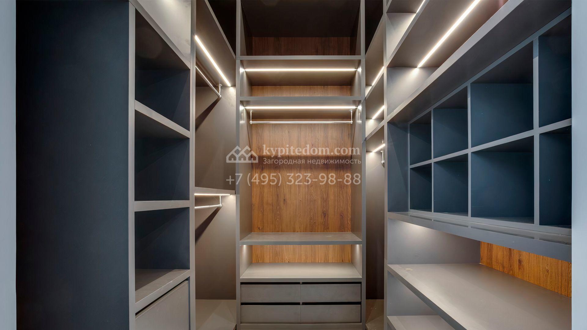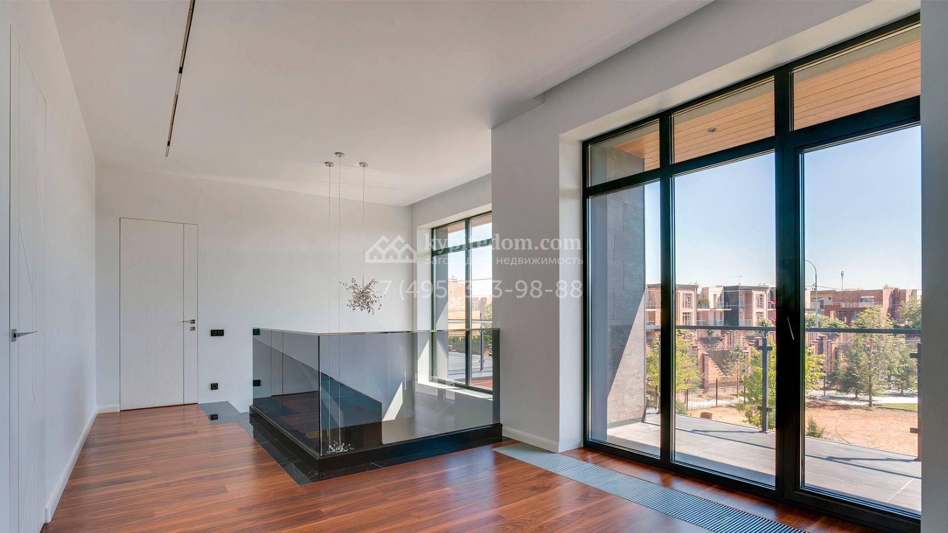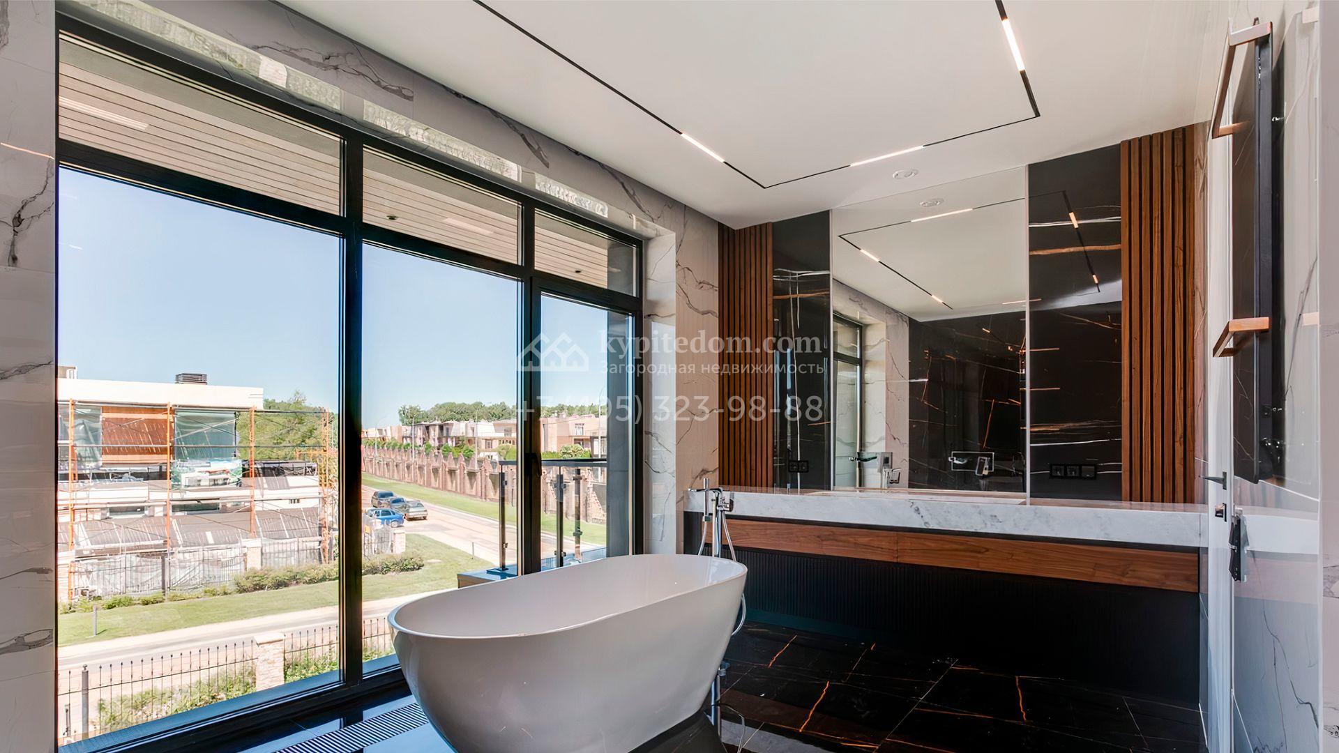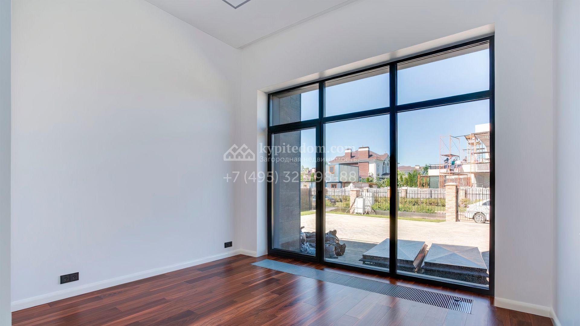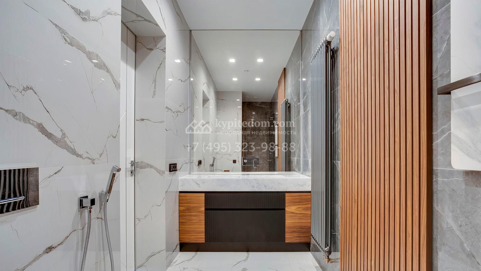 Загородный дом площадью 545 м² постороен на полевом участке 12 соток. Современный фасад с панорамными окнами облицован камнем и деревом. Интерьер выдержан в светлых оттенках, полы выполнены из керамогранита и орехового паркета, ванные комнаты оборудованы сантехникой Villeroy&Boch. В коттедже спланировали 4 спальни, объединенные единым пространством гостиная, кухня и столовая, гараж на 2 машины. На участке засеян газон, вымощены дорожки, оборудована система автополива и высажены деревья.
