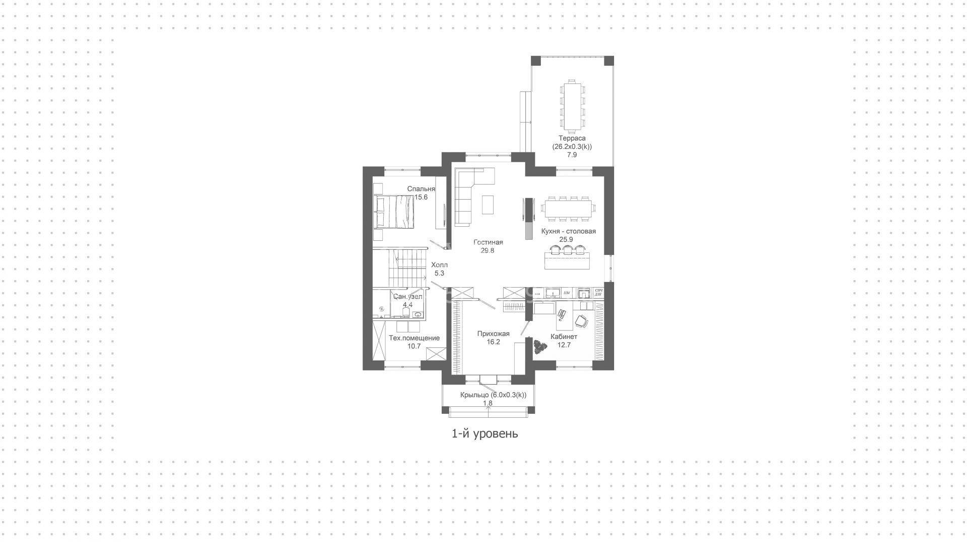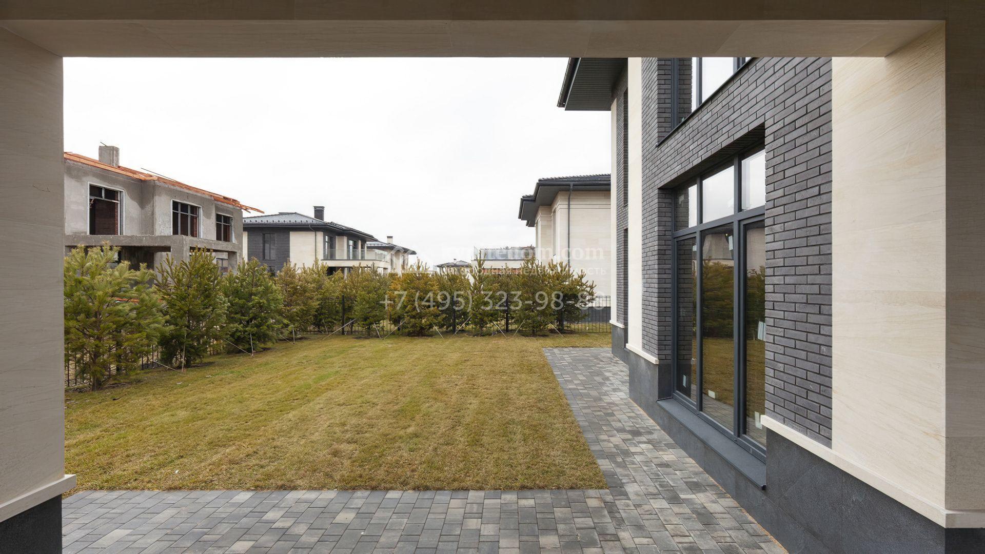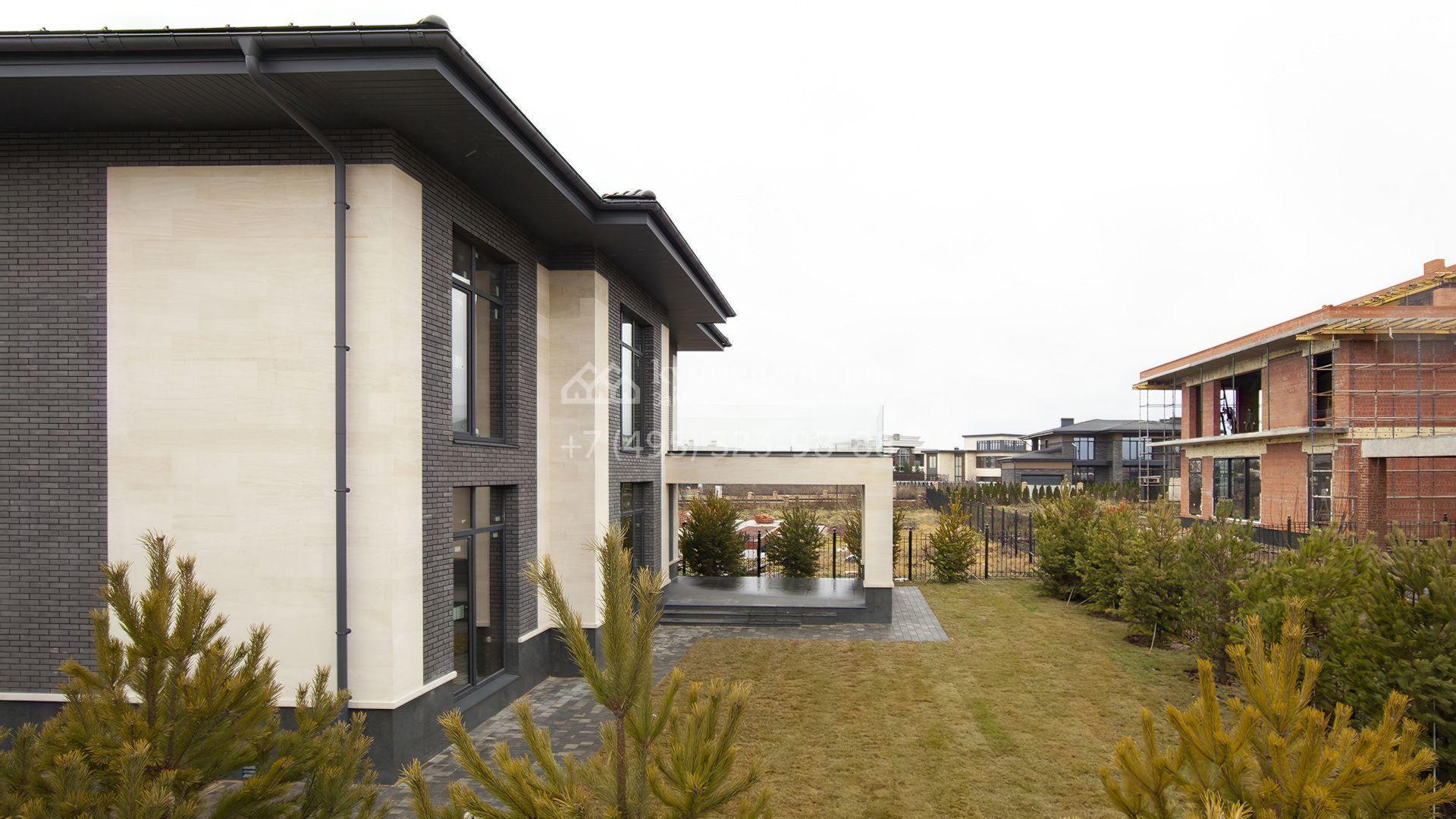 Планировка включает гостиную, объединенную в единое пространство с кухней-столовой, кабинет и 4 спальни, включая мастер-спальню с гардеробной и выходом на просторный балкон, откуда открывается живописный вид на поселок. Рядом с основным зданием предусмотрено место для парковки 2-х автомобилей. На территории с газоном и высаженными по периметру кустарниками и деревьями можно выполнить ландшафтный дизайн и обустроить бассейн, уютную беседку для барбекю или детскую площадку.