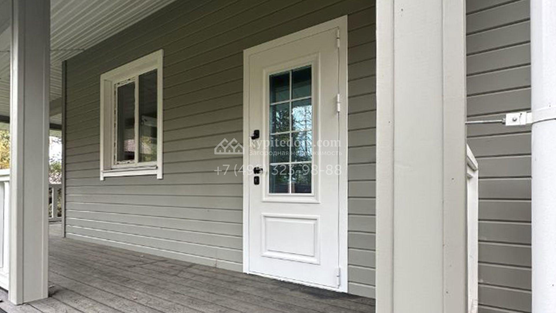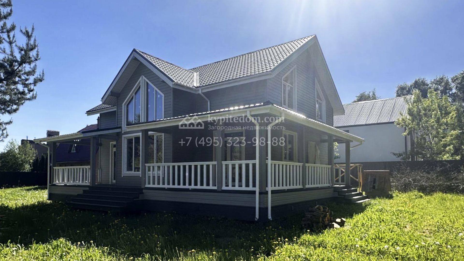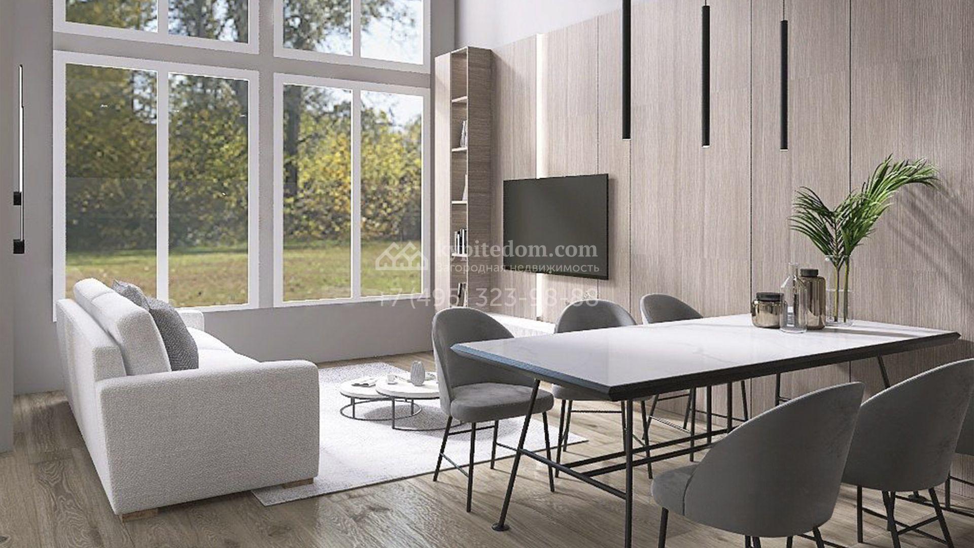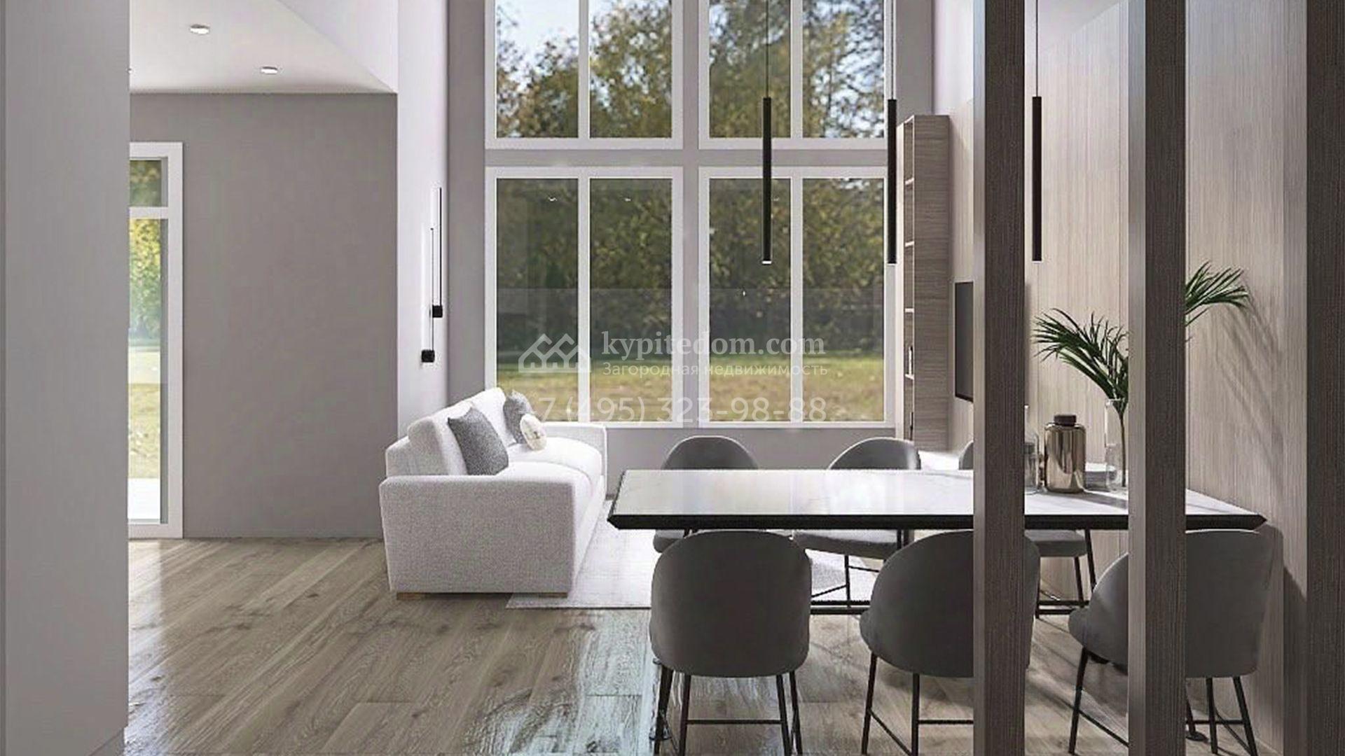 Новый загородный коттедж площадью 219 м² расположен на полевом участке 15 соток. Современный фасад облицован панелями с фактурой дерева благородного серого оттенка и дополнены белоснежными наличниками. Большие окна и второй свет наполняют дом светом и воздухом. Интерьеры выполнены в формате white box — чистовая отделка без финишных покрытий позволяет будущим владельцам реализовать любые дизайнерские решения и выбрать мебель и технику согласно своим предпочтениям. Планировка включает просторную гостиную-кухню-столовую с выходом на террасу и 3 спальни, включая мастер-спальню с гардеробной. Участок правильной формы благоустроен — здесь засеян газон и растут декоративные деревья.