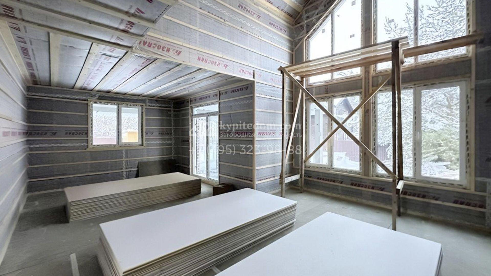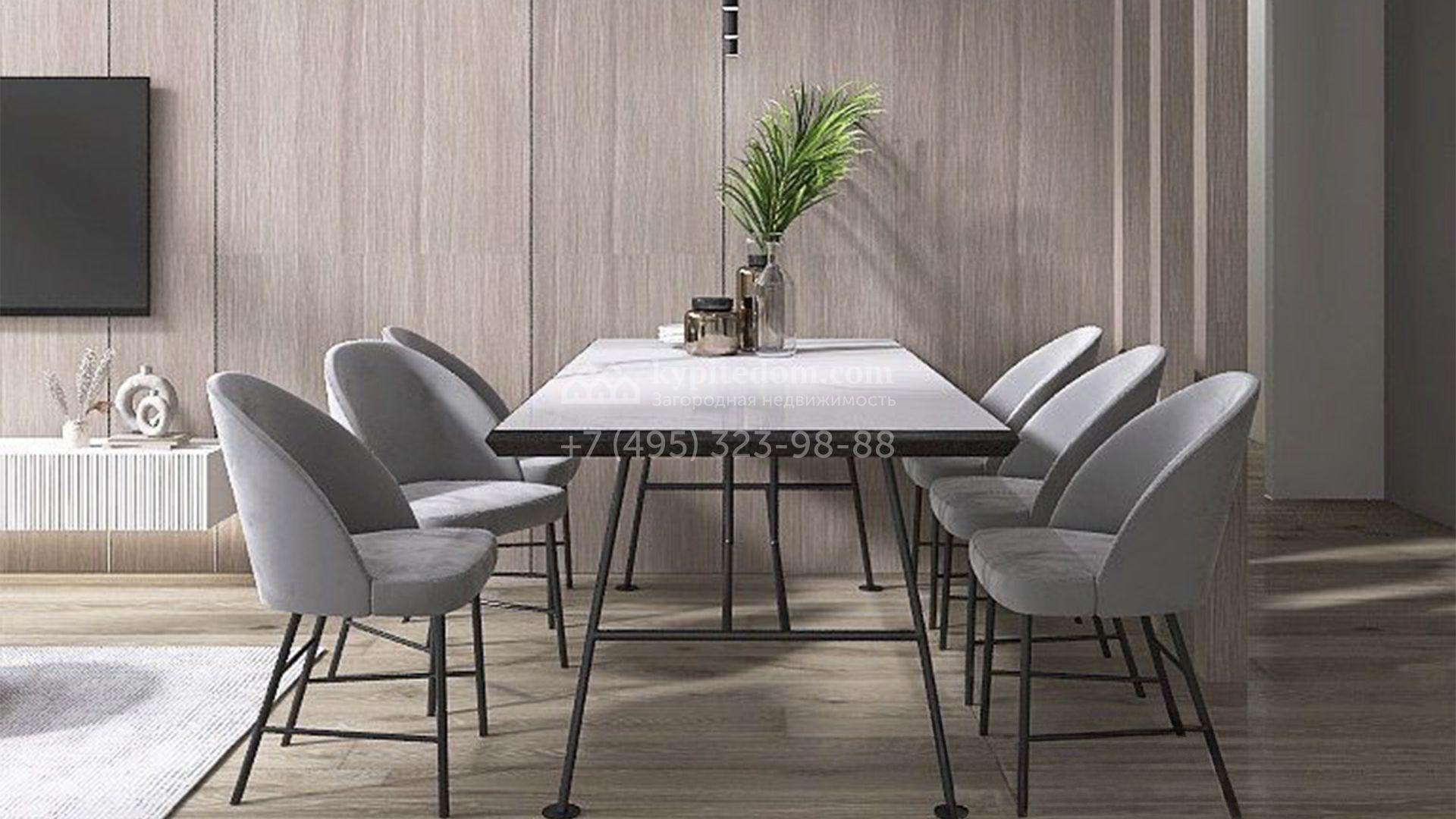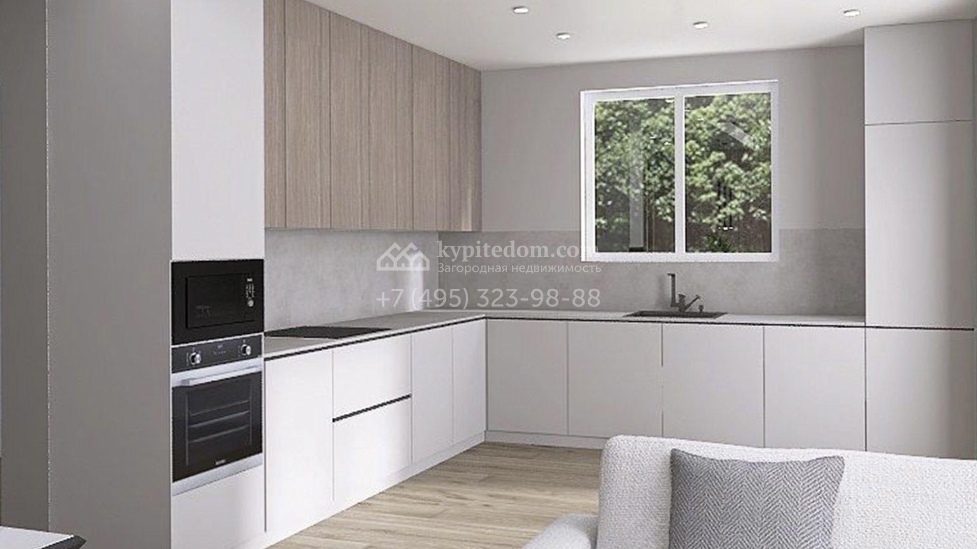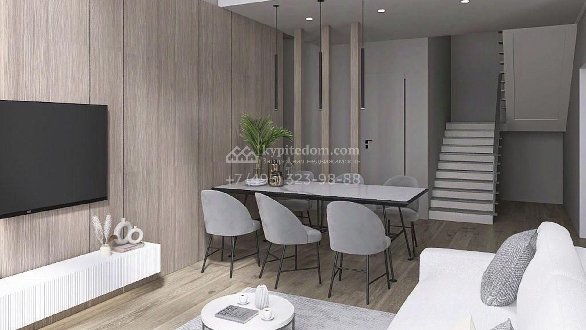 Новый загородный коттедж площадью 219 м² расположен на полевом участке 15 соток. Современный фасад облицован панелями с фактурой дерева благородного серого оттенка и дополнены белоснежными наличниками. Большие окна и второй свет наполняют дом светом и воздухом. Интерьеры выполнены в формате white box — чистовая отделка без финишных покрытий позволяет будущим владельцам реализовать любые дизайнерские решения и выбрать мебель и технику согласно своим предпочтениям. Планировка включает просторную гостиную-кухню-столовую с выходом на террасу и 3 спальни, включая мастер-спальню с гардеробной. Участок правильной формы благоустроен — здесь засеян газон и растут декоративные деревья.
