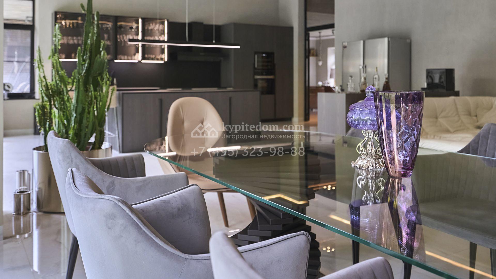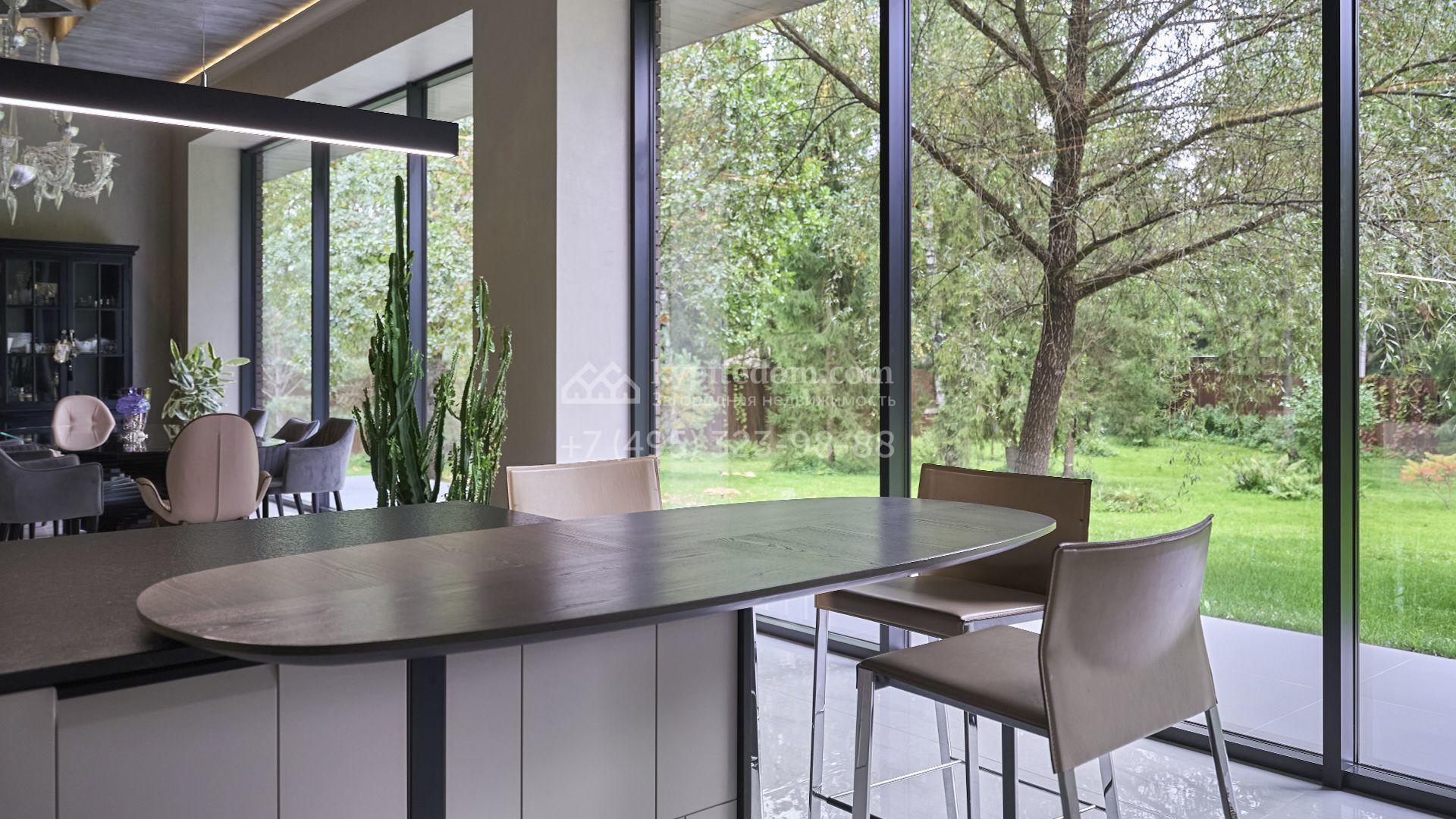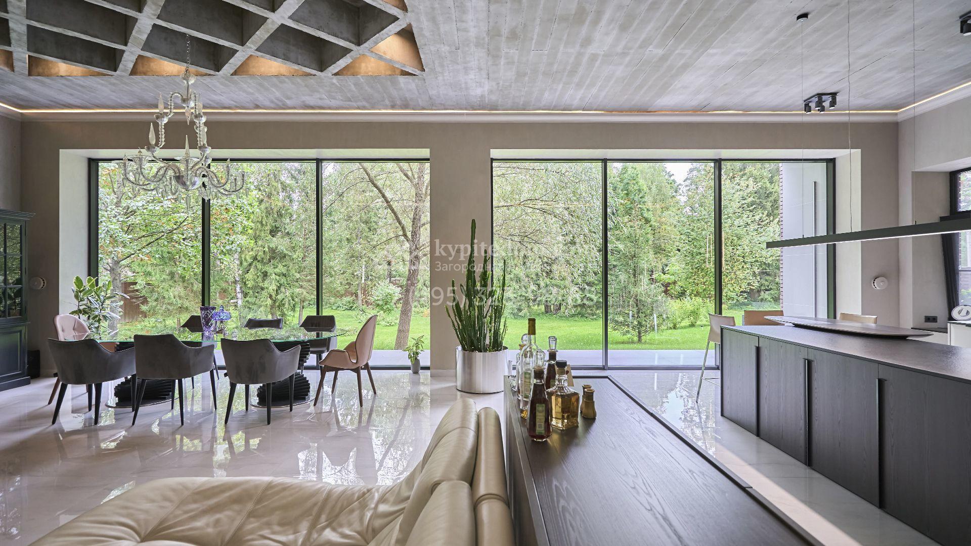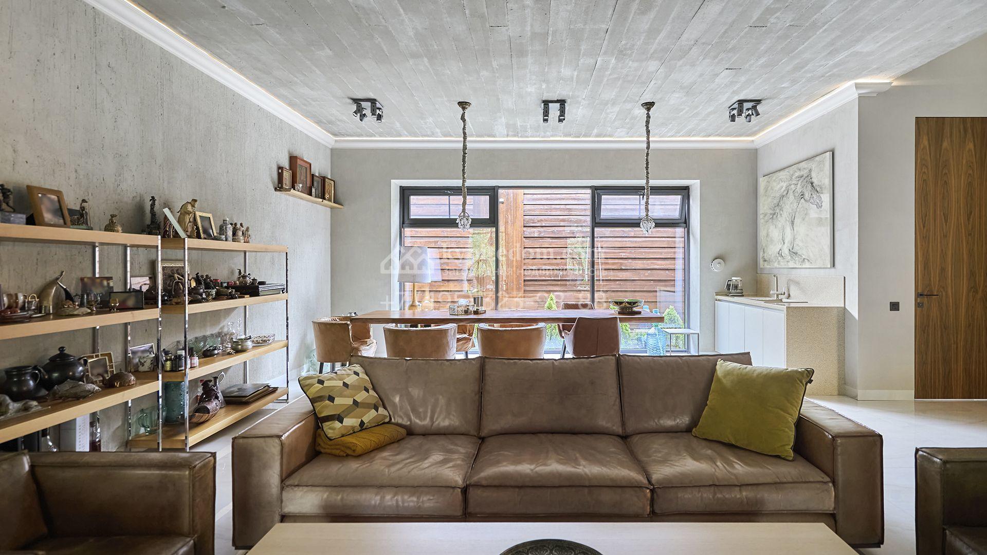 Панорамные окна с алюминиевым профилем стирают грань между природным окружением и внутренним пространством, наполняя его солнечными лучами. Интерьеры выдержаны в светлых тонах, а также дополнены изящными светильниками и элементами с фактурой бетона, отсылающими к стилю лофт. Дом полностью укомплектован комфортной мебелью и встроенной бытовой техникой.