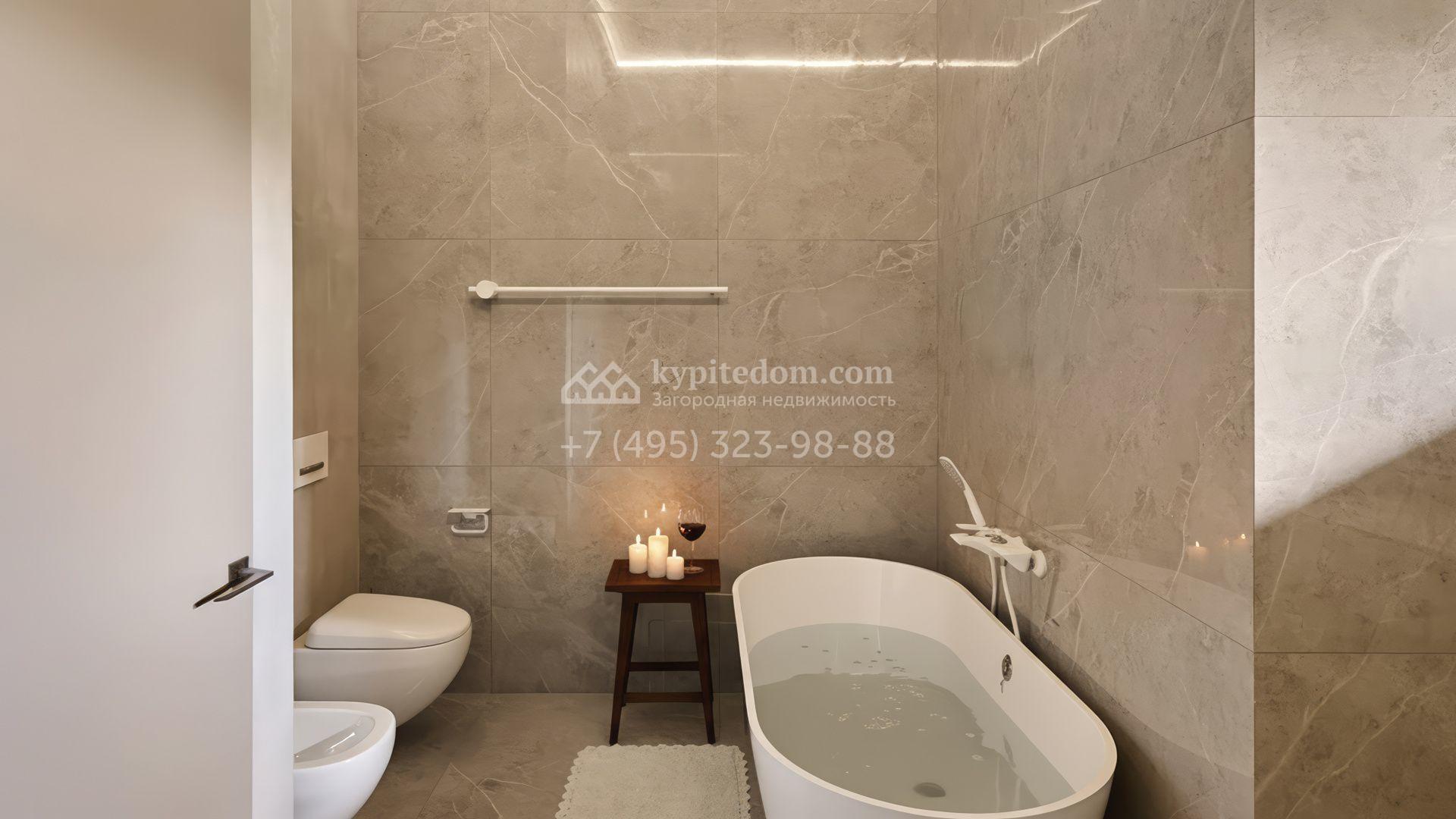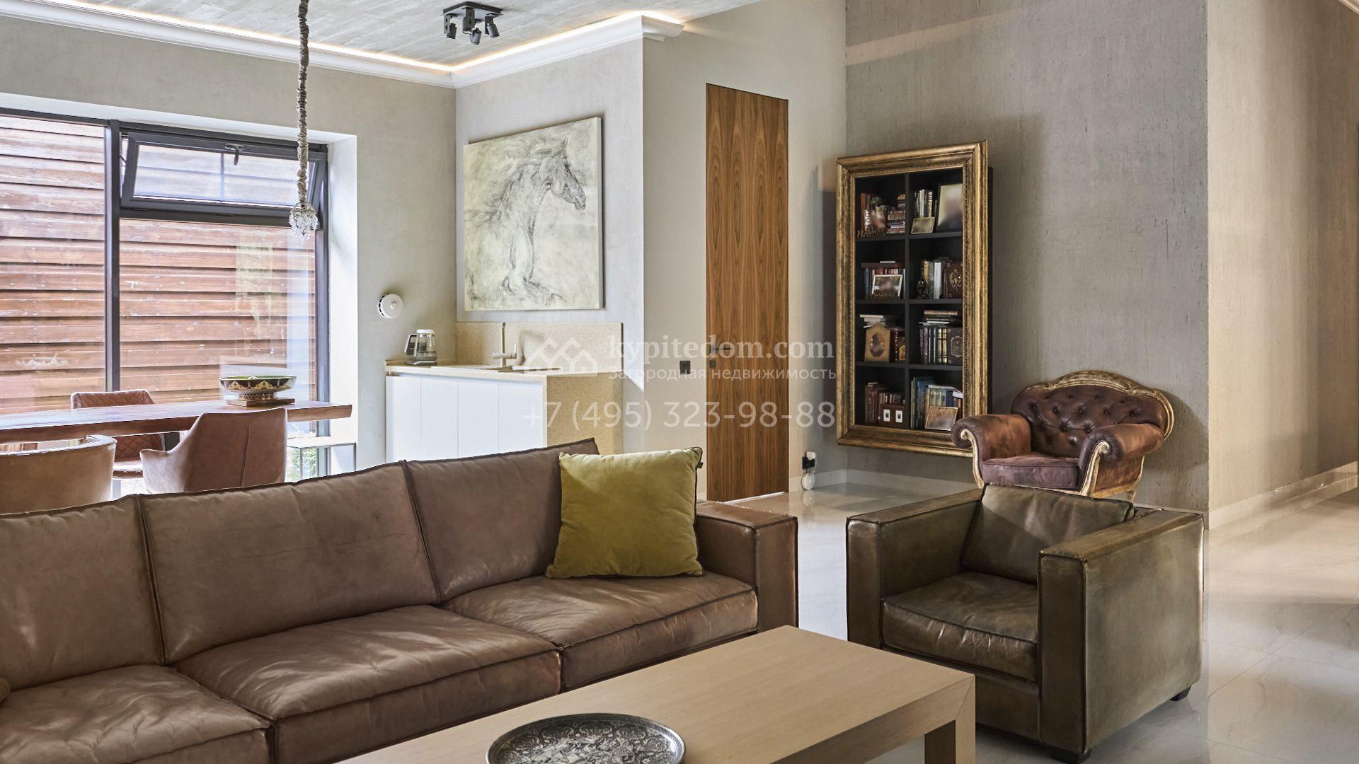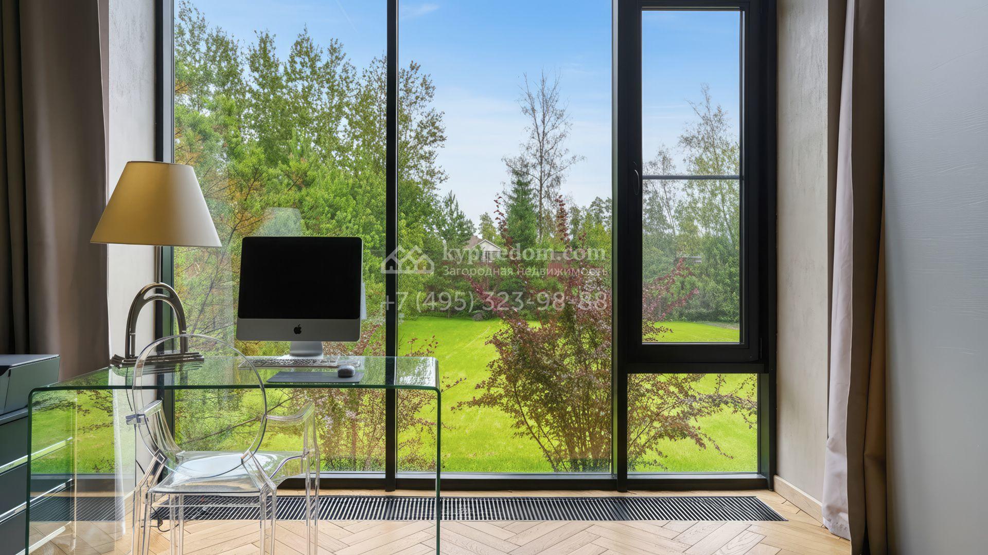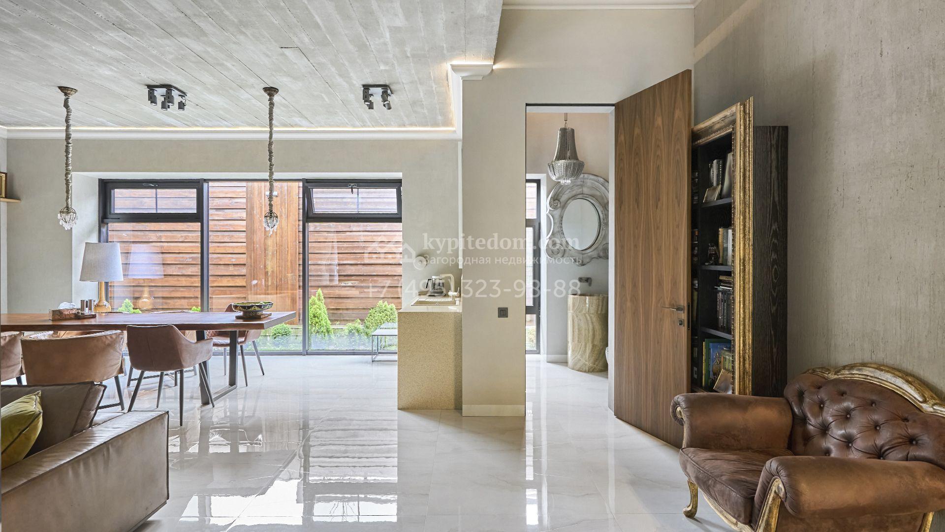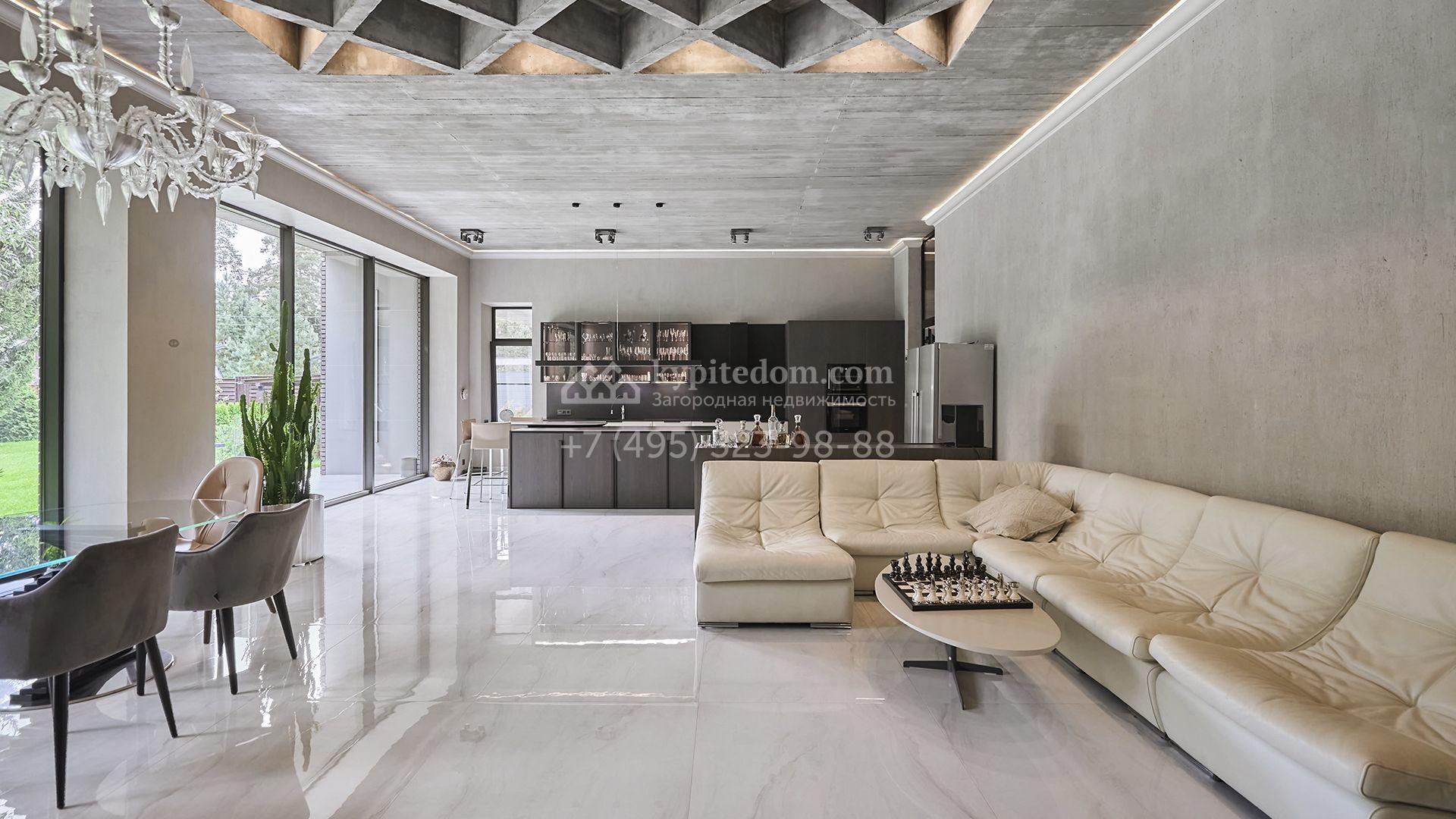 Панорамные окна с алюминиевым профилем стирают грань между природным окружением и внутренним пространством, наполняя его солнечными лучами. Интерьеры выдержаны в светлых тонах, а также дополнены изящными светильниками и элементами с фактурой бетона, отсылающими к стилю лофт. Дом полностью укомплектован комфортной мебелью и встроенной бытовой техникой.