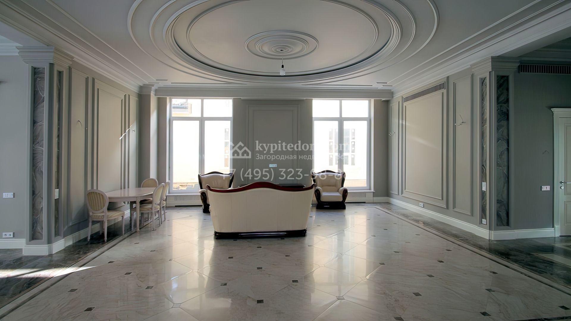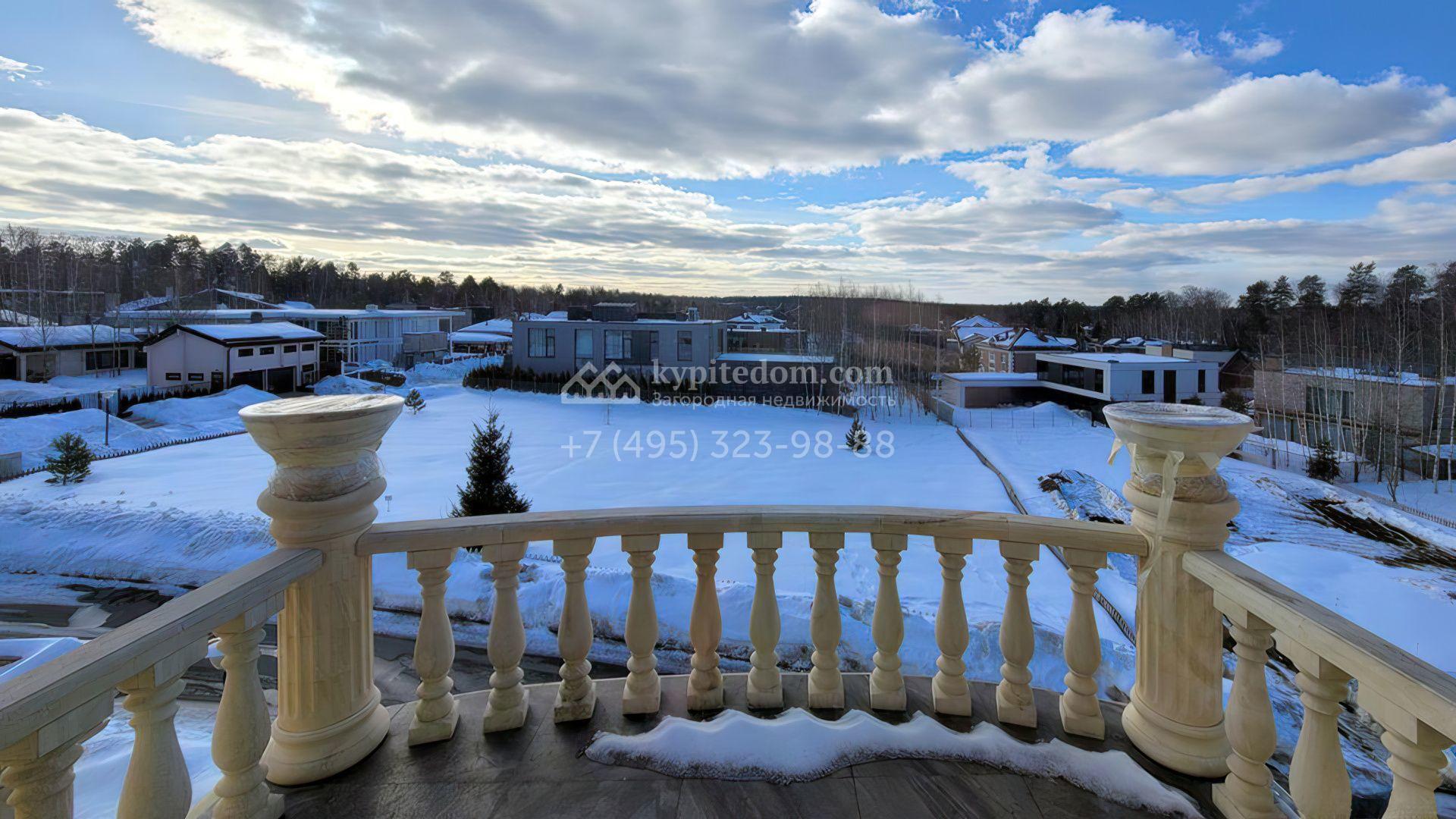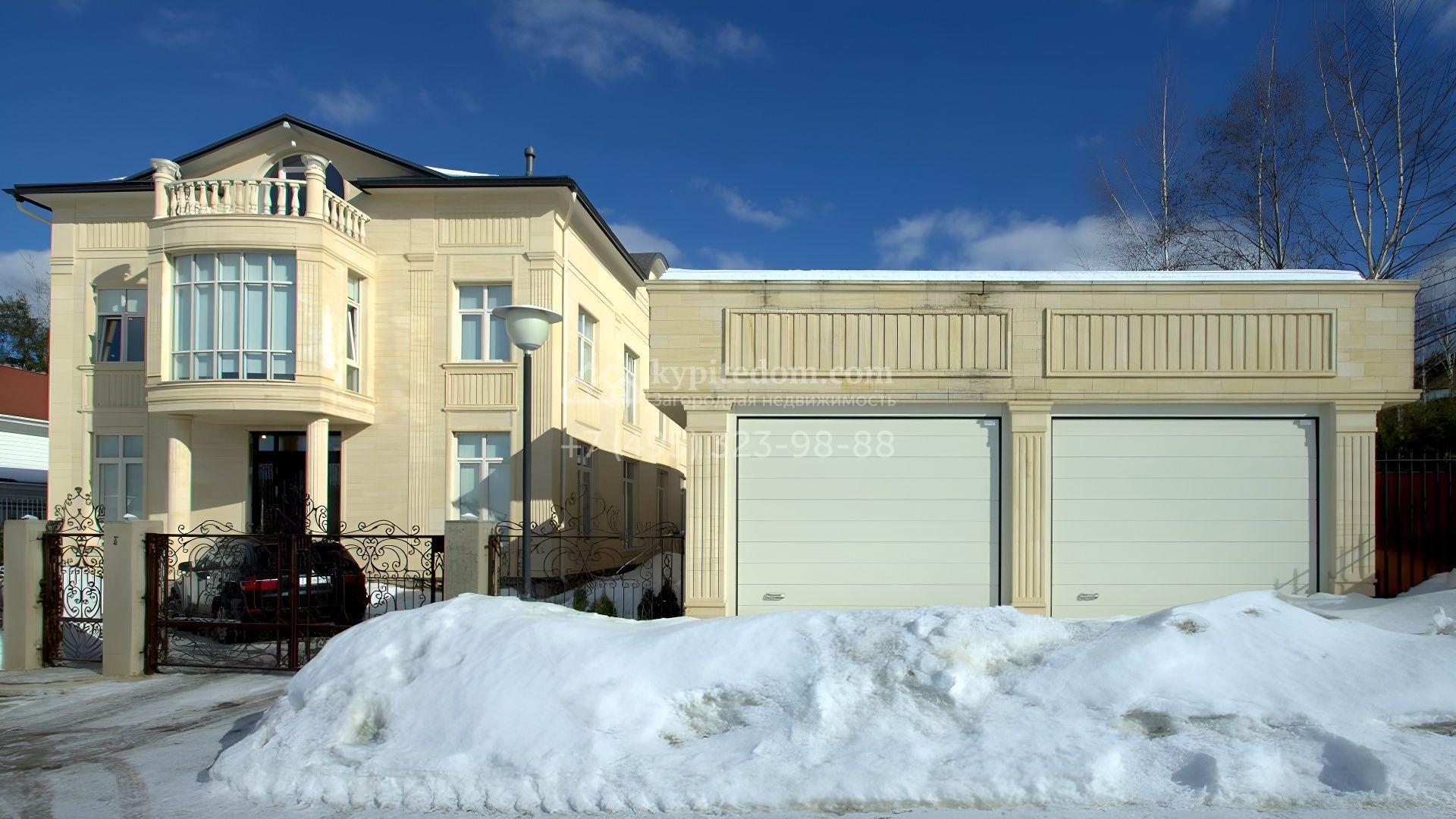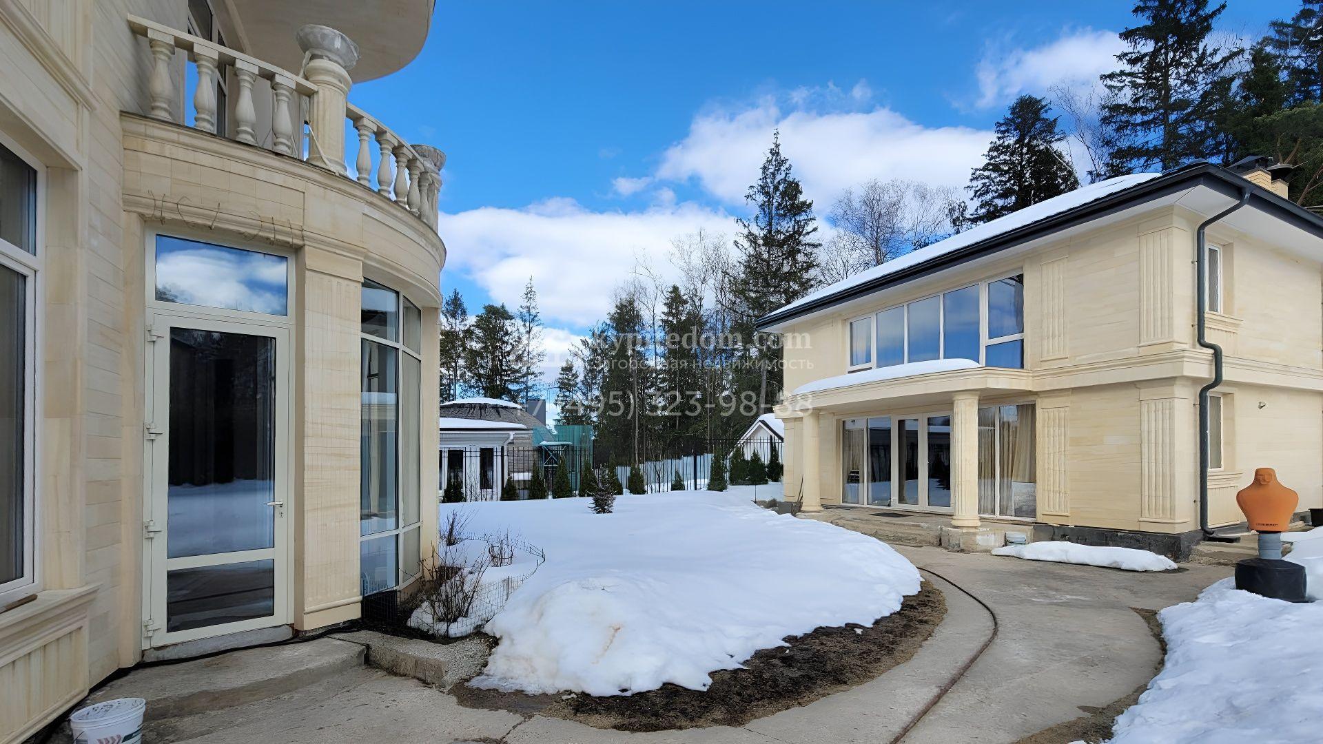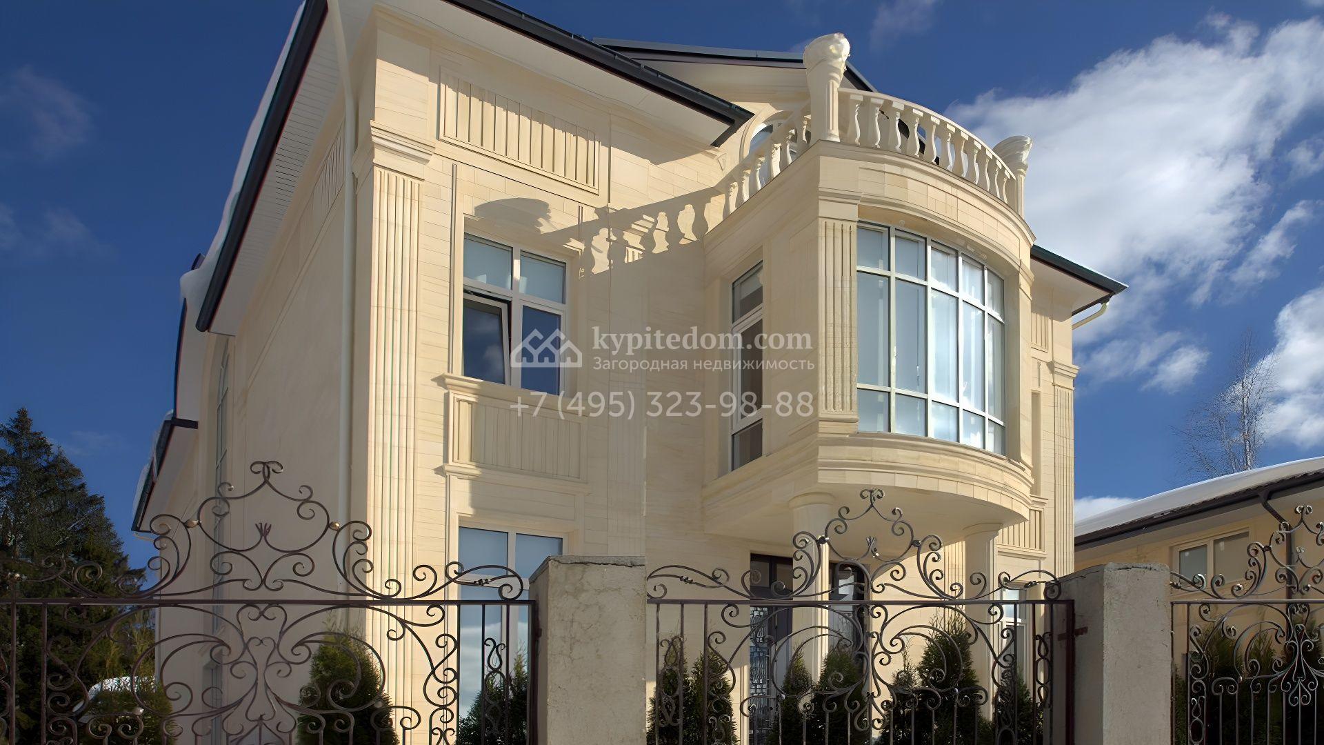 Загородная резиденция площадью 525 м² расположена на полевом участке 14 соток. Здание спроектировано в неоклассическом стиле и облицовано камнем песочного оттенка. Фасад украшен колоннами, пилястрами, открытыми балконами с балюстрадами и эркером. Высокие потолки, большая площадь остекления и спланированный второй свет наполняют пространство естественным светом и теплом.