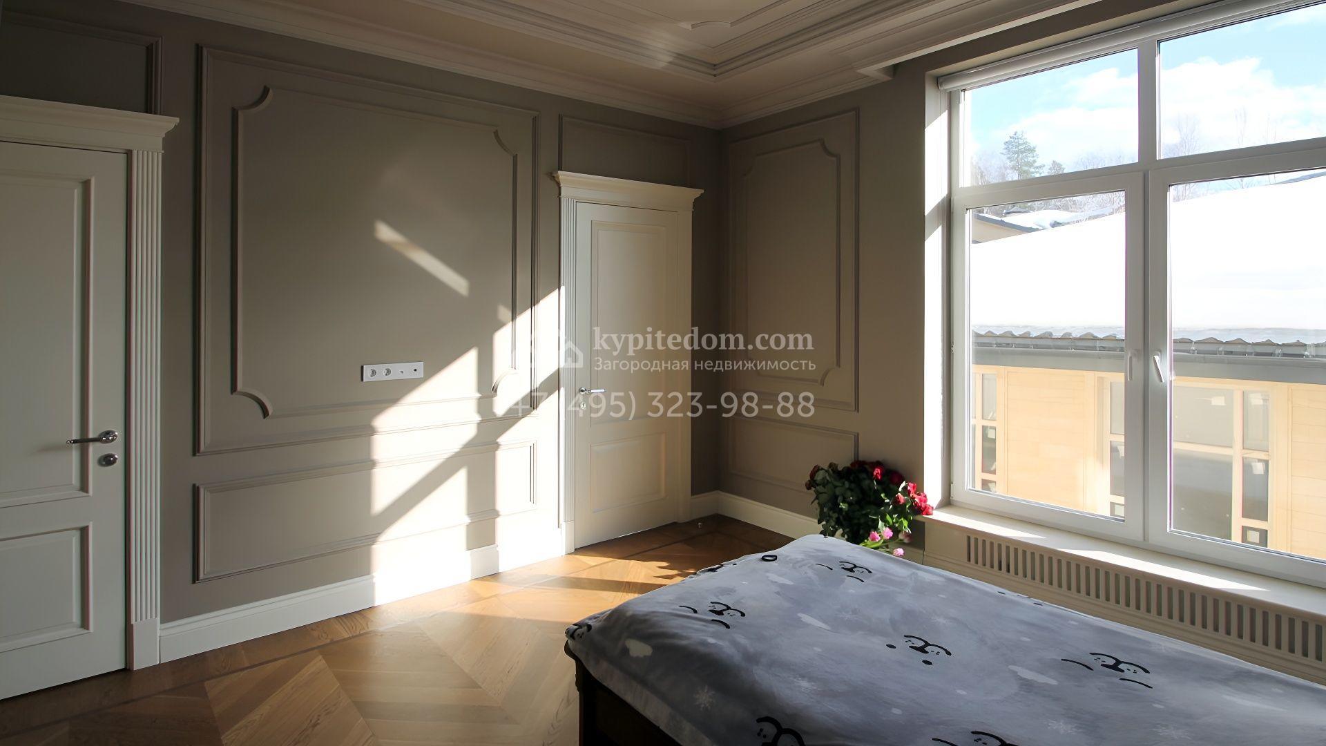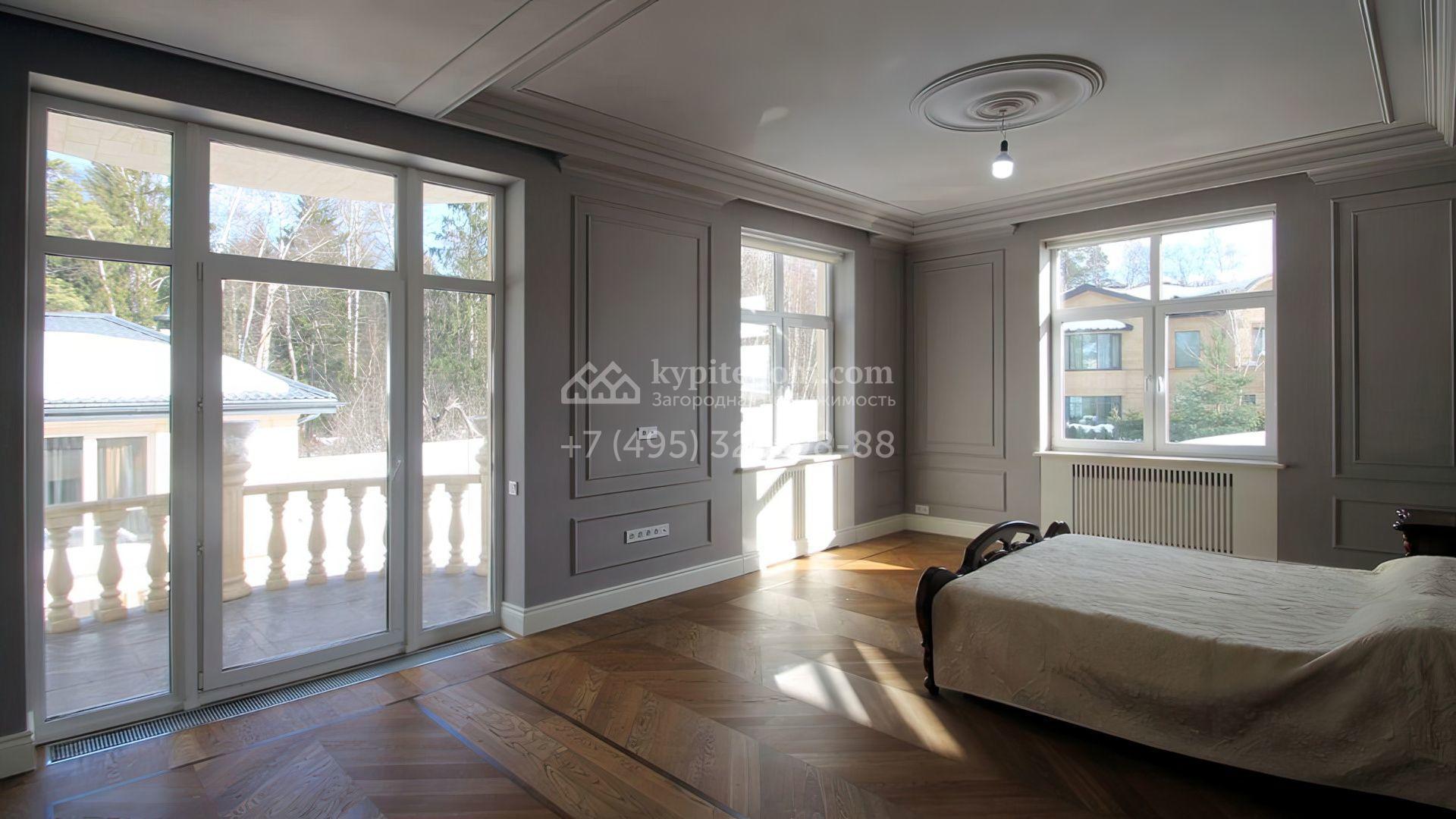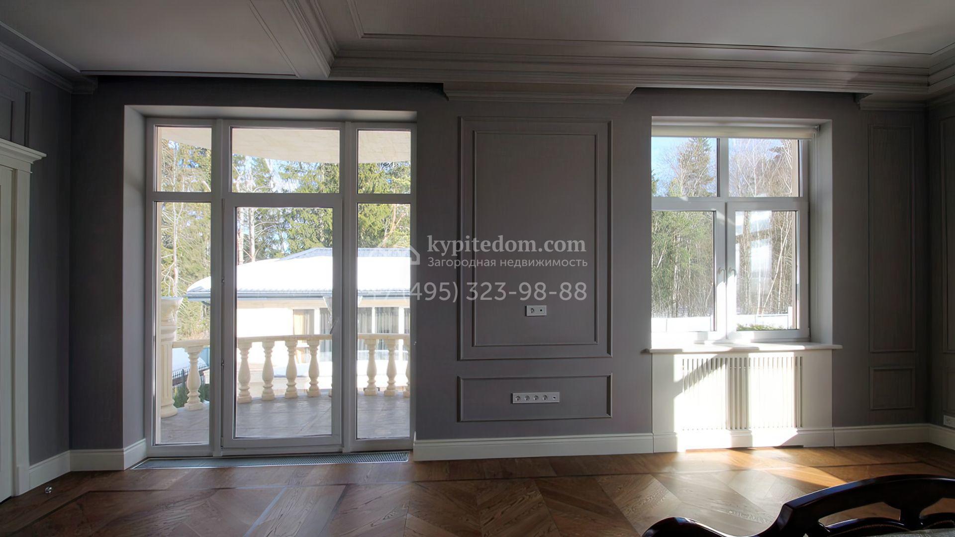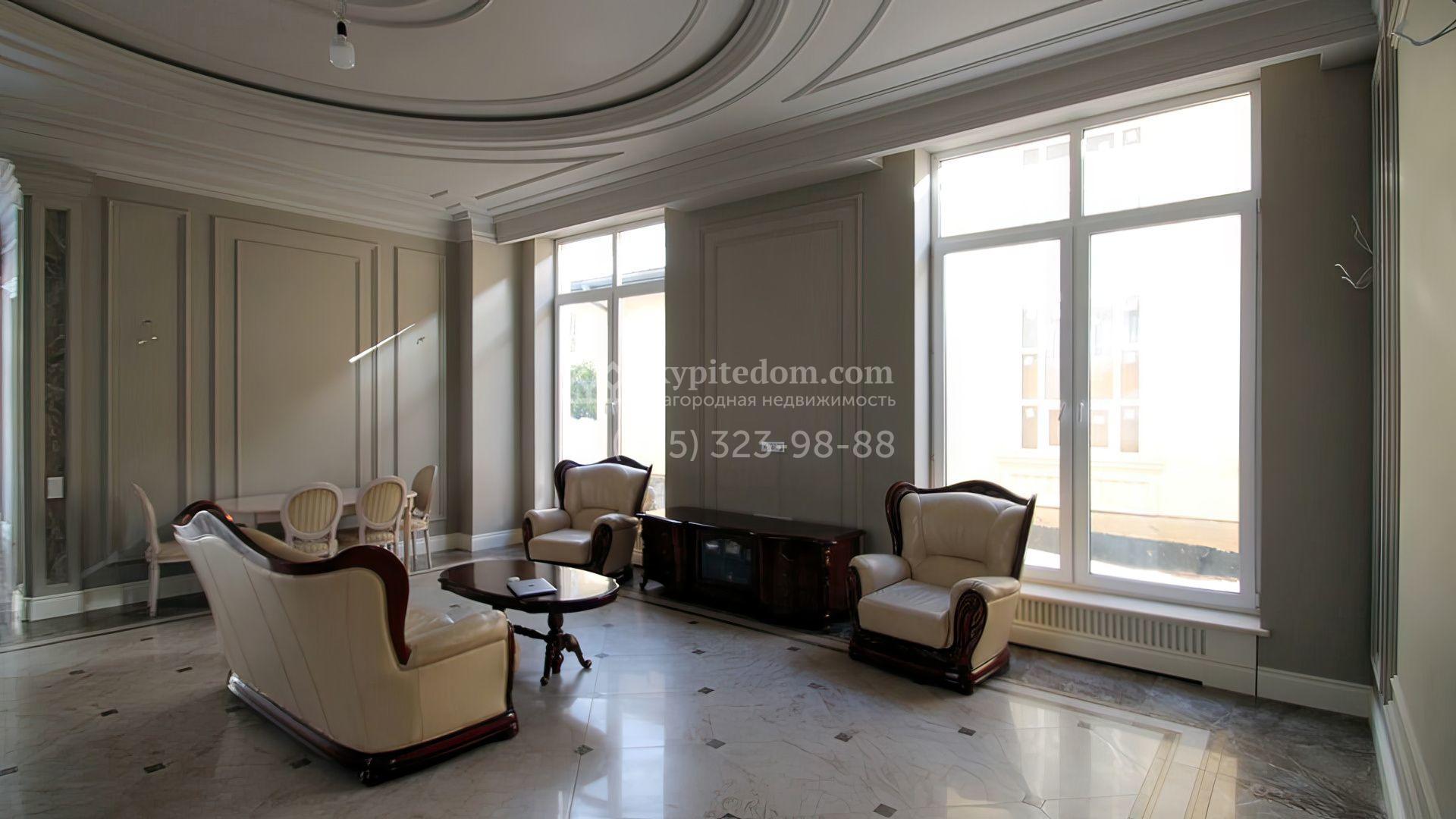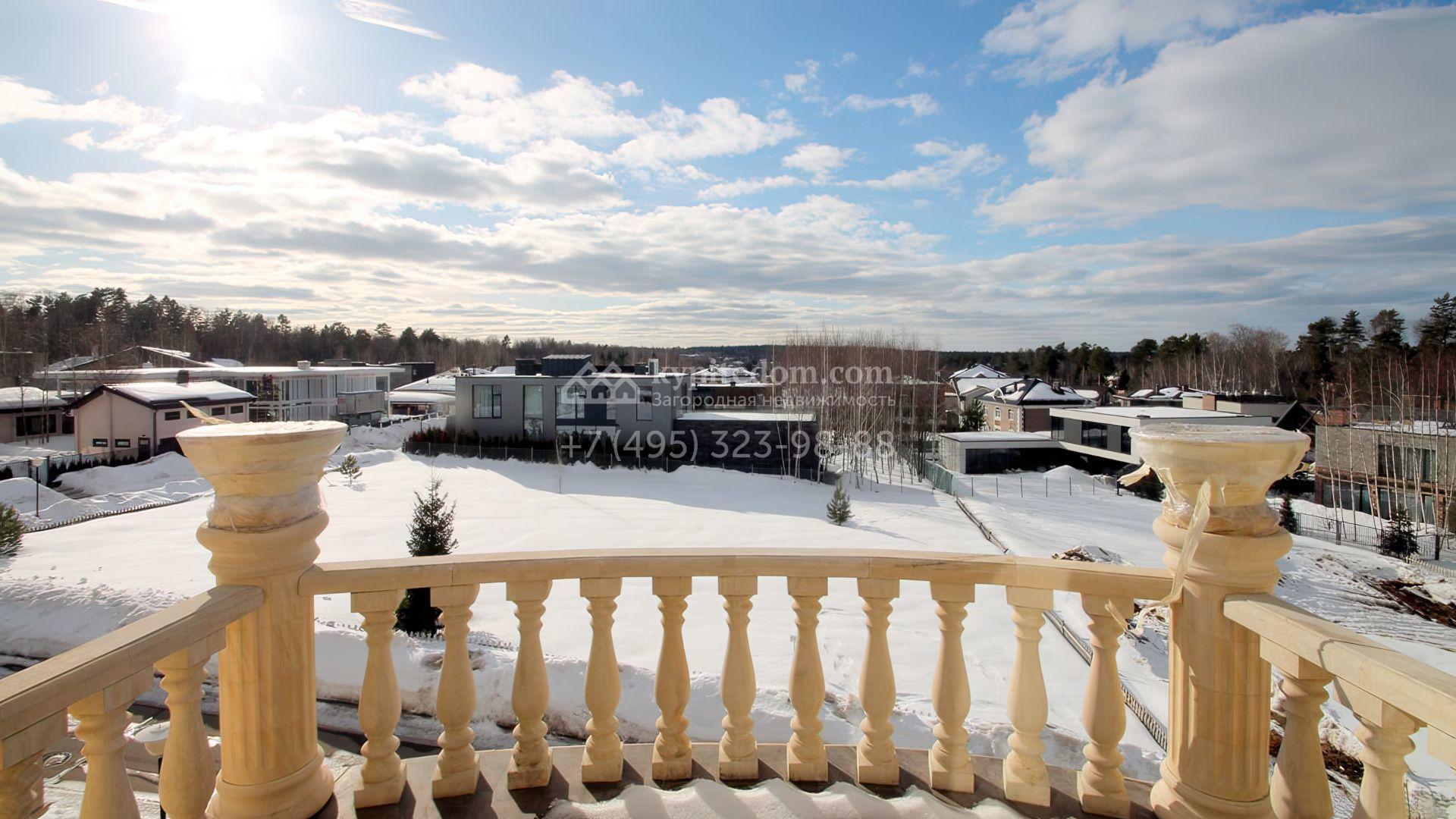 Загородная резиденция площадью 525 м² расположена на полевом участке 14 соток. Здание спроектировано в неоклассическом стиле и облицовано камнем песочного оттенка. Фасад украшен колоннами, пилястрами, открытыми балконами с балюстрадами и эркером. Высокие потолки, большая площадь остекления и спланированный второй свет наполняют пространство естественным светом и теплом.