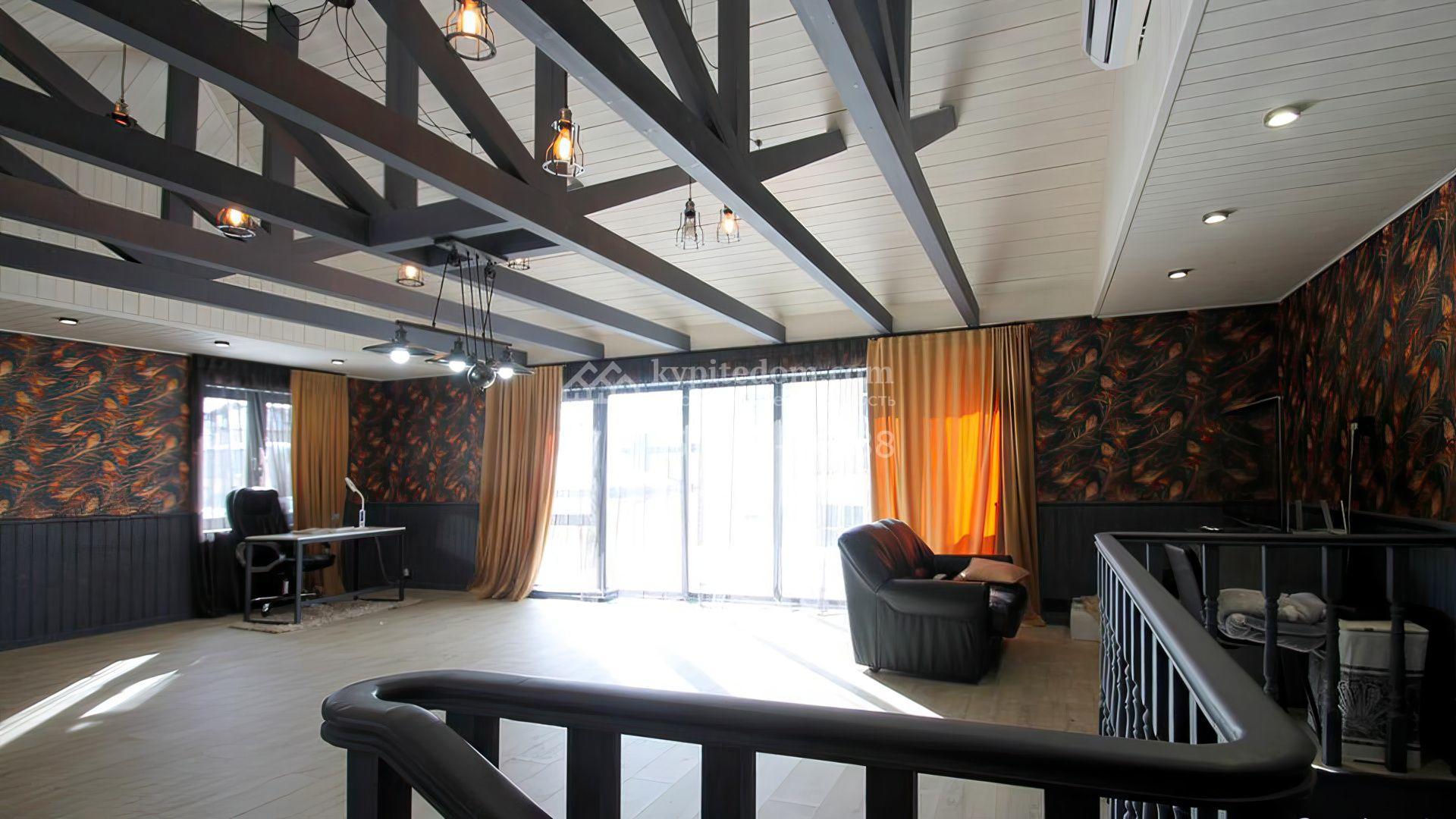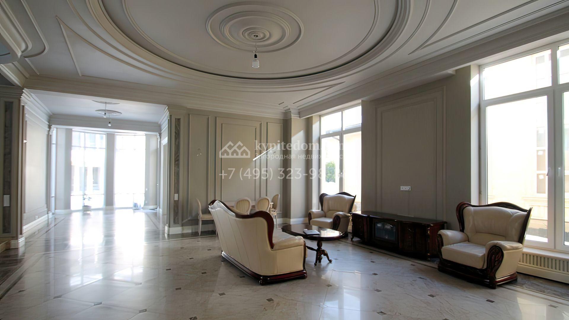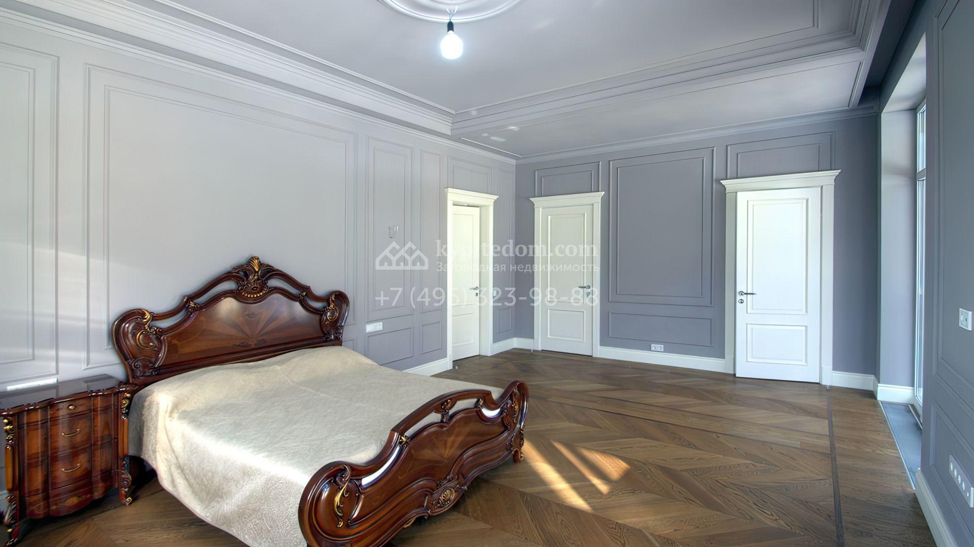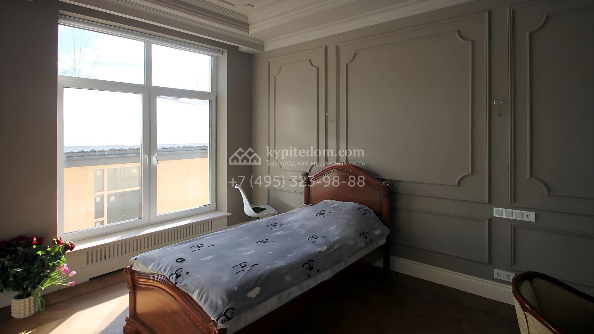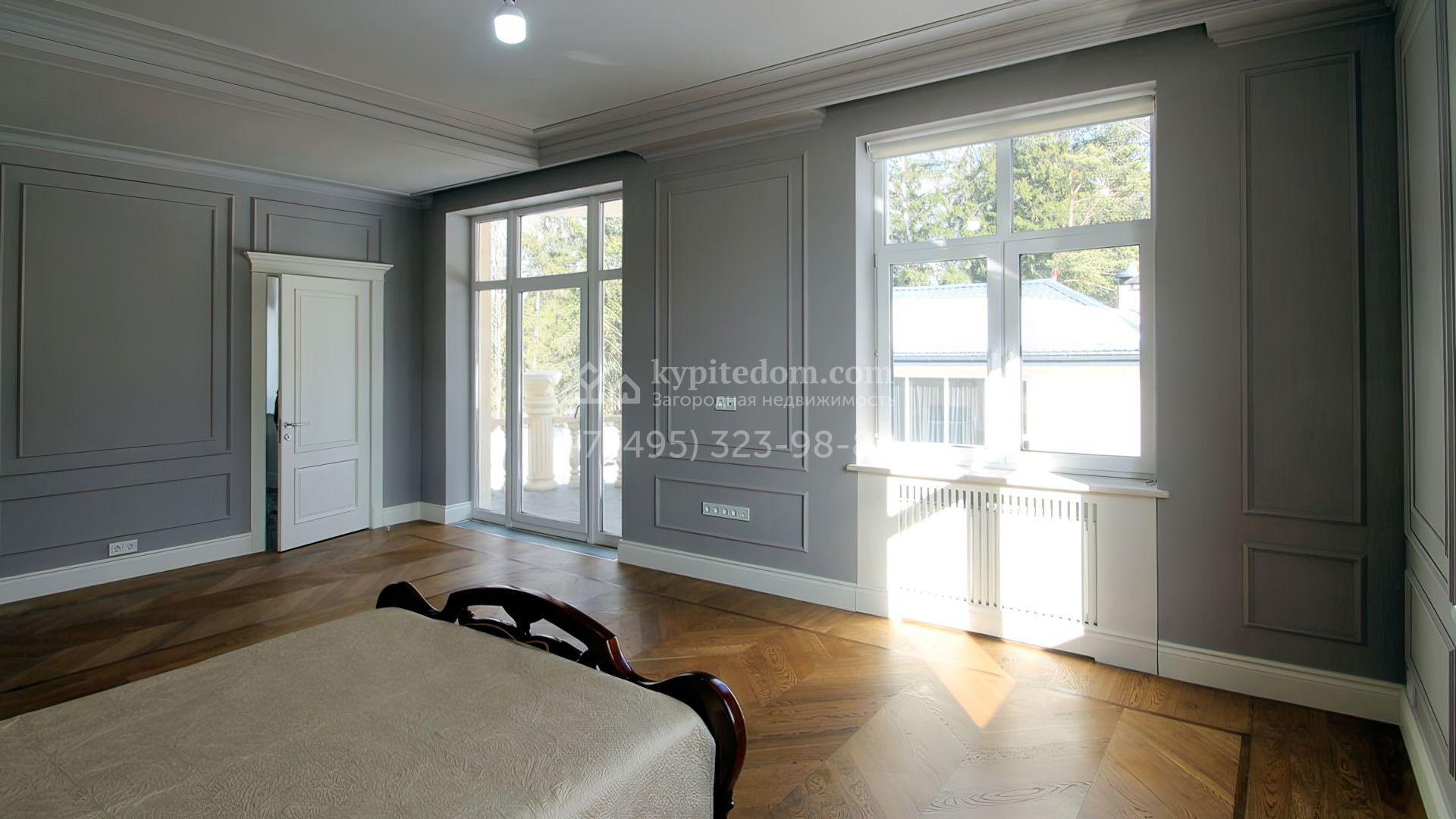 Загородная резиденция площадью 525 м² расположена на полевом участке 14 соток. Здание спроектировано в неоклассическом стиле и облицовано камнем песочного оттенка. Фасад украшен колоннами, пилястрами, открытыми балконами с балюстрадами и эркером. Высокие потолки, большая площадь остекления и спланированный второй свет наполняют пространство естественным светом и теплом.