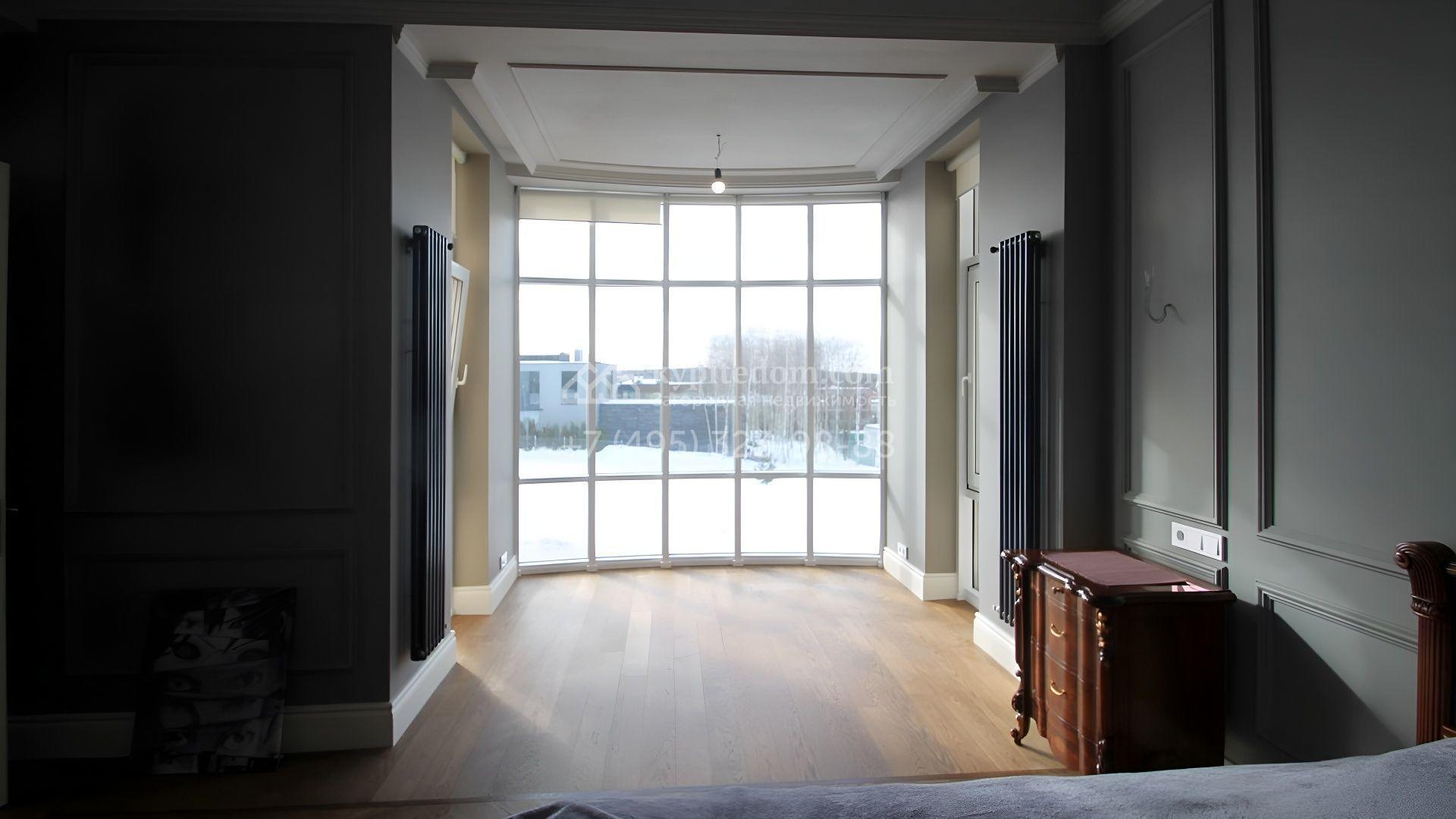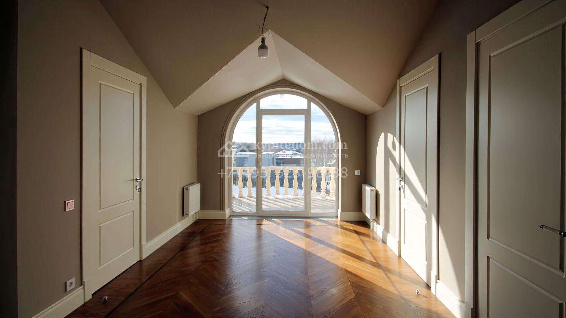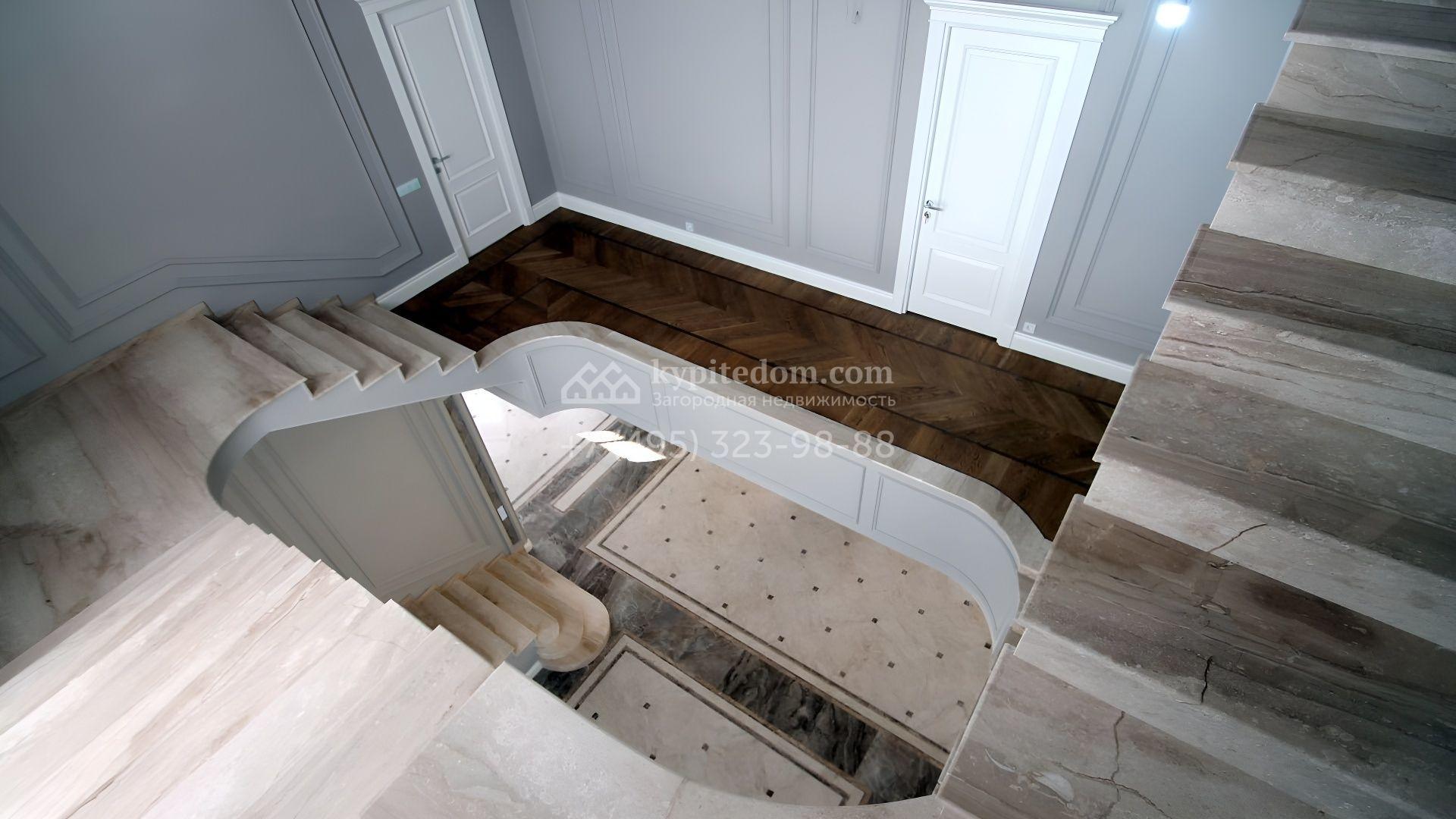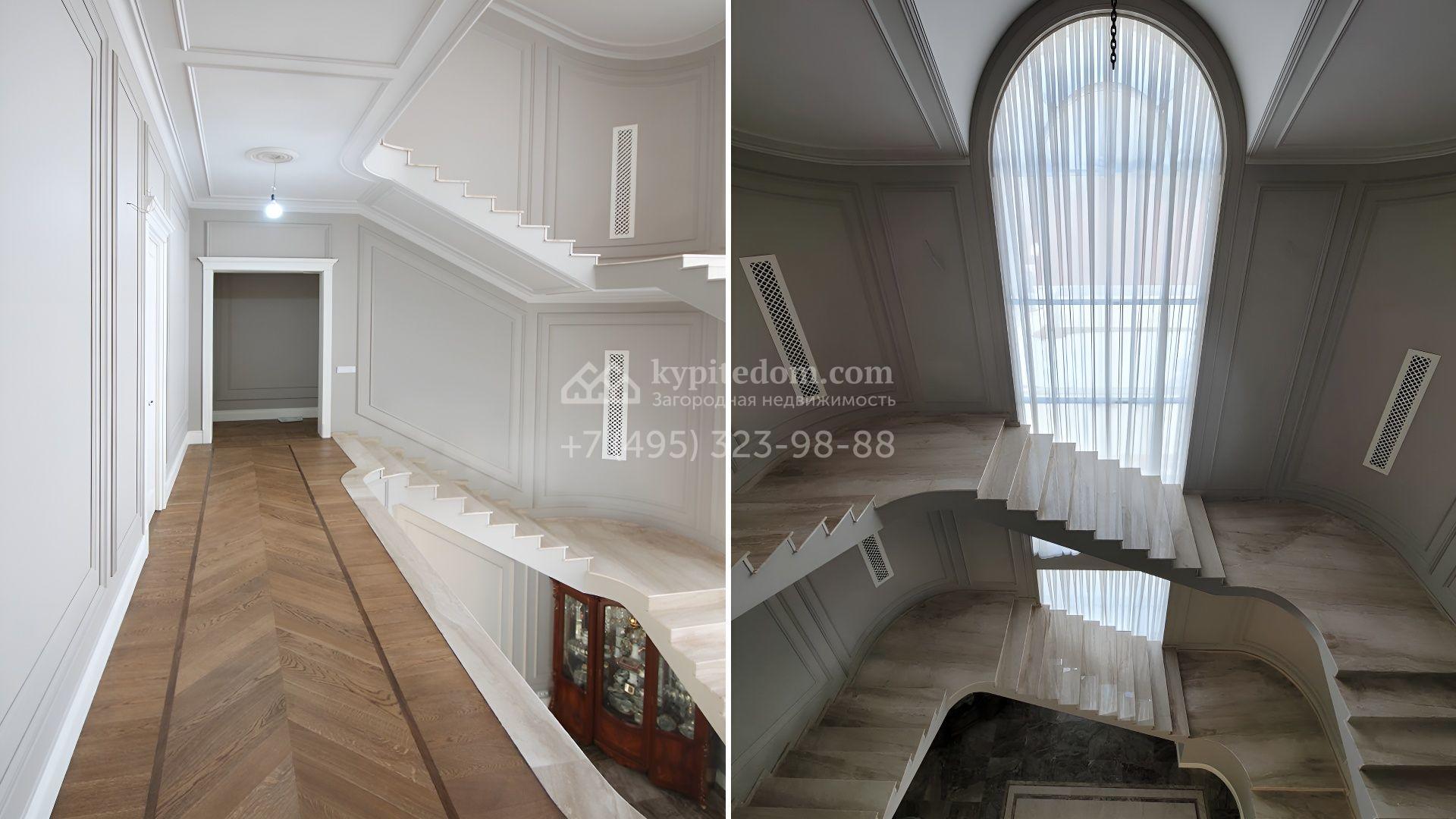 Внутреннее оформление выполнено с авторским подходом и выдержано в общей стилистике с домом. Для отделки использованы высококачественные и натуральные материалы — на полу выложены паркетная доска «французская елочка» и плитка с мраморной фактурой. Потолки и стены подчеркиваются декоративными молдингами. Композиционным центром стала лестница с плавными контурами и арочным окном рядом, пропускающим мягкий свет, который добавляет ощущение простора и воздушности.