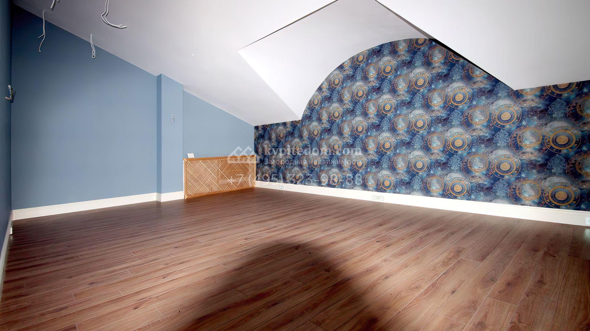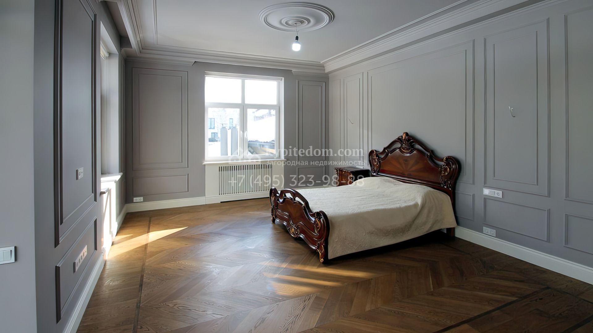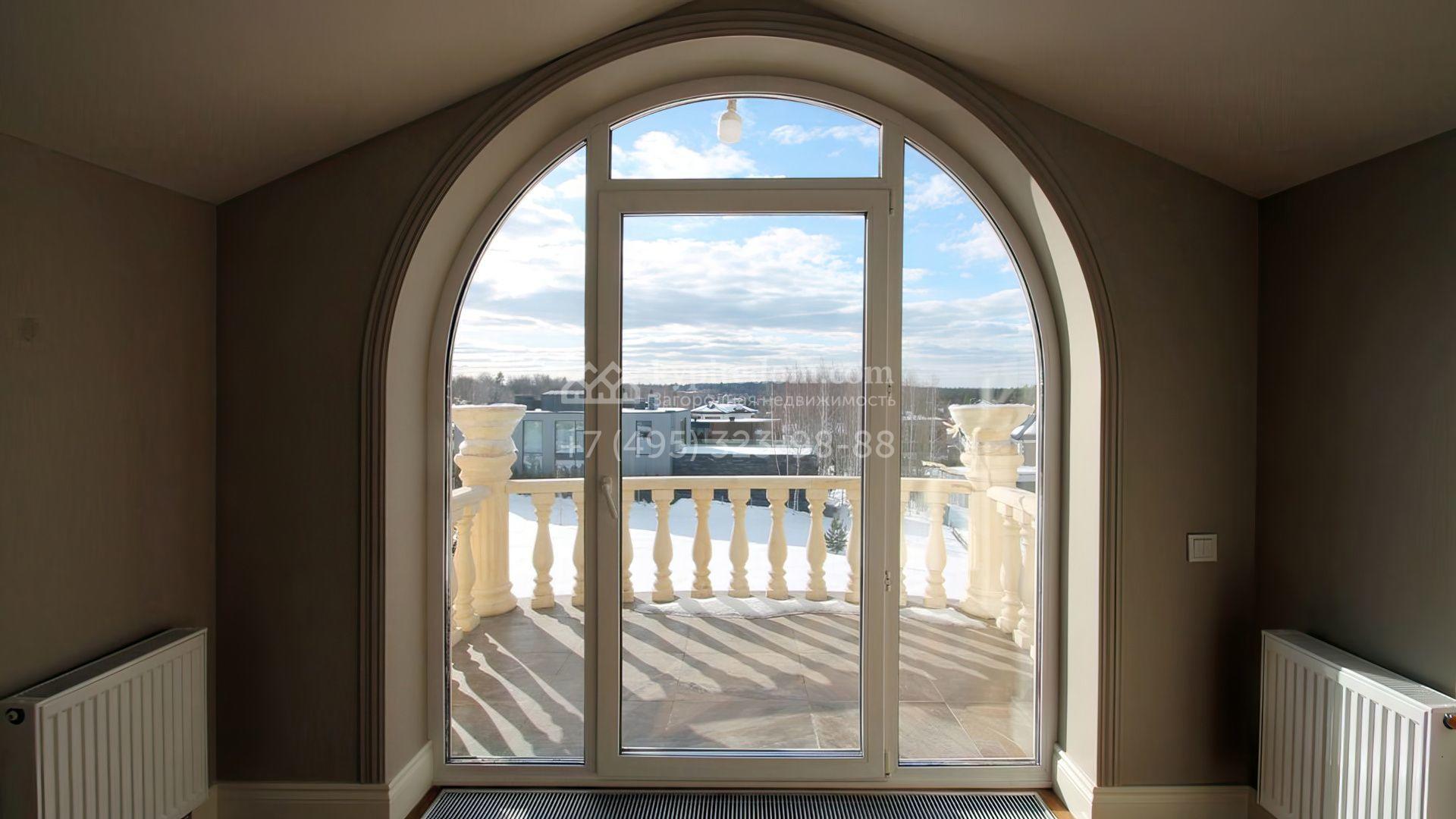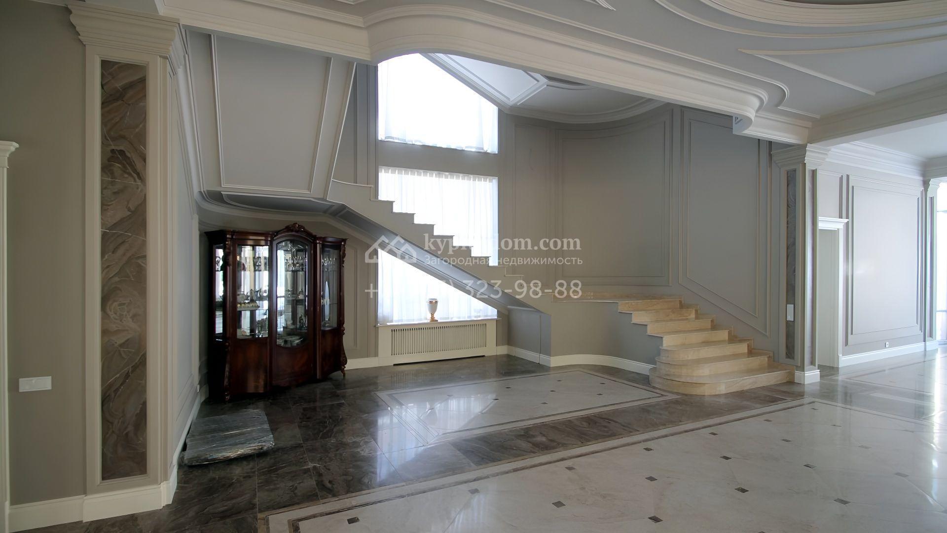 Внутреннее оформление выполнено с авторским подходом и выдержано в общей стилистике с домом. Для отделки использованы высококачественные и натуральные материалы — на полу выложены паркетная доска «французская елочка» и плитка с мраморной фактурой. Потолки и стены подчеркиваются декоративными молдингами. Композиционным центром стала лестница с плавными контурами и арочным окном рядом, пропускающим мягкий свет, который добавляет ощущение простора и воздушности.