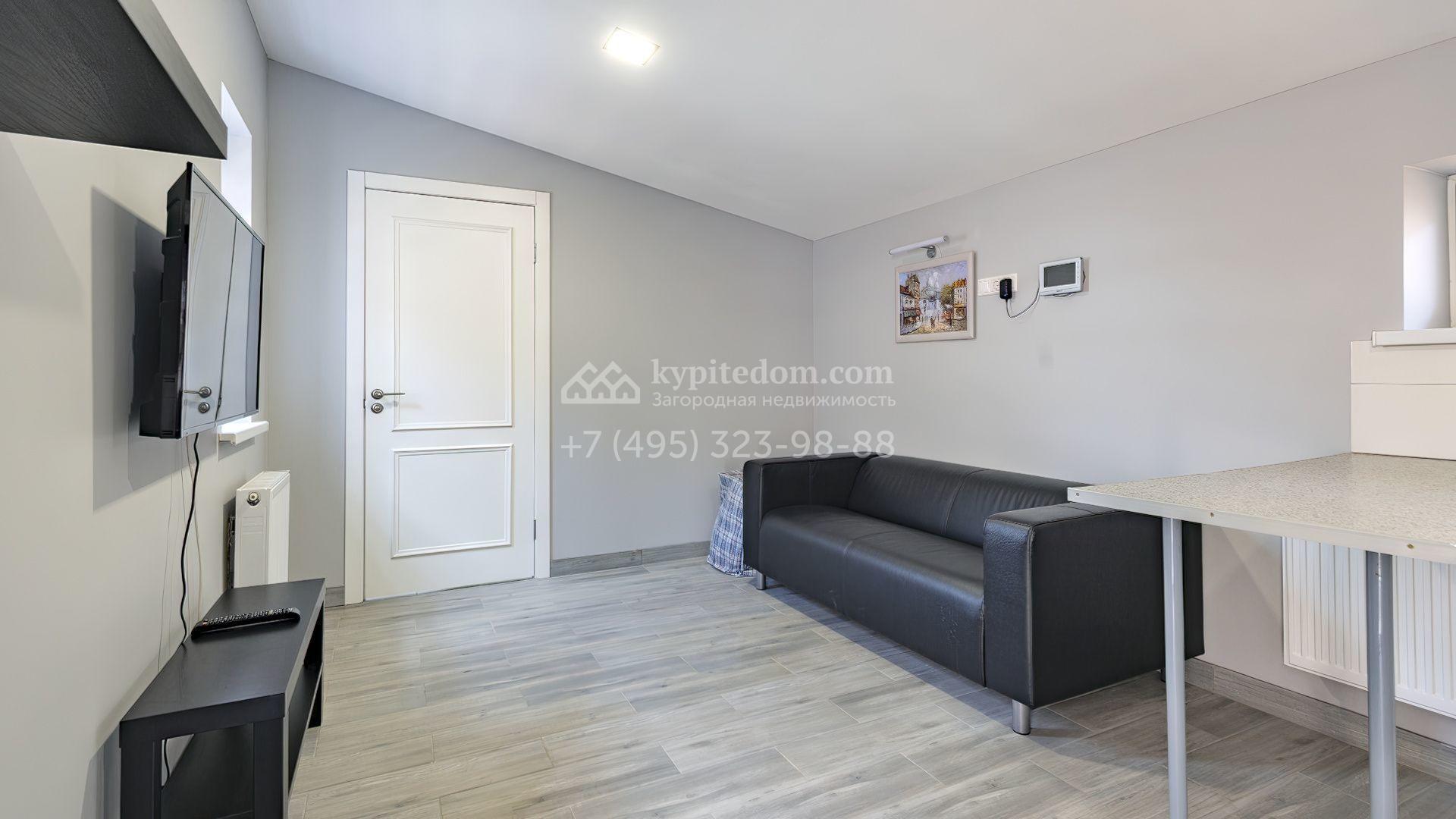 Рядом с основным зданием построен гостевой дом площадью 60 м², в котором разместили дровяную баню, квартиру для персонала, хозяйственные помещения и навес для автомобилей. Кроме того, на территории предусмотрены большая открытая парковочная площадка и скоростная зарядка для электромобиля. На участке выполнен ландшафтный дизайн, засеян газон, высажены деревья, кустарники и туи по периметру для создания атмосферы уединения, вымощены дорожки и оборудована скважина для полива.