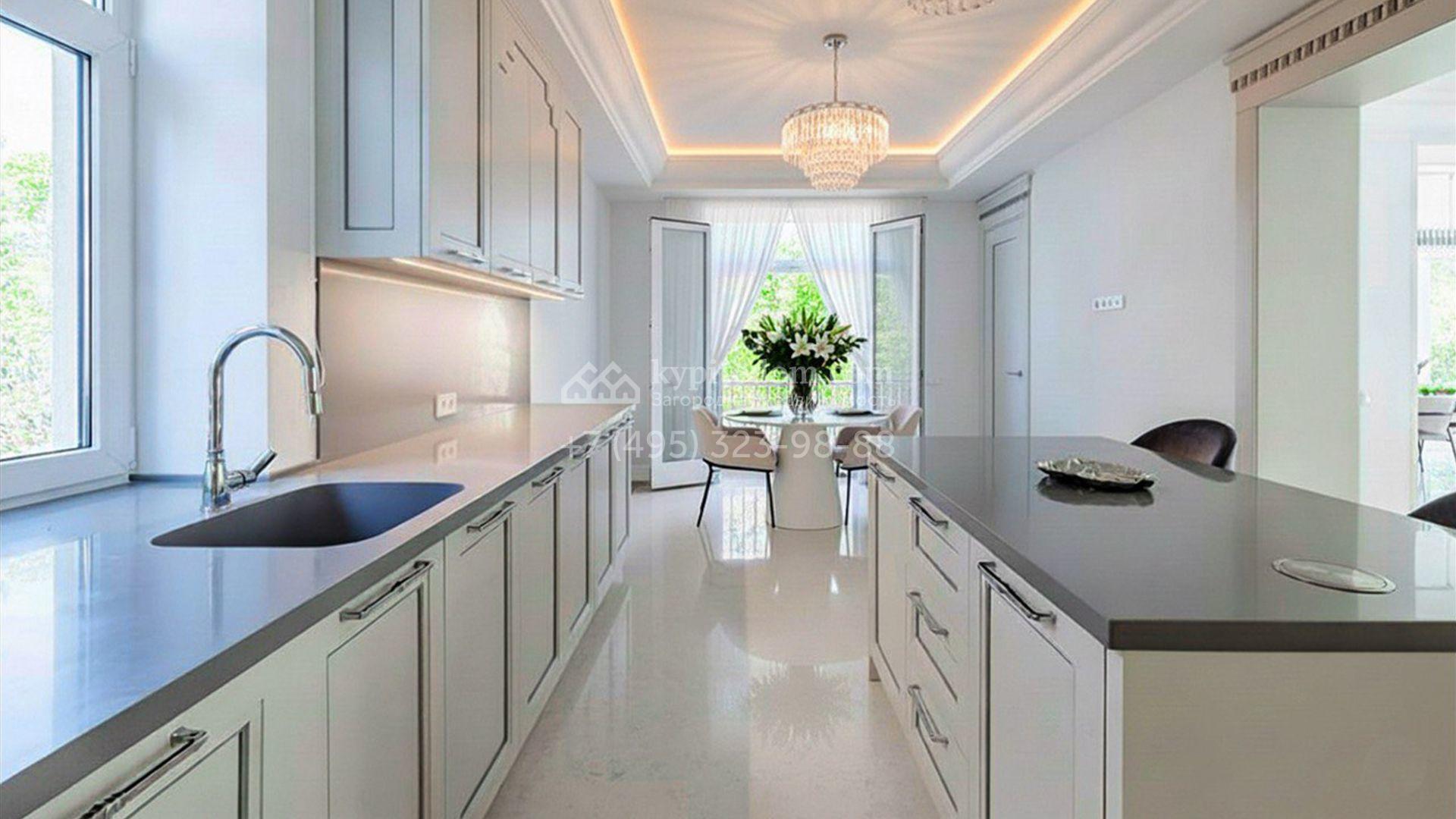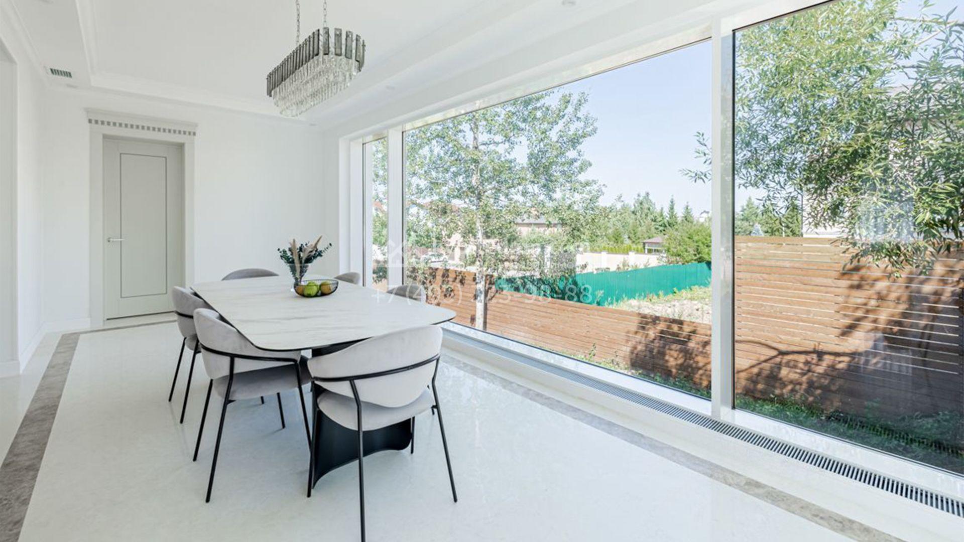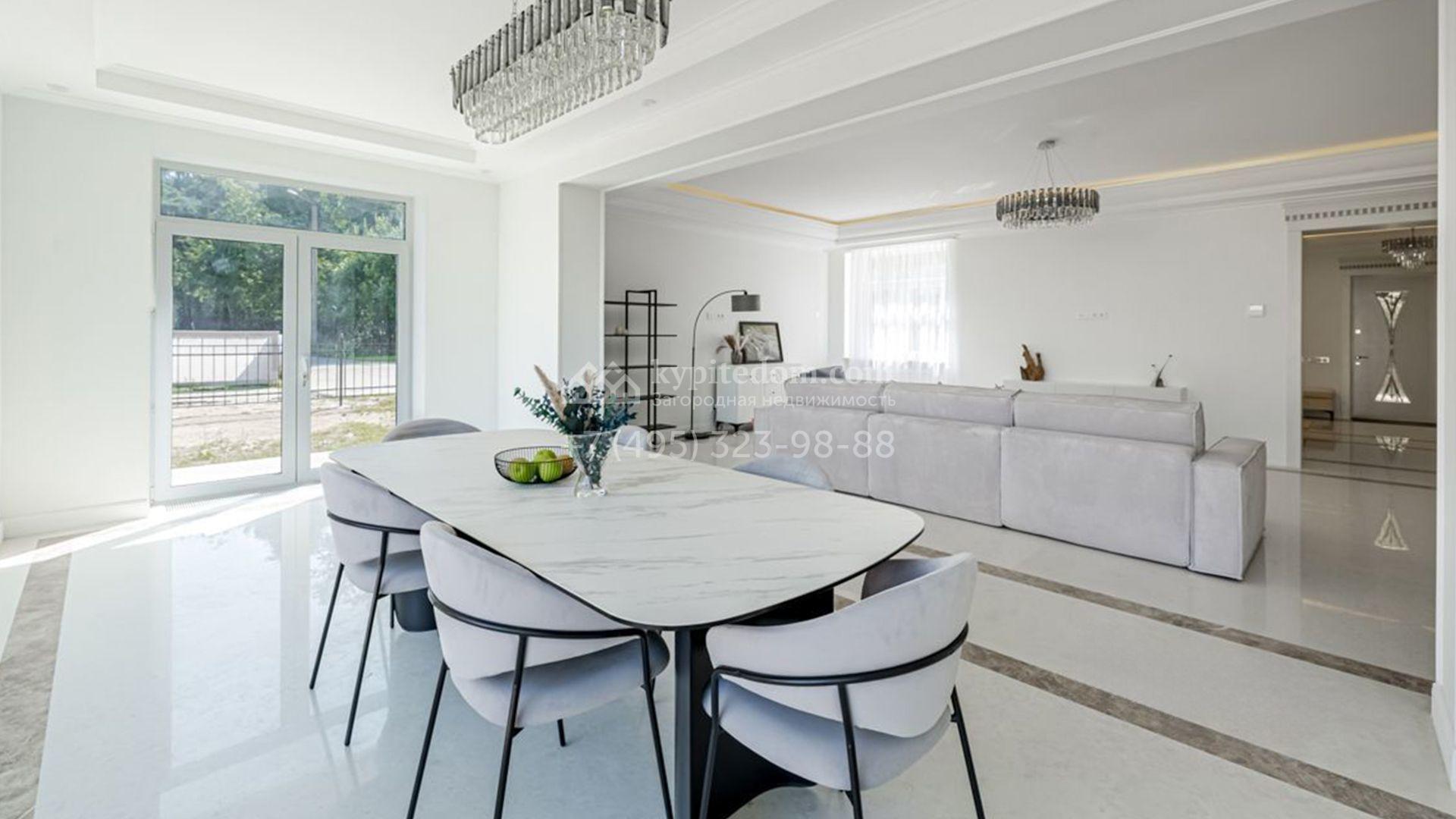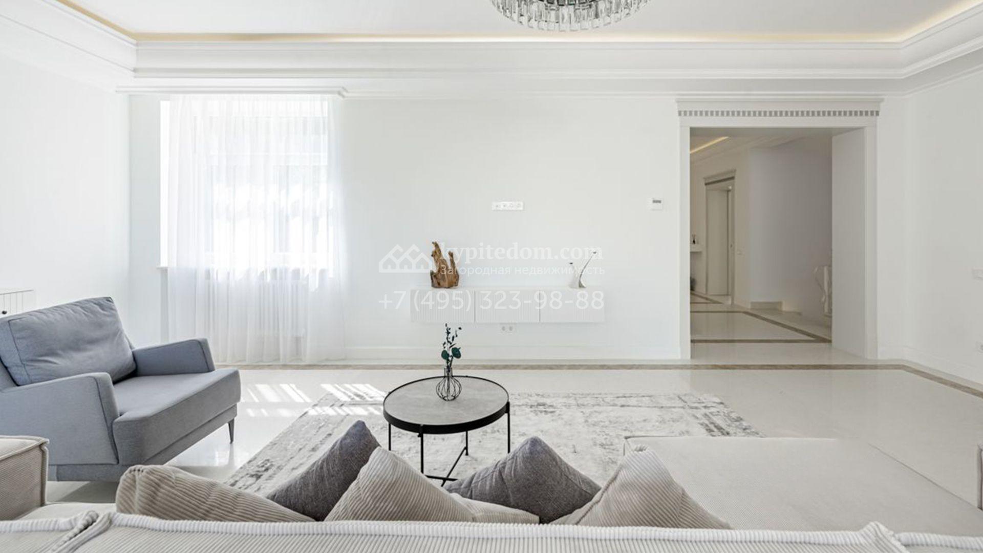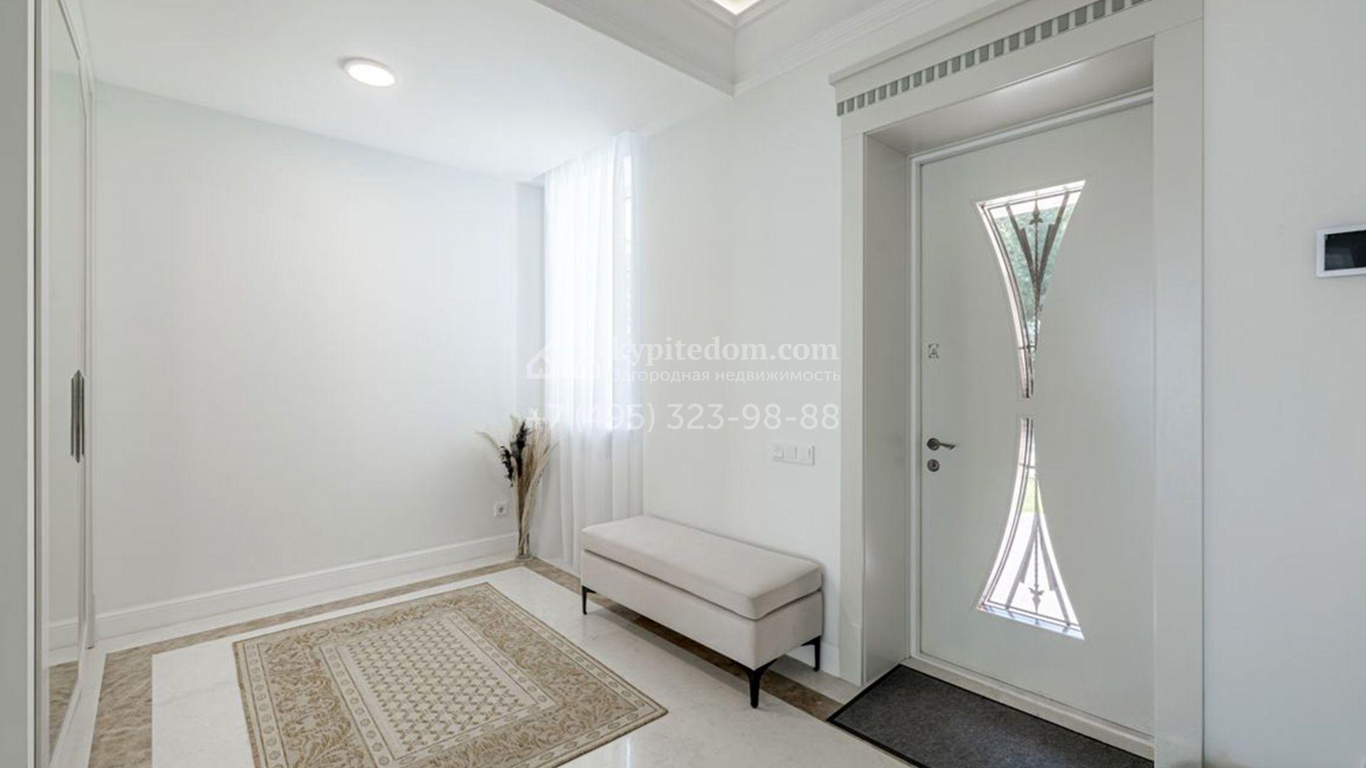 Новый загородный коттедж площадью 400 м² расположен на участке 8 соток с собственным выходом в живописный лес. Фасад с многоскатной крышей, выполненный в европейском стиле, облицован благородным клинкерным кирпичом и белоснежной штукатуркой, а также дополнен элегантными молдингами. Современные интерьеры выдержаны в светлых тонах и отделаны с использованием высококачественных материалов. Дом укомплектован комфортной мебелью, встроенной бытовой техникой и сантехникой. Для идеального микроклимата установлена система приточной вентиляции.