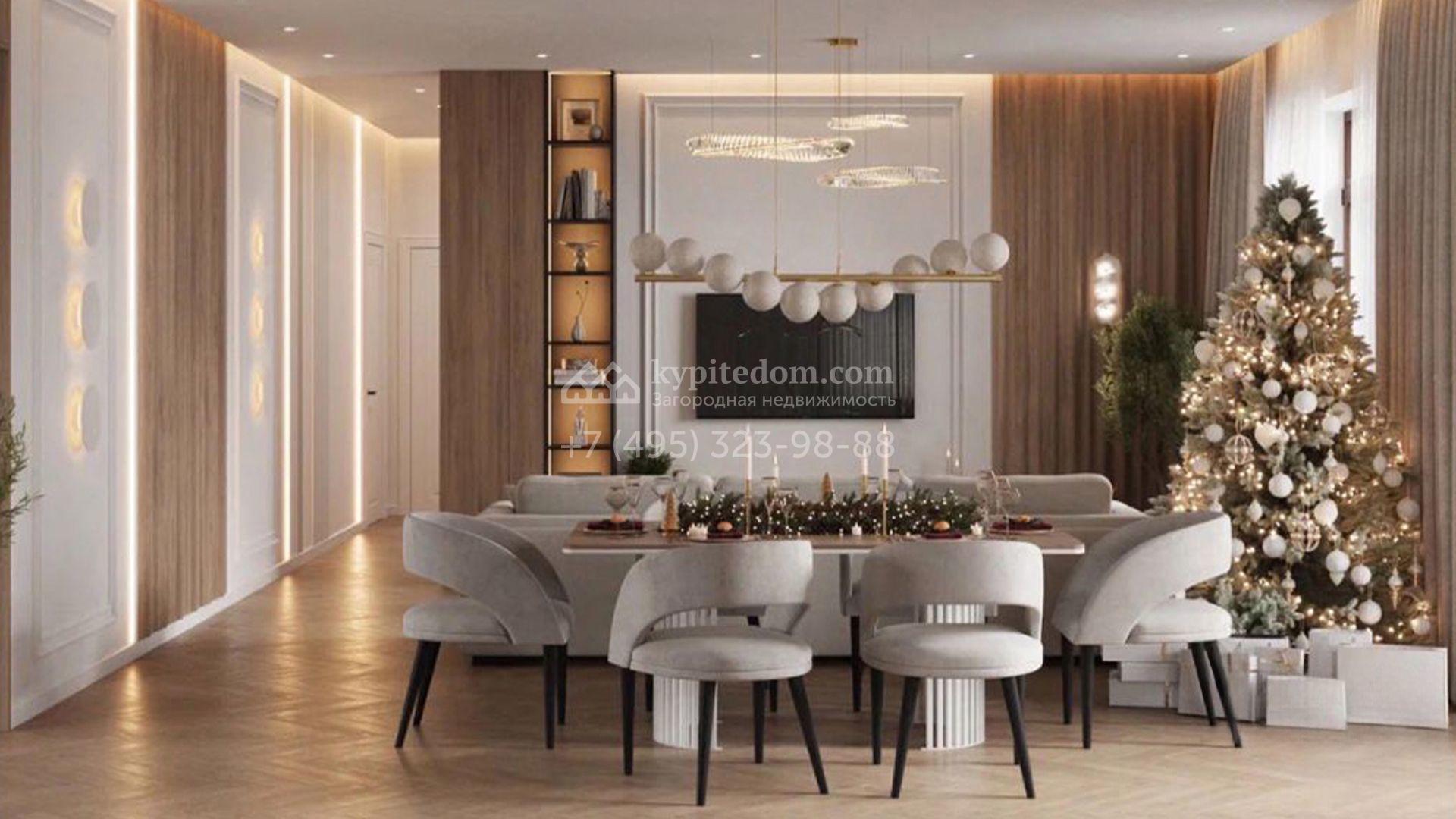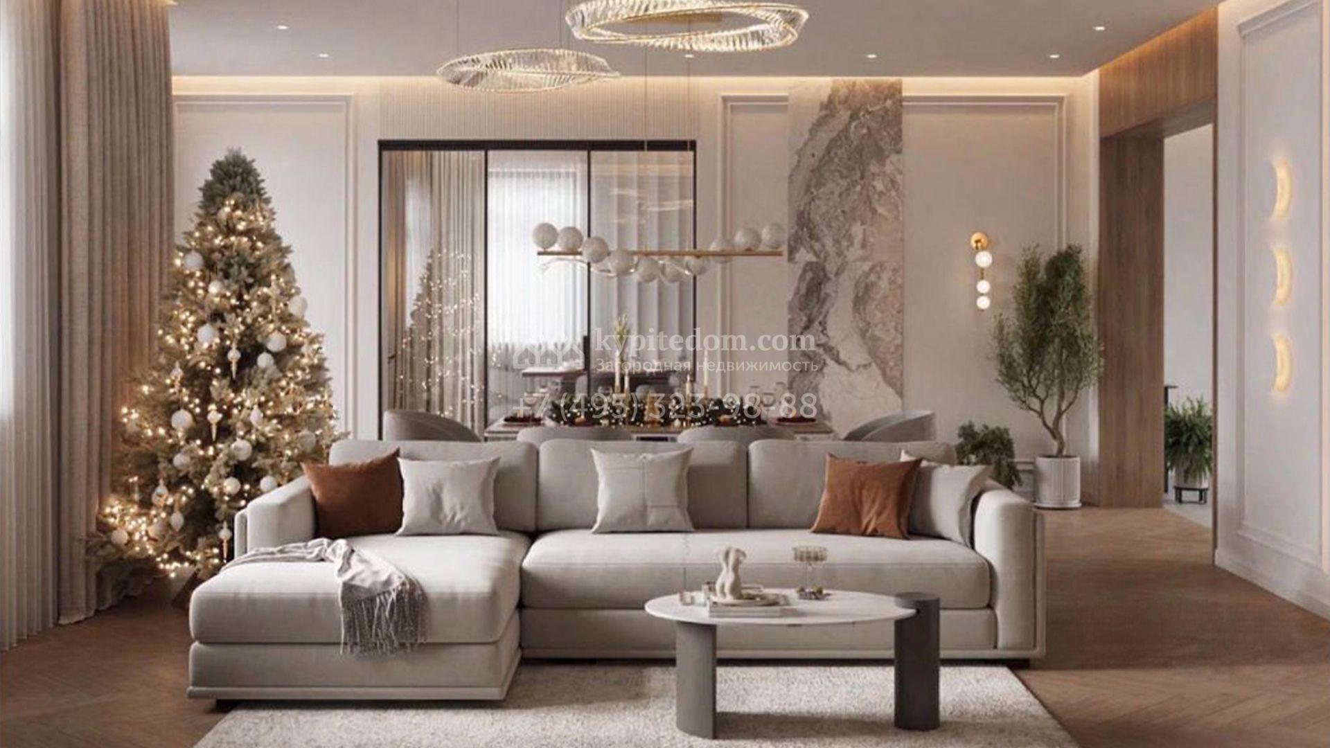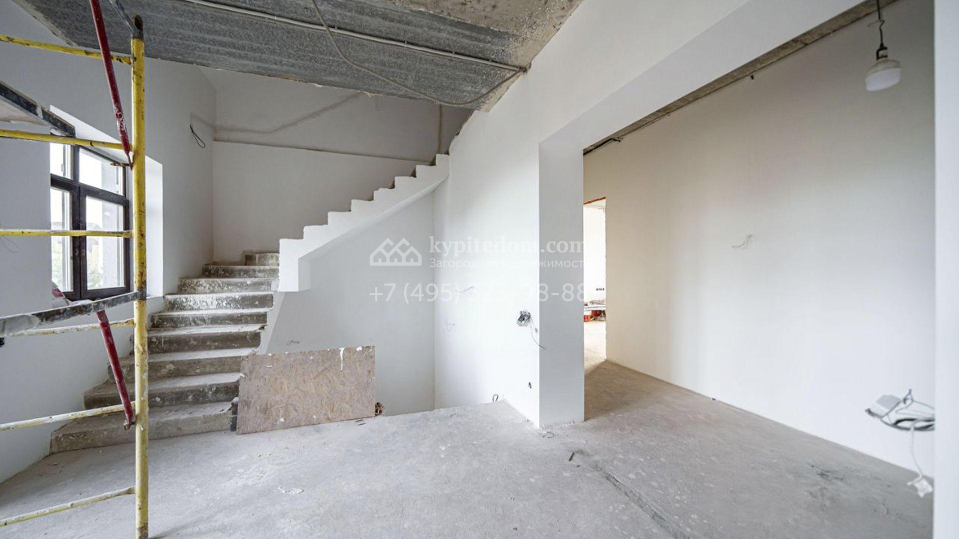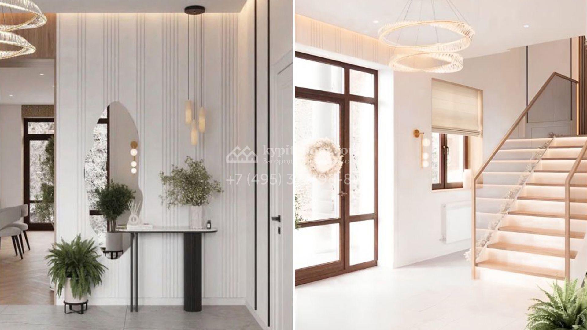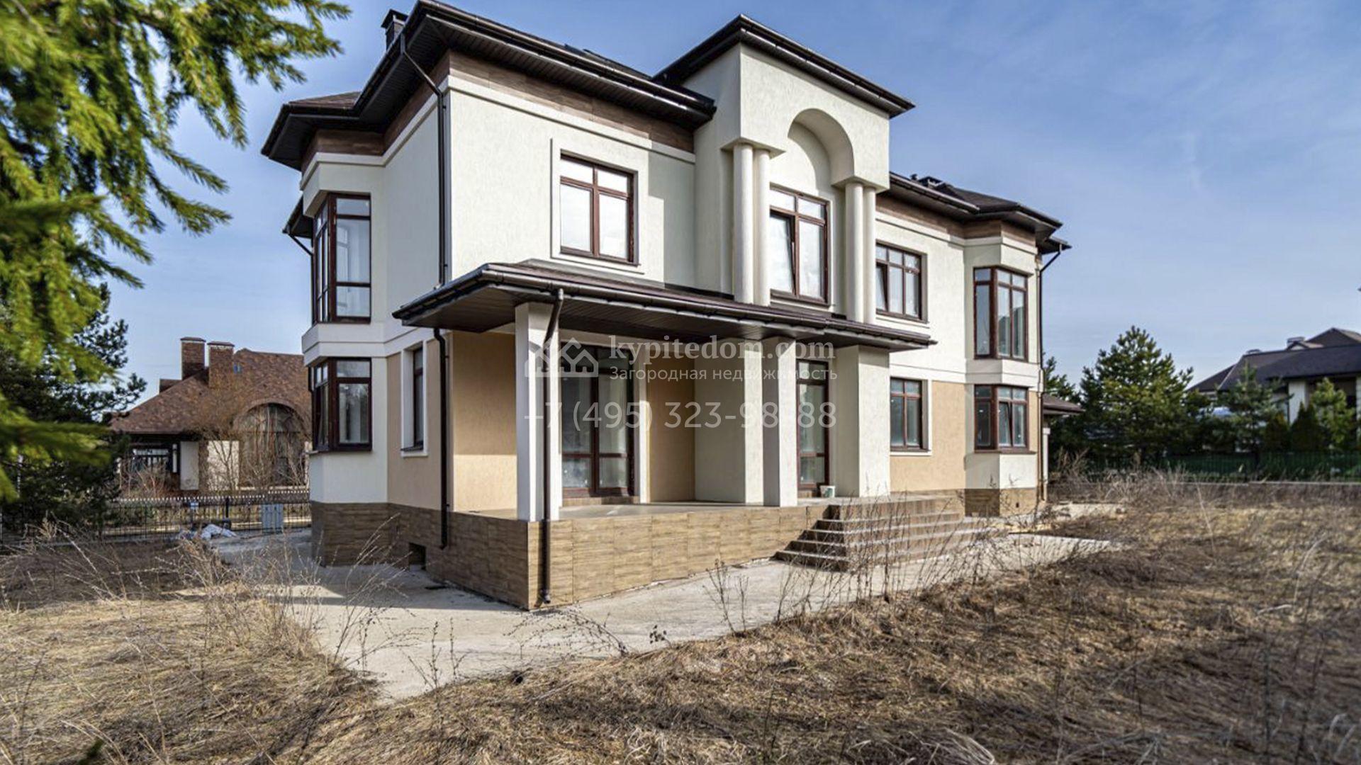 Загородный коттедж площадью 588 м² расположен на полевом участке 10,7 соток. Фасад выполнен в европейском стиле, облицован белой и бежевой штукатуркой в сочетании с плиткой, а также украшен изящными колоннами. Панорамные и эркерные окна наполняют интерьер естественным светом и создают ощущение простора. Отделка white box позволяет будущим владельцам выбрать финишные покрытия, мебель и технику на свой вкус, воплотив любые дизайнерские решения.