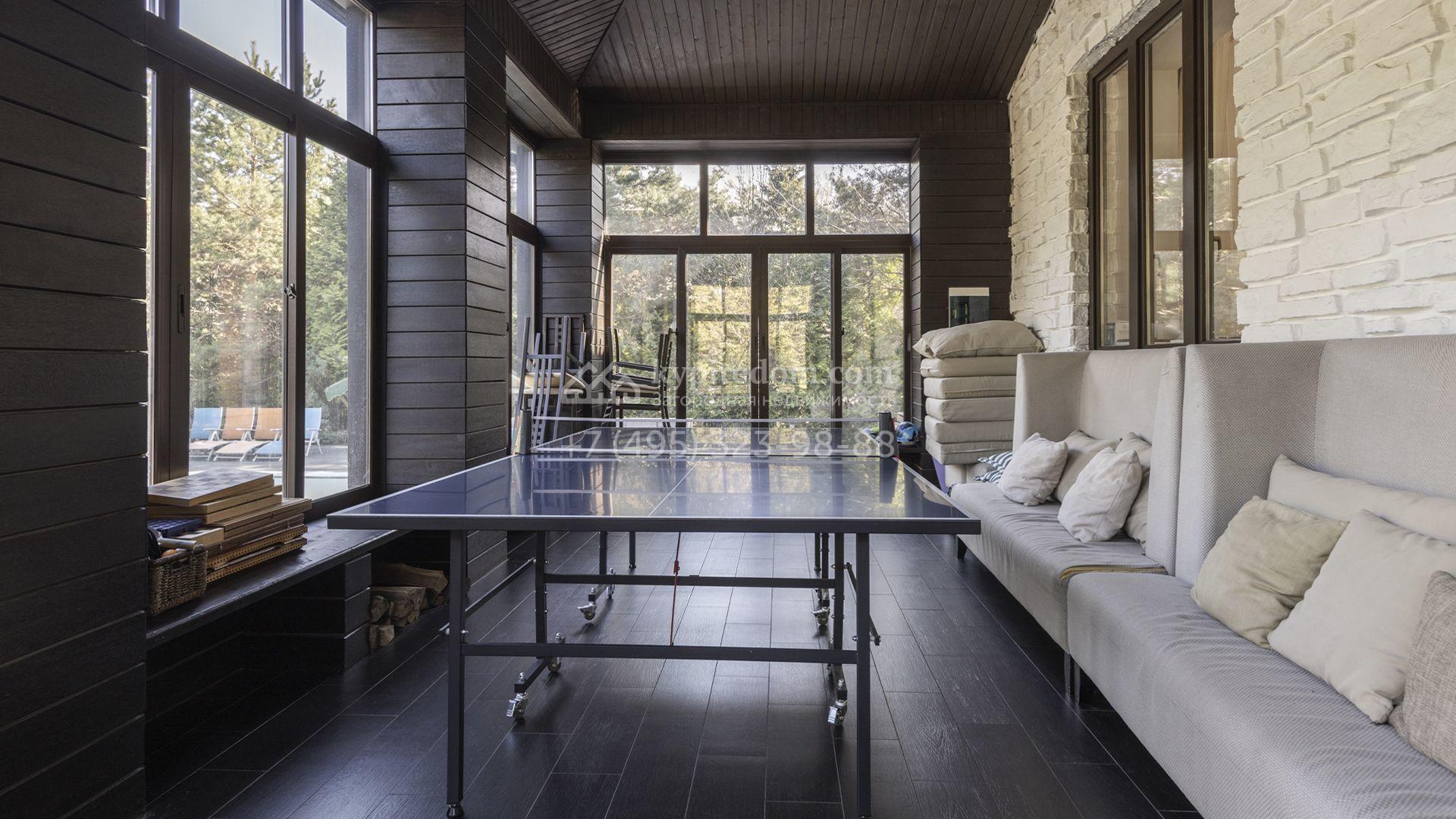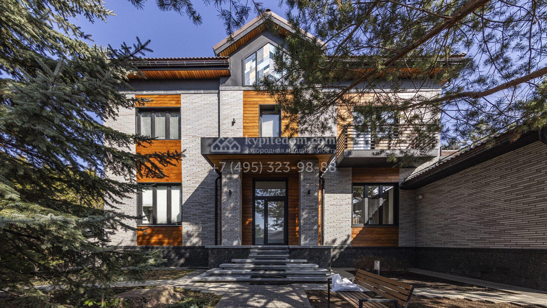 Загородный коттедж площадью 638 м² расположен на полевом участке 29,8 соток. Фасад, облицованный благородным клинкерным кирпичом с элементами камня и дерева, приобретает особое очарование в вечернее время благодаря стильной подсветке. Панорамные окна создают эффект единения с природой, наполняя интерьеры светом и открывая живописные виды на природное окружение. Внутреннее пространство оформлено в скандинавском стиле — светлые тона, паркет из ценных пород древесины и декоративные потолочные балки создают атмосферу элегантности. Качественная мебель и система кондиционирования дополняют ощущение комфорта.