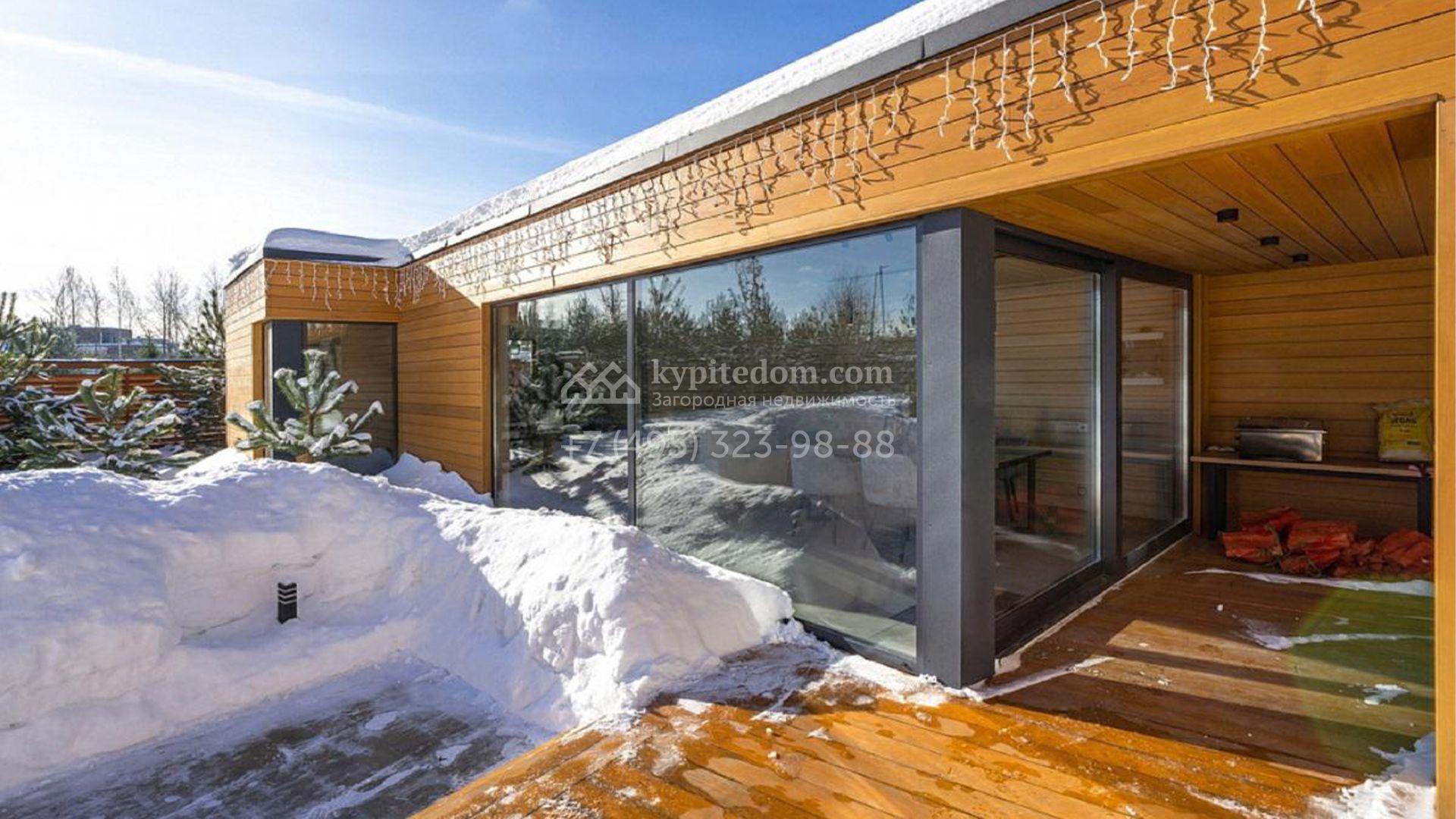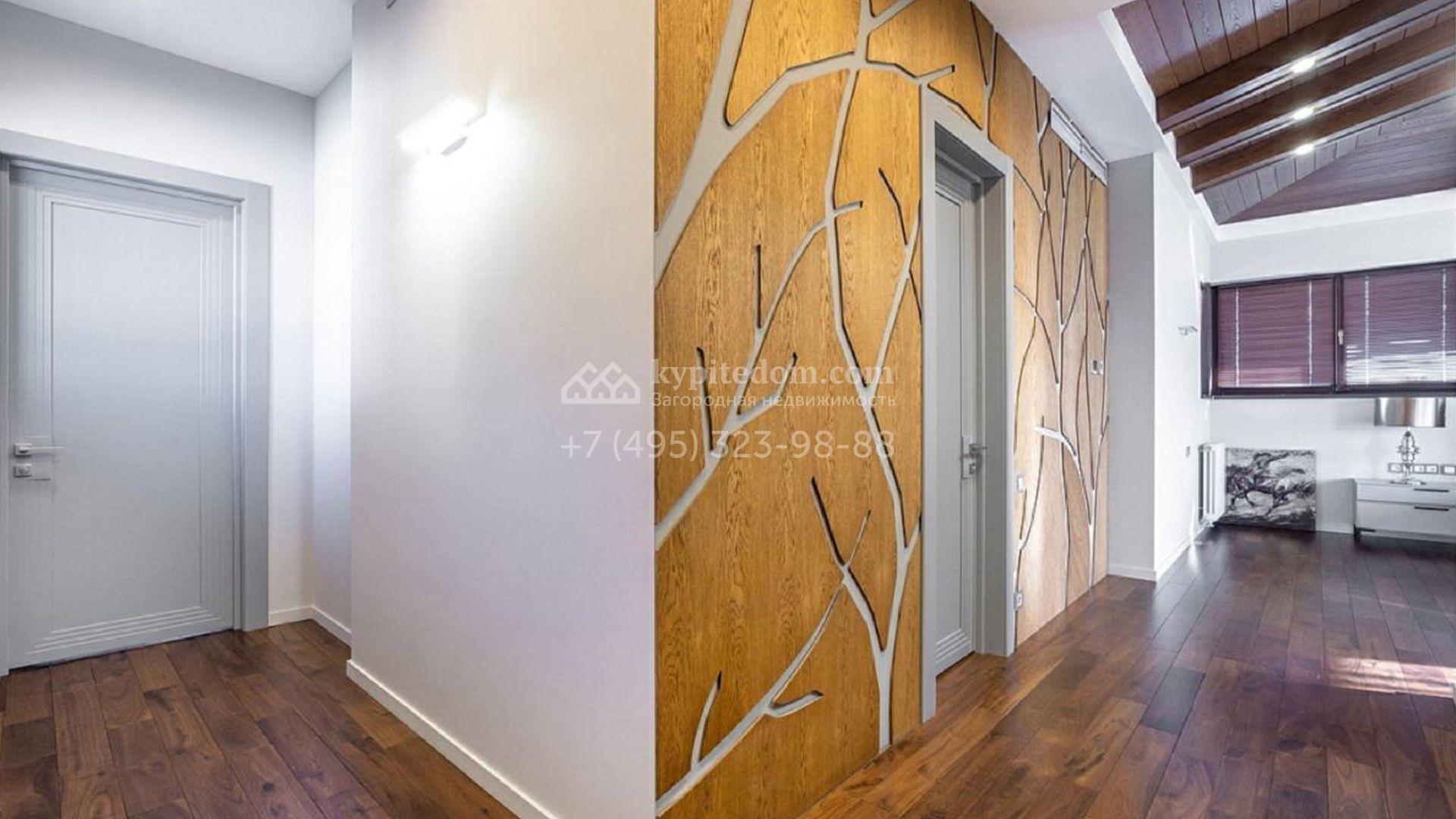 Новый загородный коттедж площадью 590 м² расположен на полевом участке 15 соток. Современный фасад со стильной подсветкой сочетает в себе фактуры камня и дерева, а большие панорамные окна наполняют внутренние пространства солнечным светом и теплом. Интерьеры выполнены в светлой гамме с использованием ценных материалов — полы из массива американского ореха, крупноформатный керамогранит и оригинальные стеновые панели из дуба и ореха со световым оформлением.
