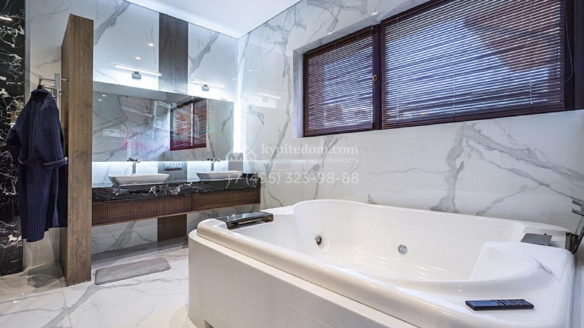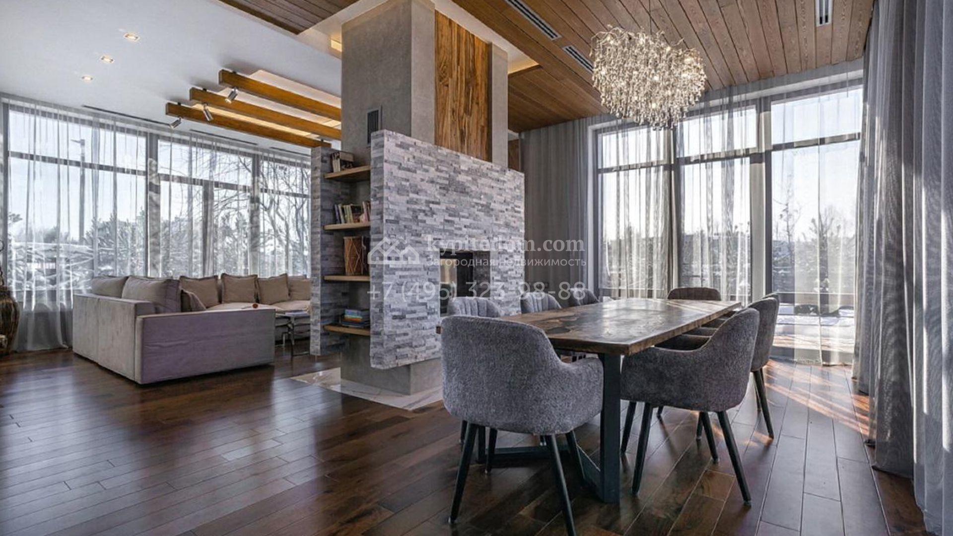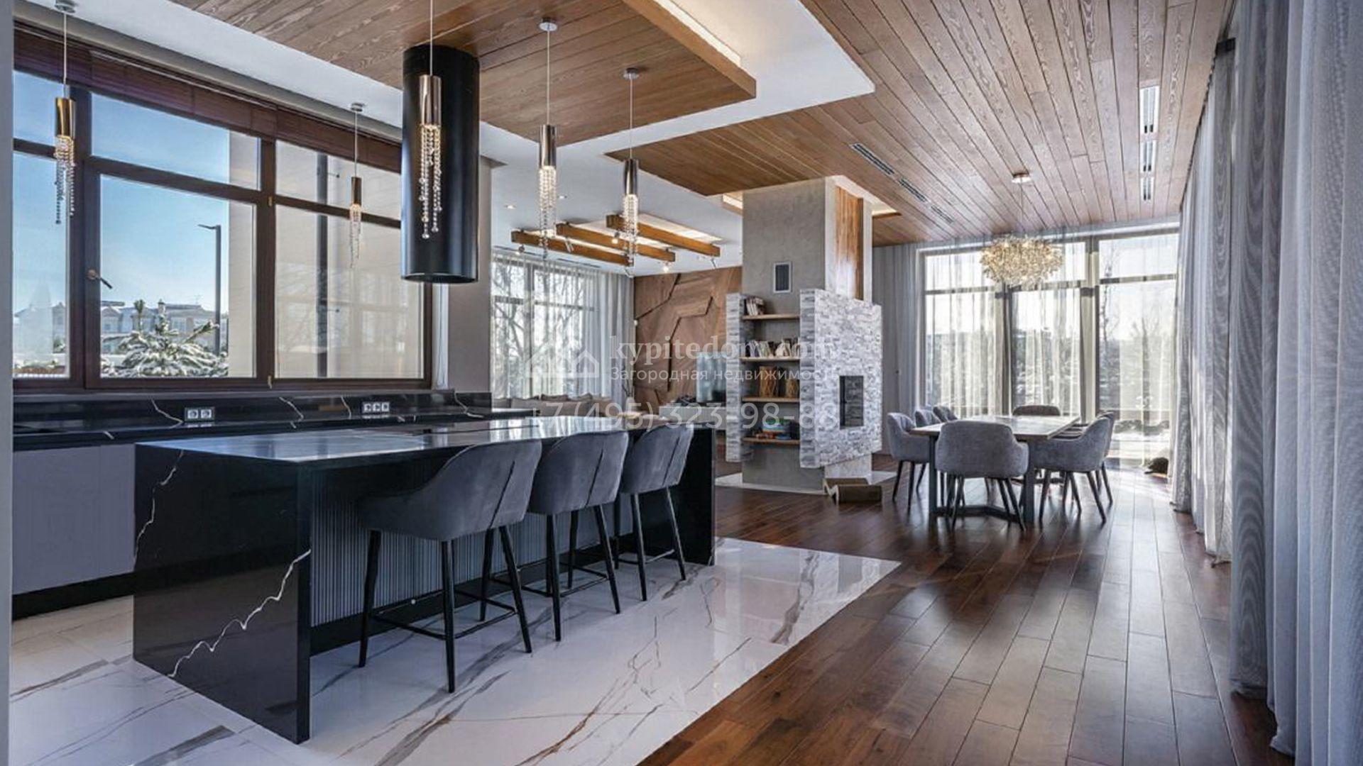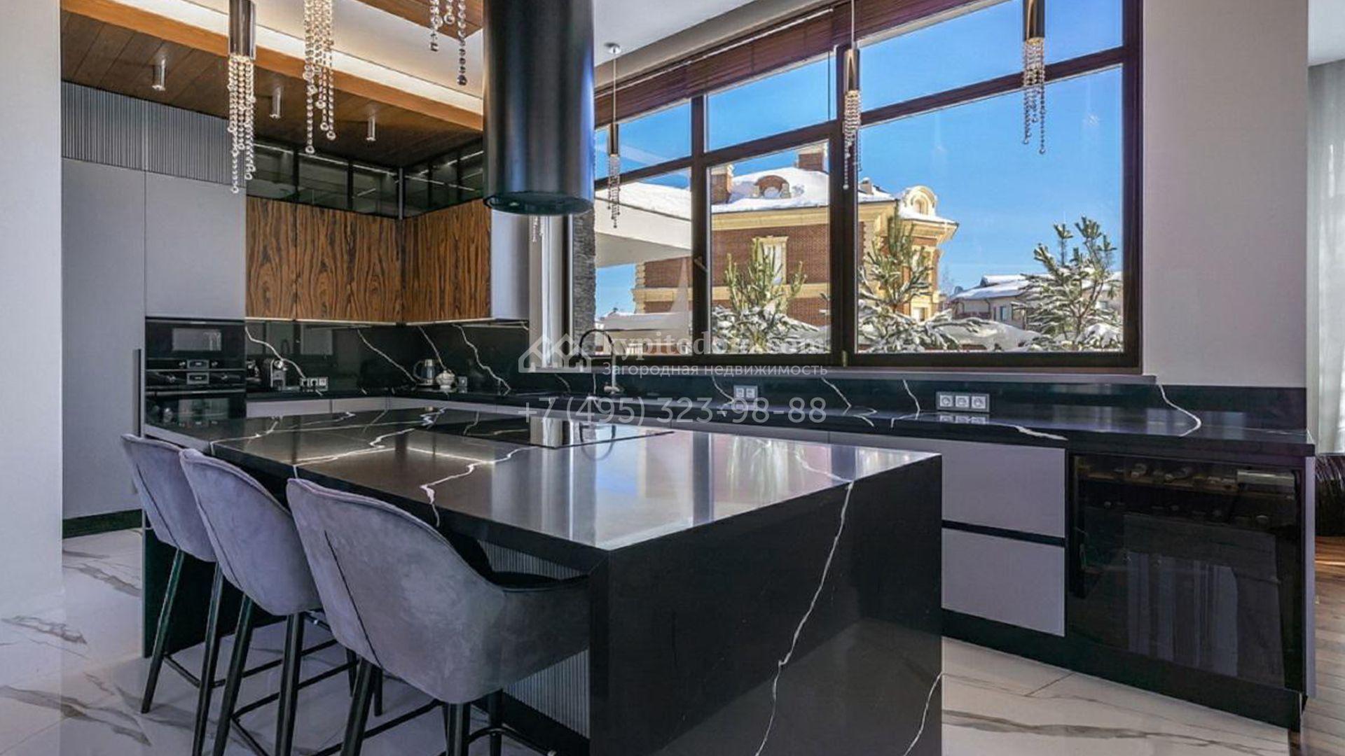 Особняк полностью укомплектован комфортной мебелью, изящным декором, бытовой техникой Kuppersbusch и сантехникой Villeroy&Boch, Jacob Delafon и Jacuzzi. Для идеального микроклимата предусмотрели систему приточно-вытяжной вентиляции с кондиционированием. Планировка включает просторную гостиную с французским камином SUPRA, облицованным натуральным камнем, столовую, кухню с двумя винными шкафами и столешницей из кварцита, уютную террасу, 4 спальни с гардеробными, сауну, бассейн с водопадом и гараж.
