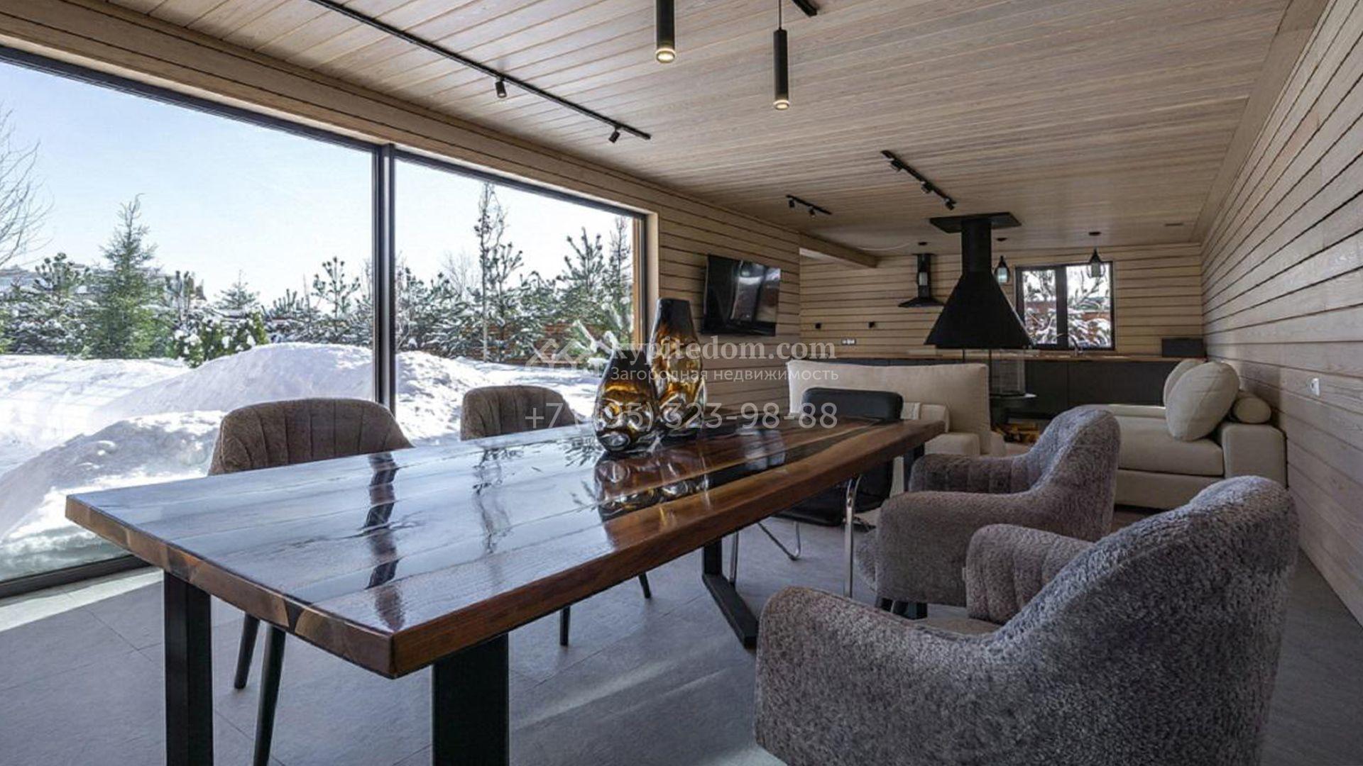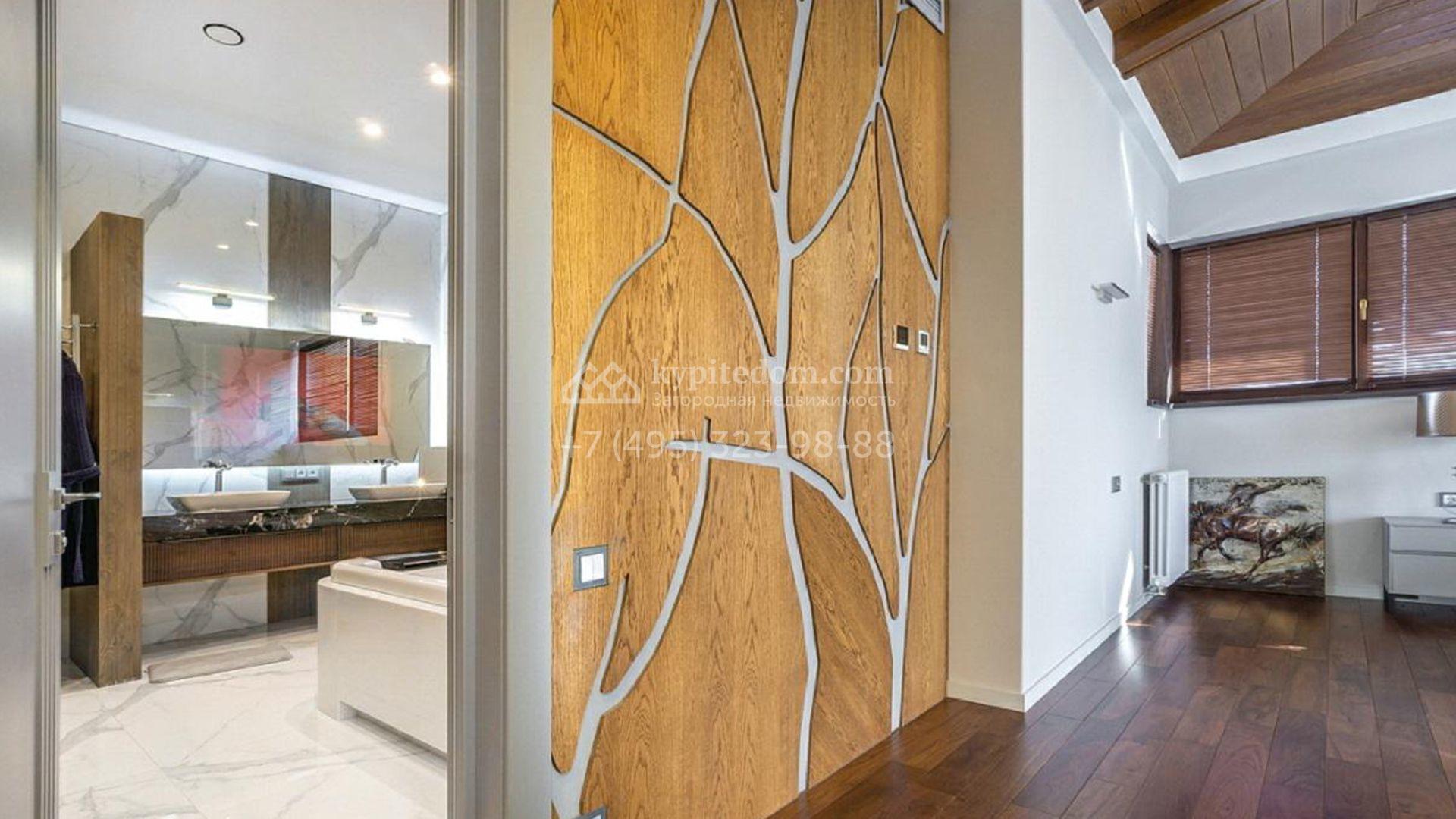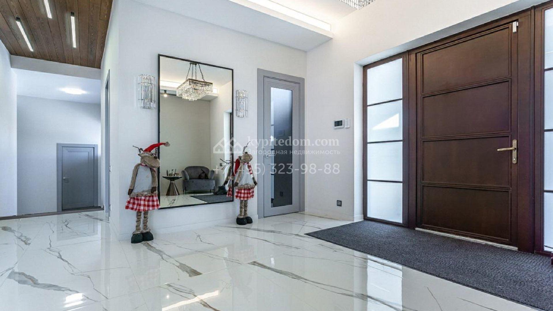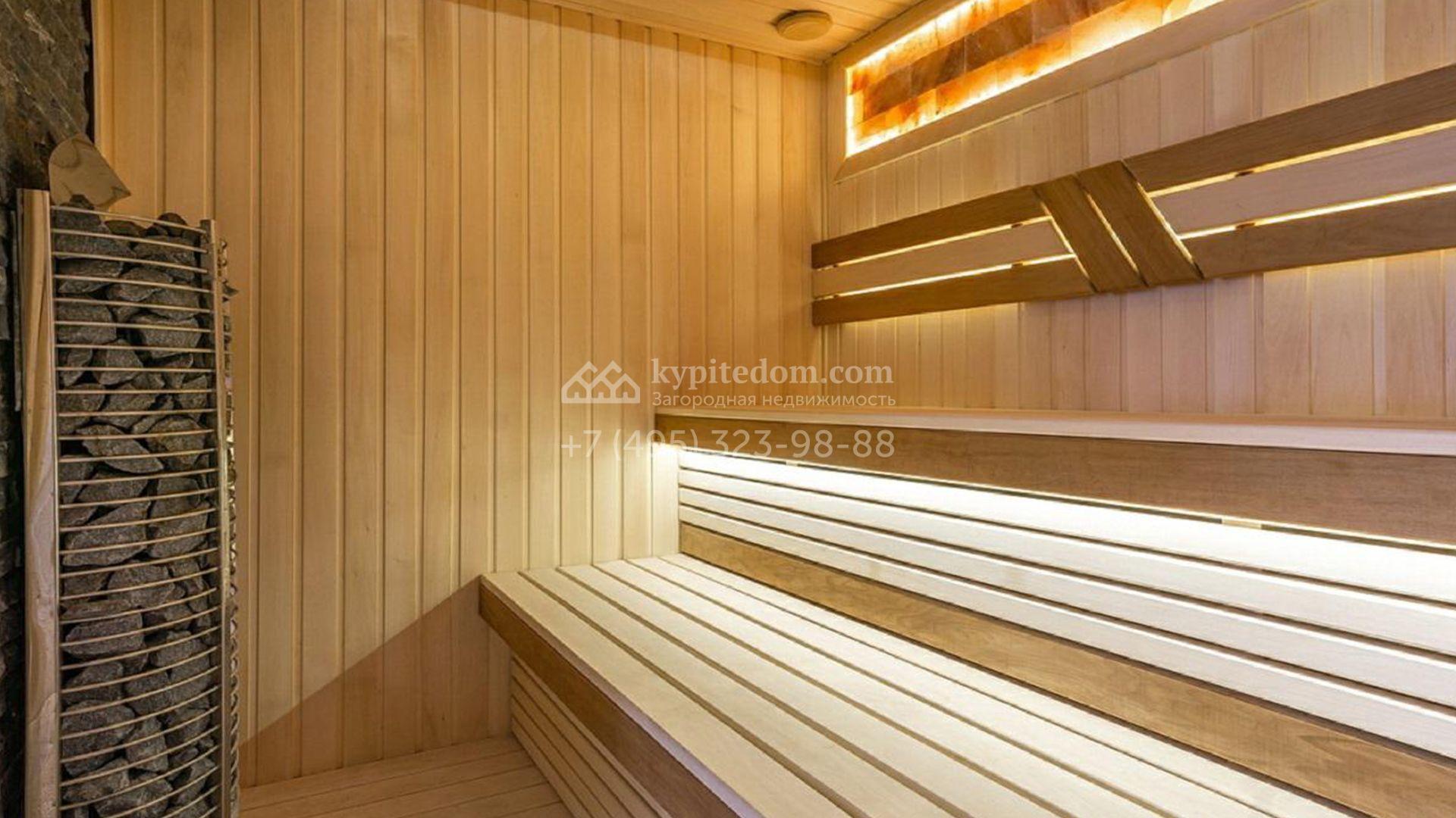 Особняк полностью укомплектован комфортной мебелью, изящным декором, бытовой техникой Kuppersbusch и сантехникой Villeroy&Boch, Jacob Delafon и Jacuzzi. Для идеального микроклимата предусмотрели систему приточно-вытяжной вентиляции с кондиционированием. Планировка включает просторную гостиную с французским камином SUPRA, облицованным натуральным камнем, столовую, кухню с двумя винными шкафами и столешницей из кварцита, уютную террасу, 4 спальни с гардеробными, сауну, бассейн с водопадом и гараж.