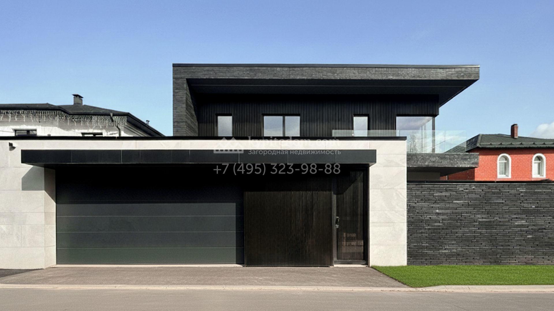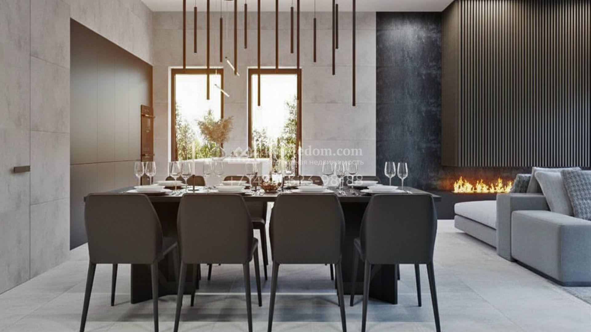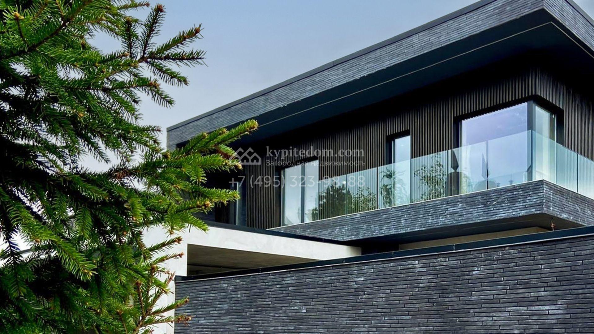 Загородный коттедж площадью 468 м² расположен на полевом участке 10 соток в центральной, тихой части посёлка. Современный фасад с лаконичными формами облицован керамогранитом, ригельным камнем и украшен рейками из натурального термодерева, формируя гармоничный диалог минималистичной архитектуры и природы. Панорамные алюминиевые окна стирают грань между наполненными солнцем интерьерами и живописными видами на лес, а высокие потолки визуально расширяют пространства.