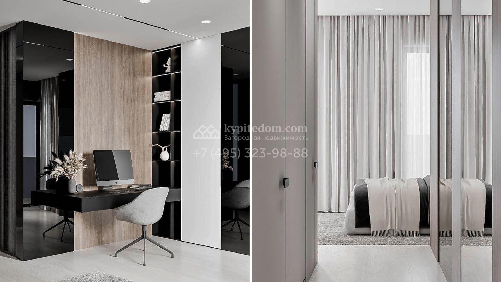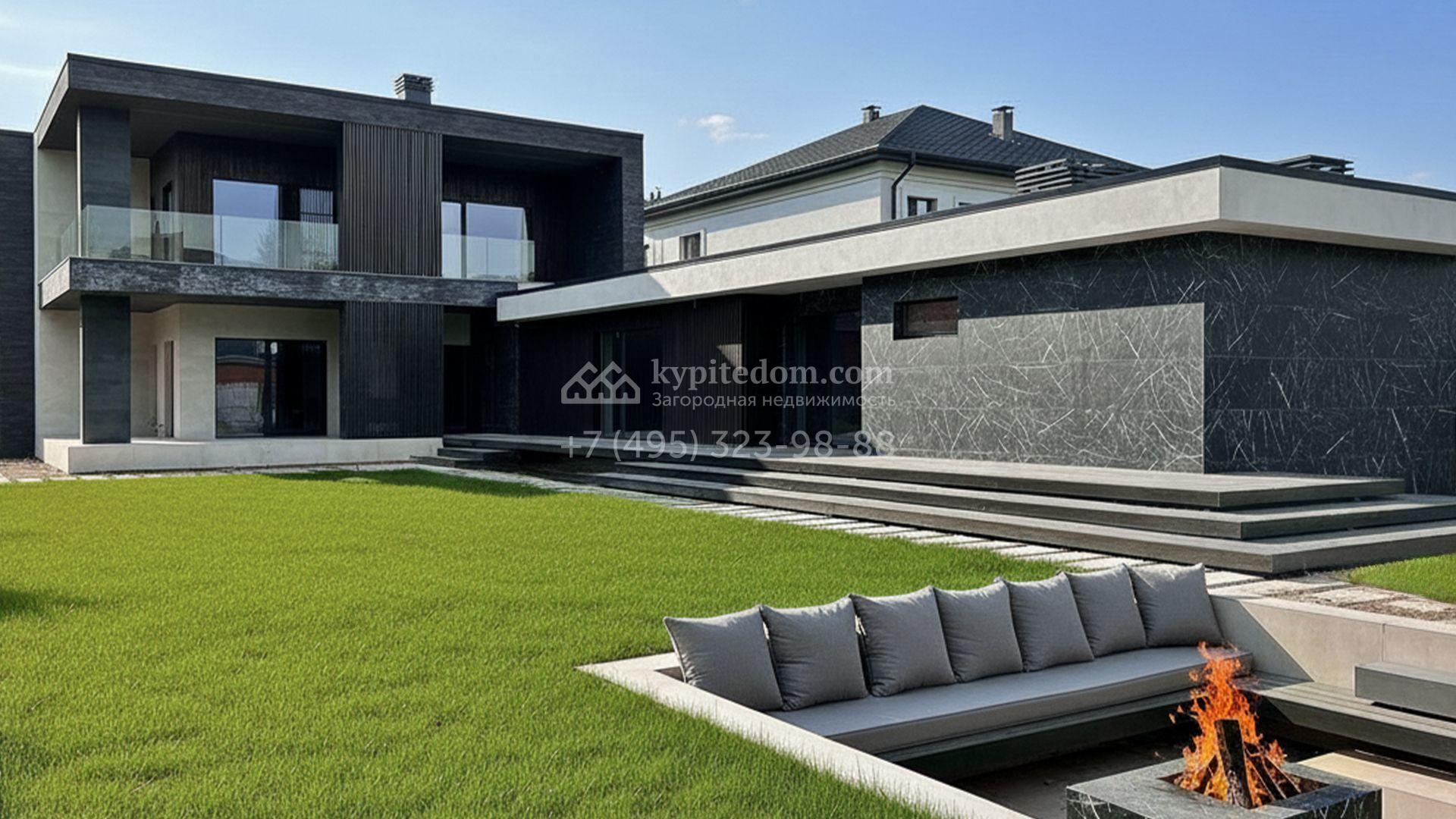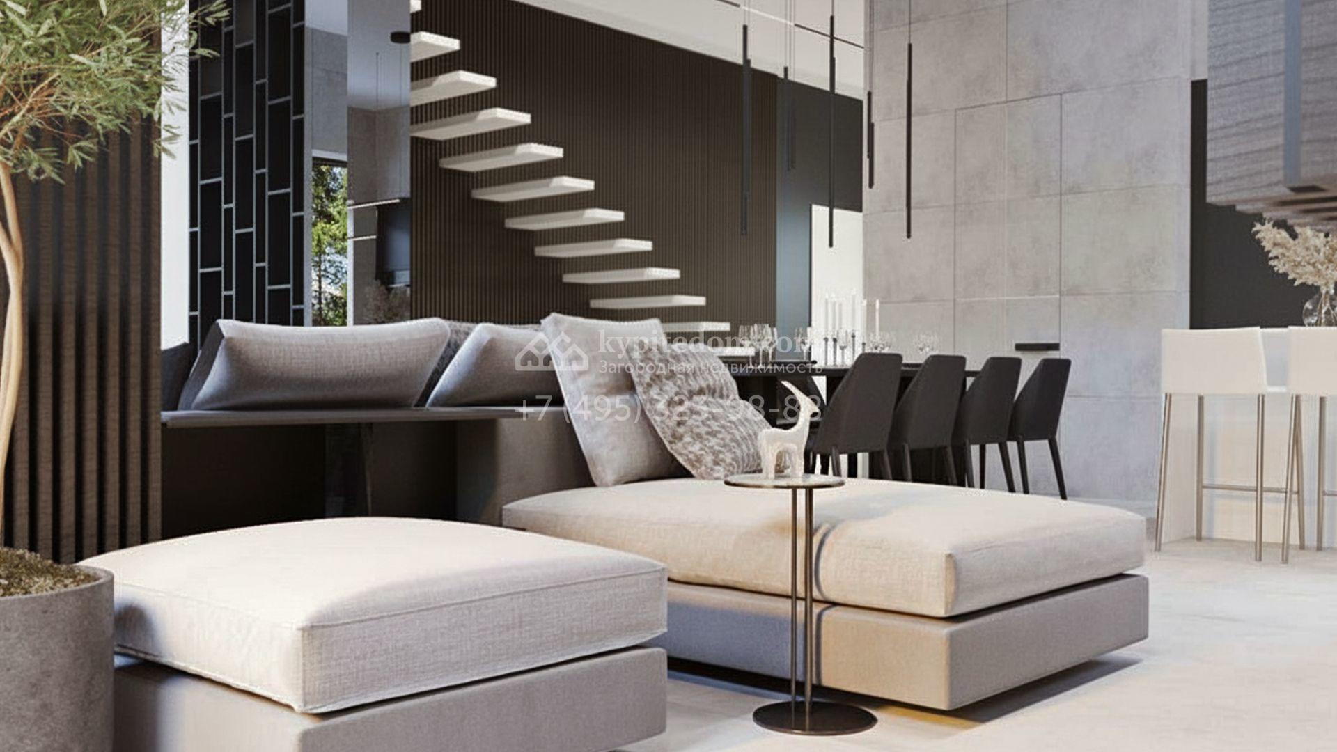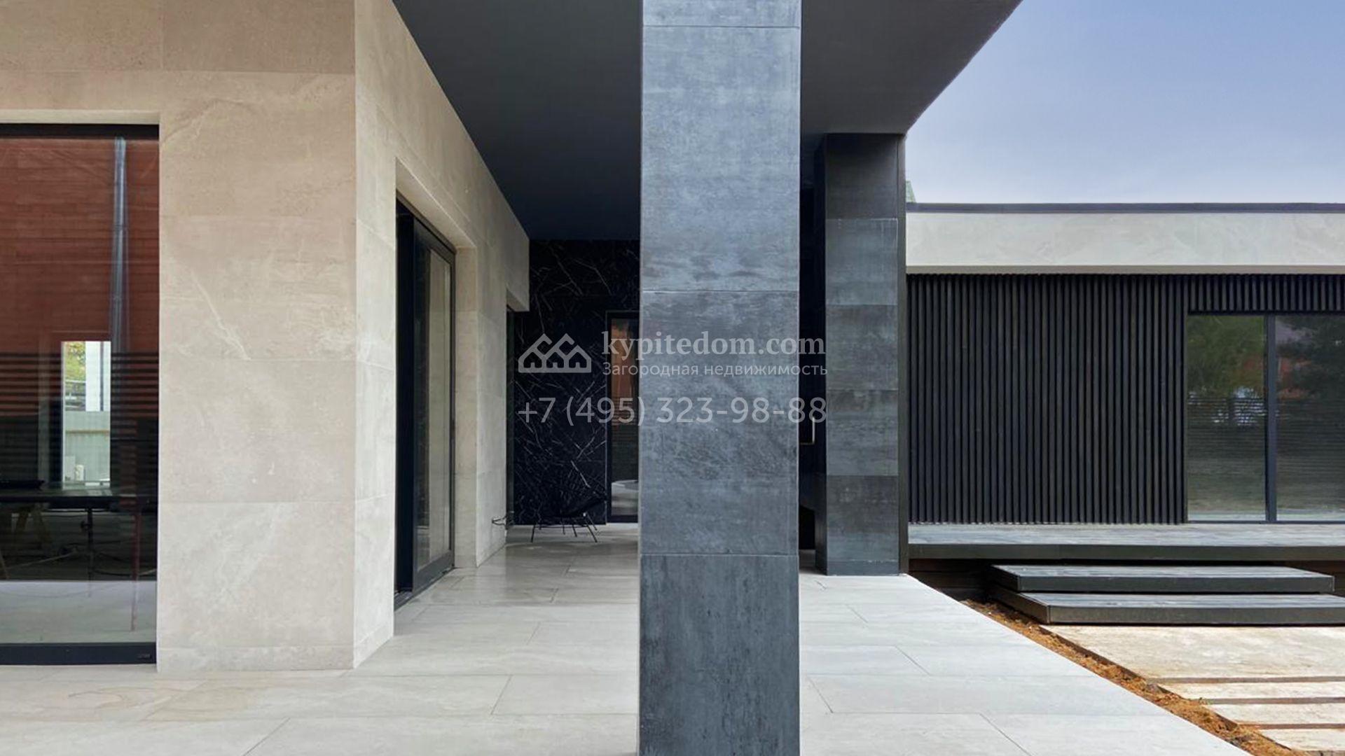 Загородный коттедж площадью 468 м² расположен на полевом участке 10 соток в центральной, тихой части посёлка. Современный фасад с лаконичными формами облицован керамогранитом, ригельным камнем и украшен рейками из натурального термодерева, формируя гармоничный диалог минималистичной архитектуры и природы. Панорамные алюминиевые окна стирают грань между наполненными солнцем интерьерами и живописными видами на лес, а высокие потолки визуально расширяют пространства.
