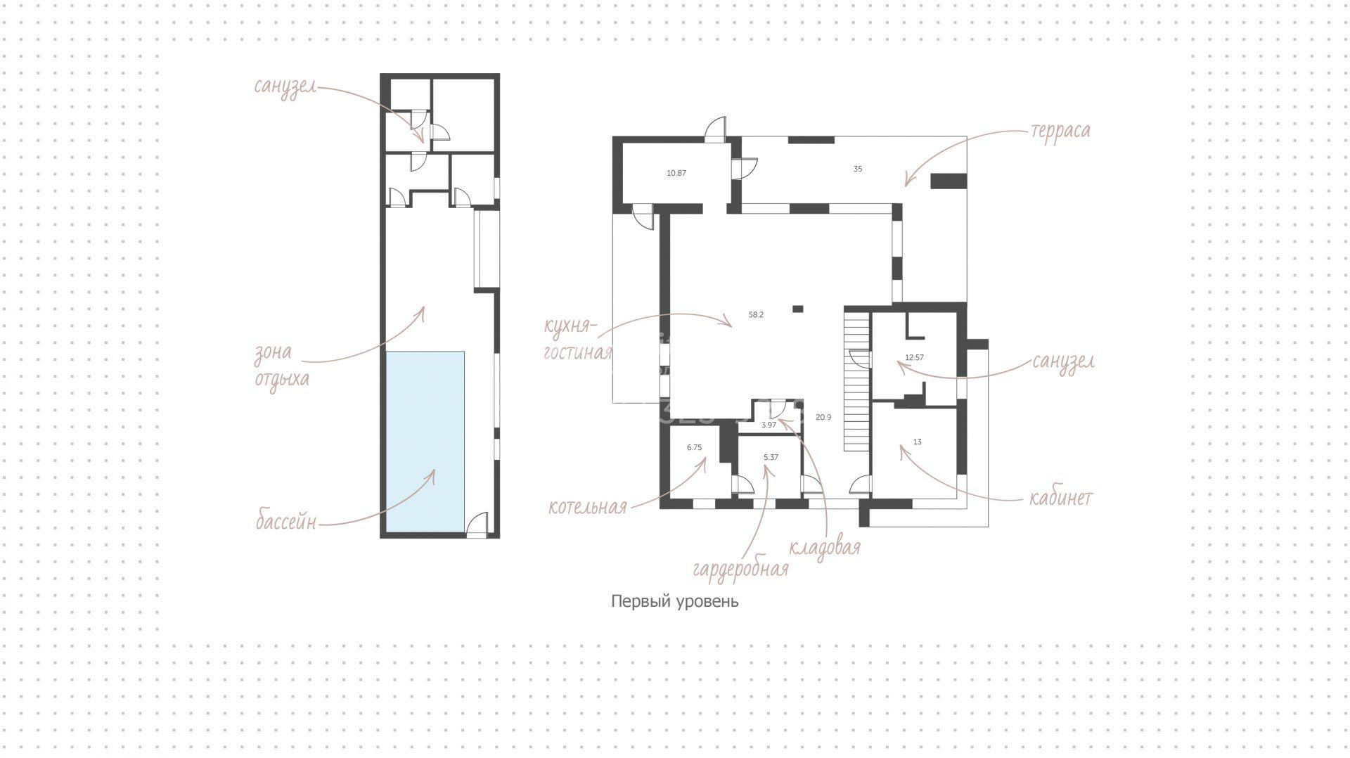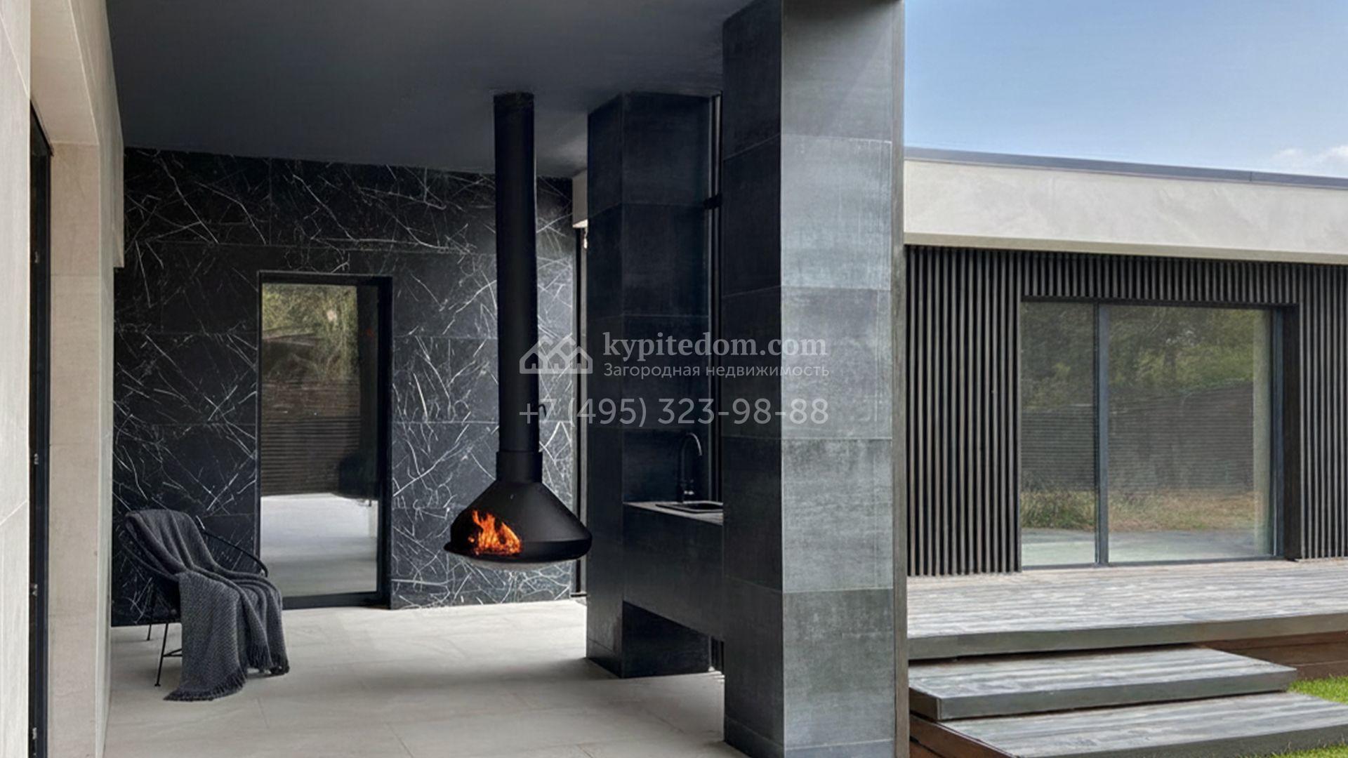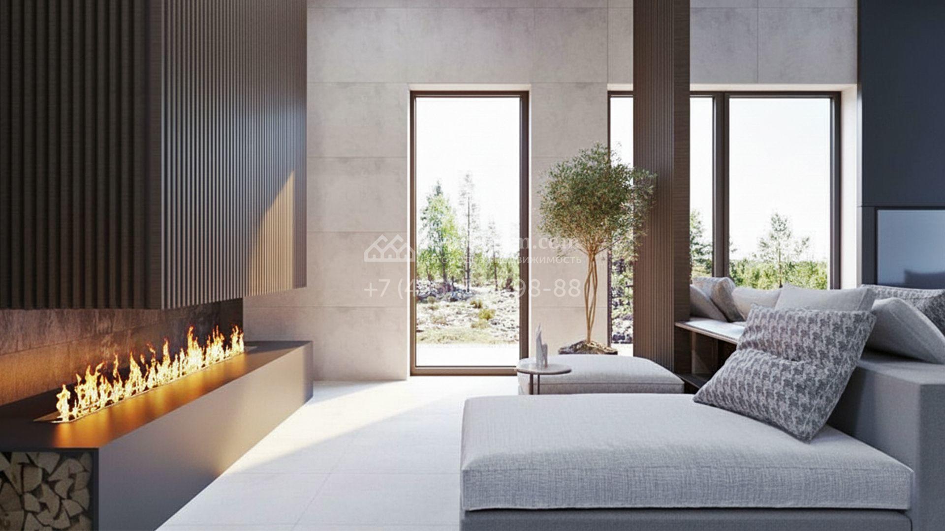 Планировка включает просторную кухню-гостиную, кабинет, три спальни и спа-зону с бассейном, сауной и комнатой отдыха. На эксплуатируемой крыше можно создать уютный уголок для для встречи рассветов или созерцания звёздного неба. Кроме того, для романтичных посиделок на свежем воздухе обустроены крытая терраса с дровяным камином и костровая зона на участке. Территория участка — чистый холст для будущего сада. Здесь уже уложены пошаговые дорожки, гармонично вписанные в ландшафт, а аккуратный газон, декоративные кустарники и пушистые ели дополнят образ дома.