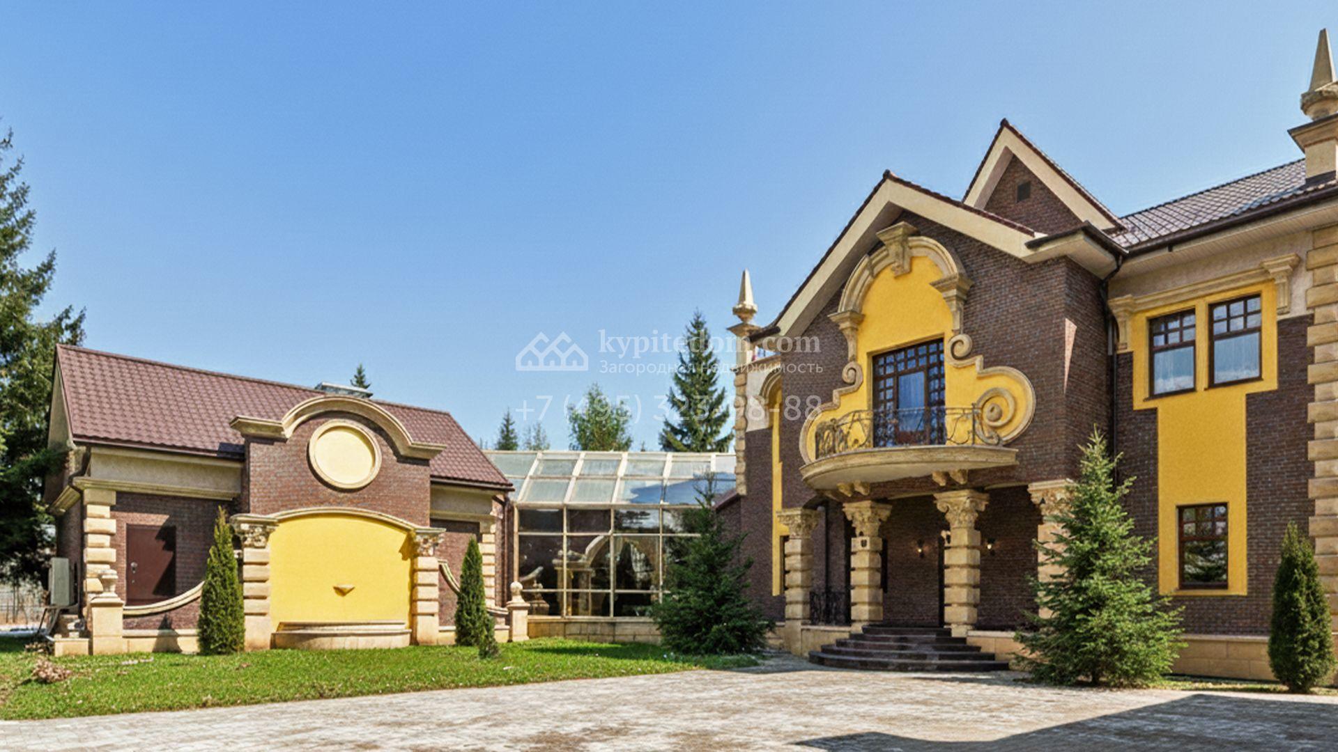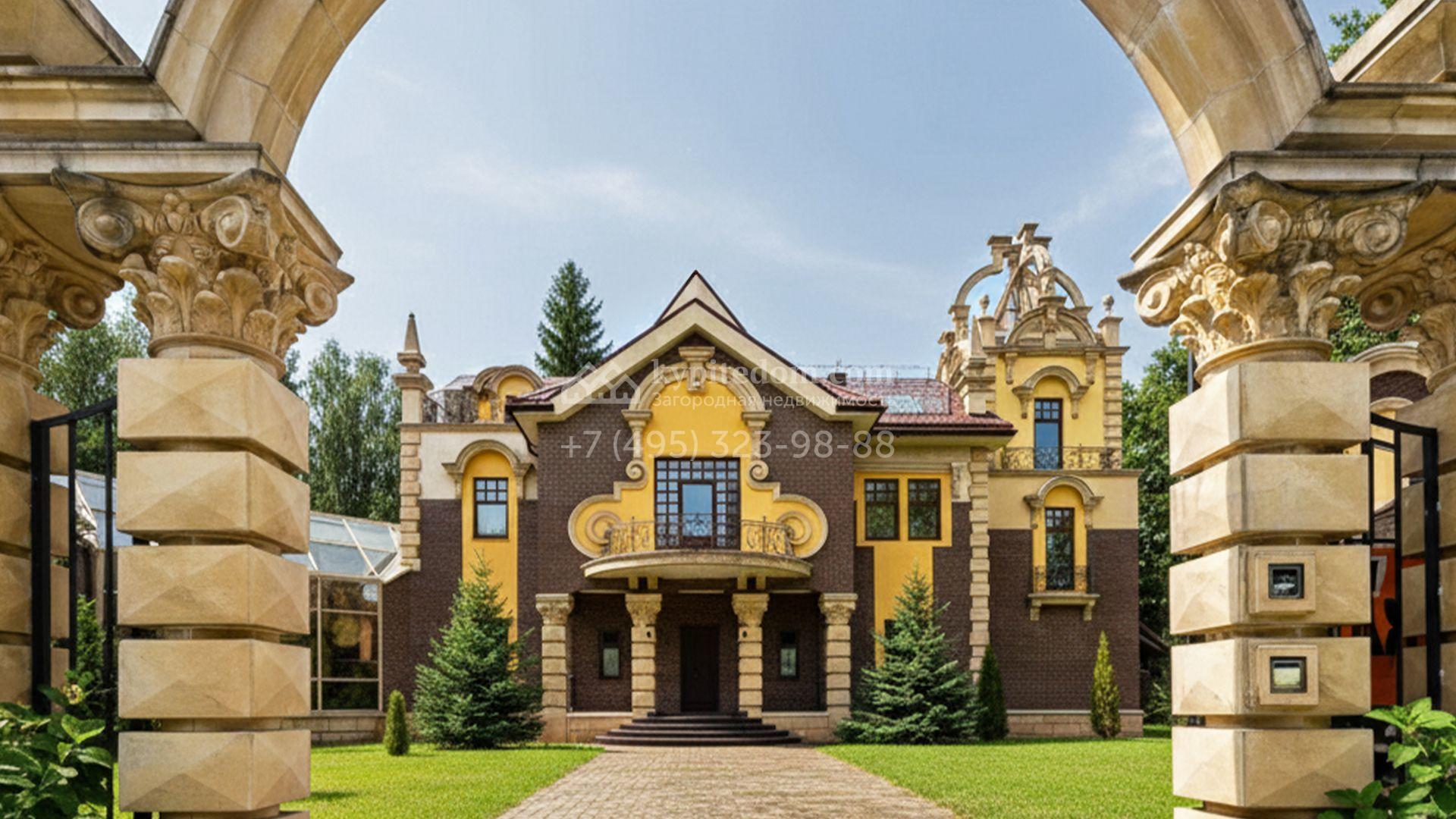 Коттедж площадью 700 м² расположен на полевом участке 30 соток. Необычный фасад в стиле модерн обыгрывает классические европейские и современные стили. Дом облицован натуральным камнем, тёмным клинкерным кирпичом и штукатуркой.