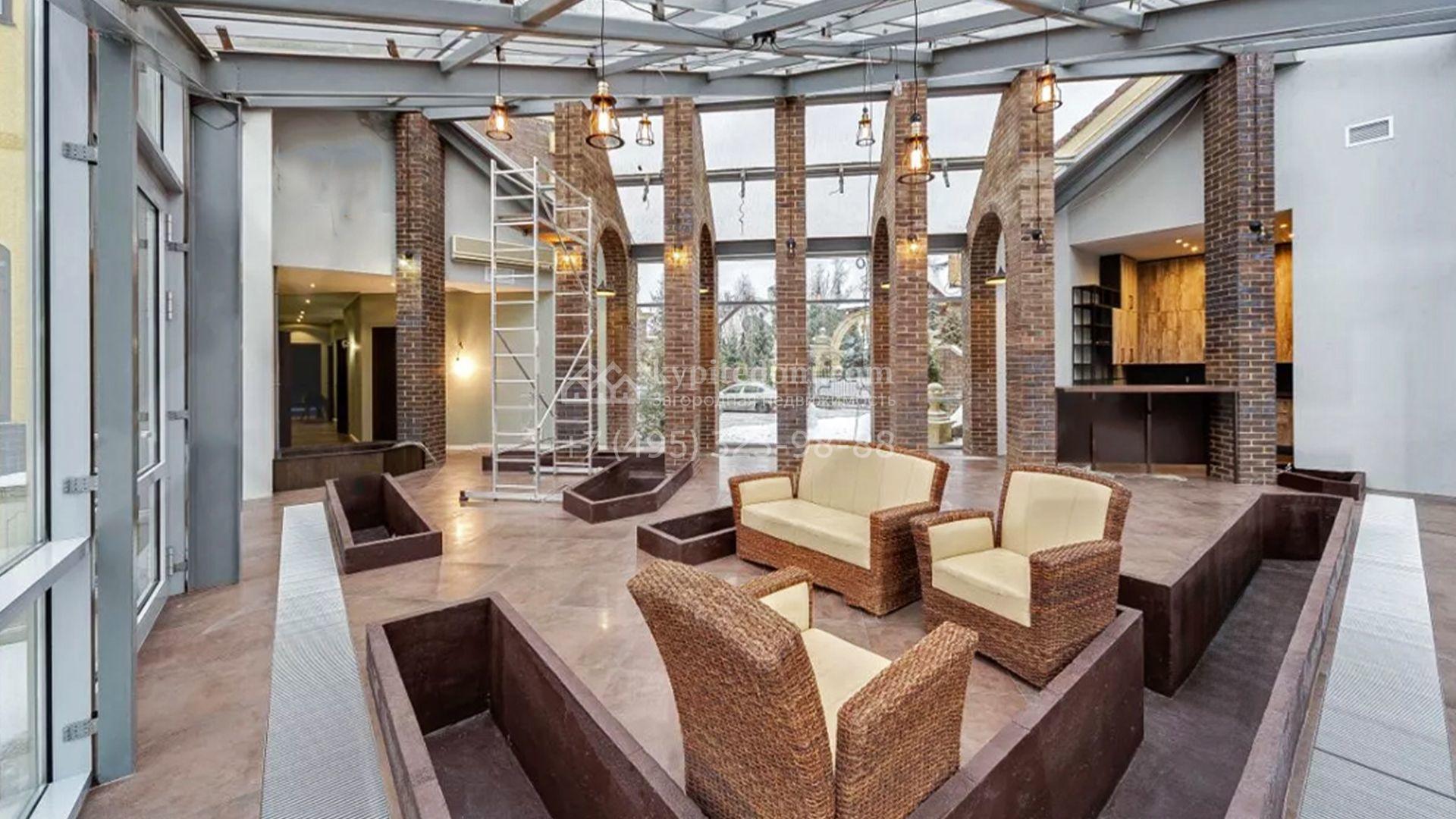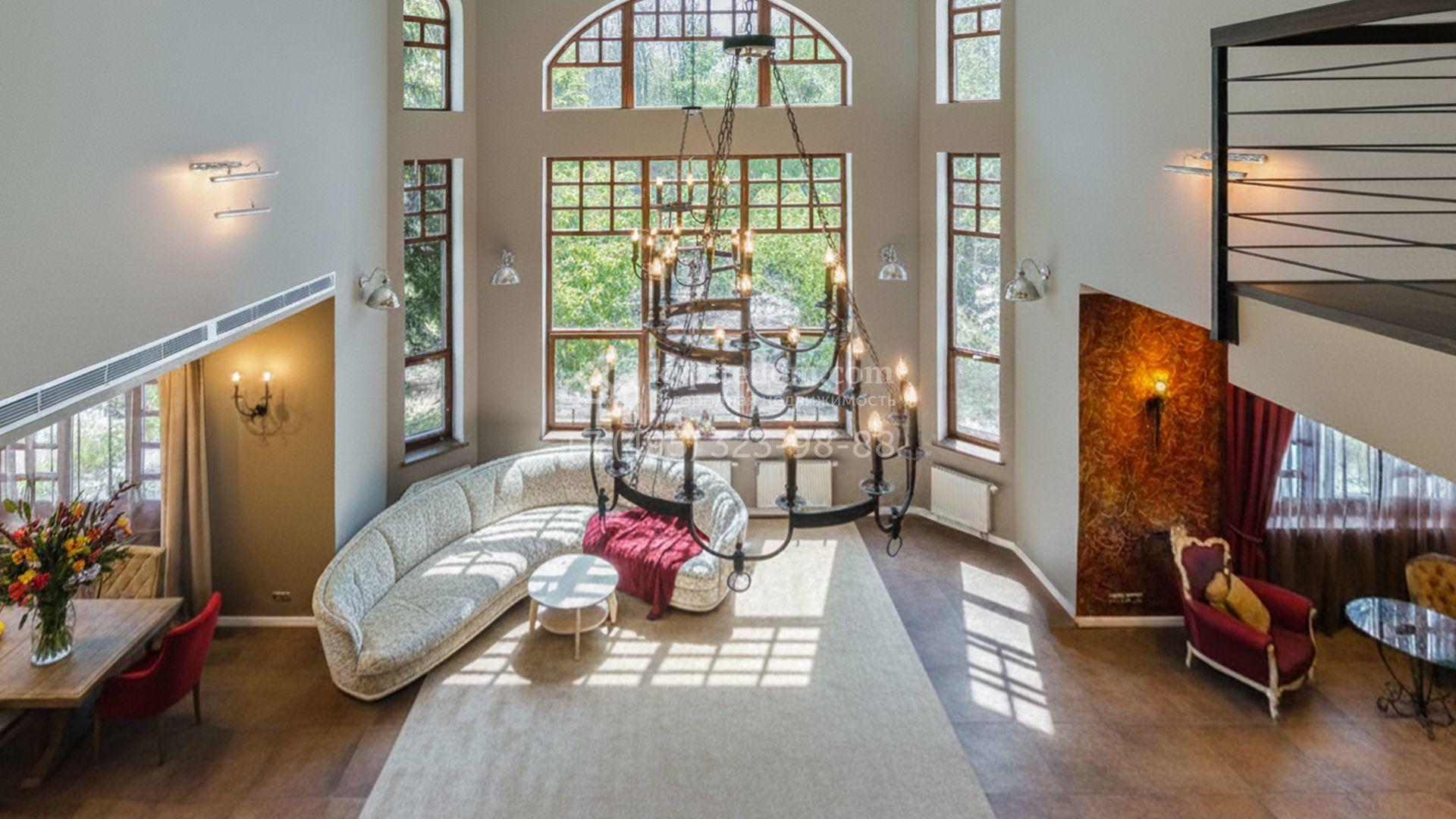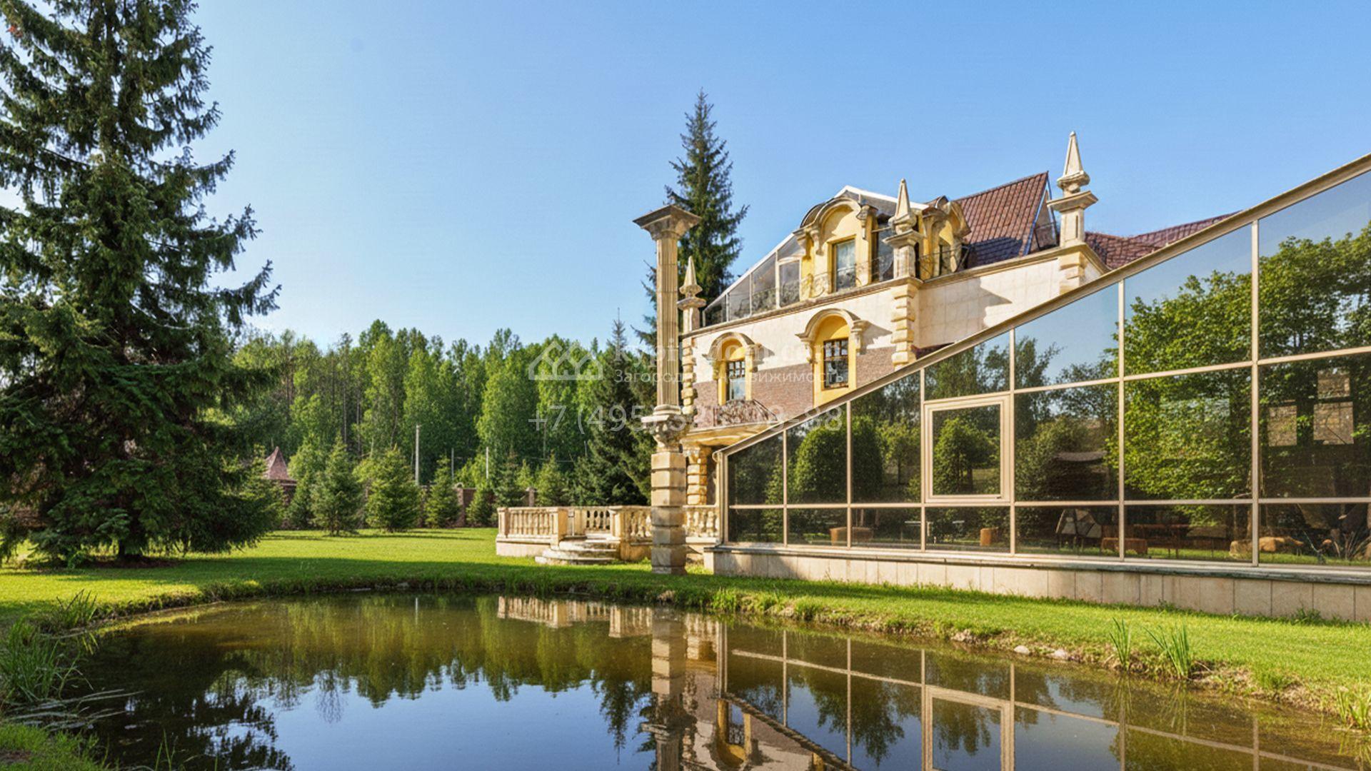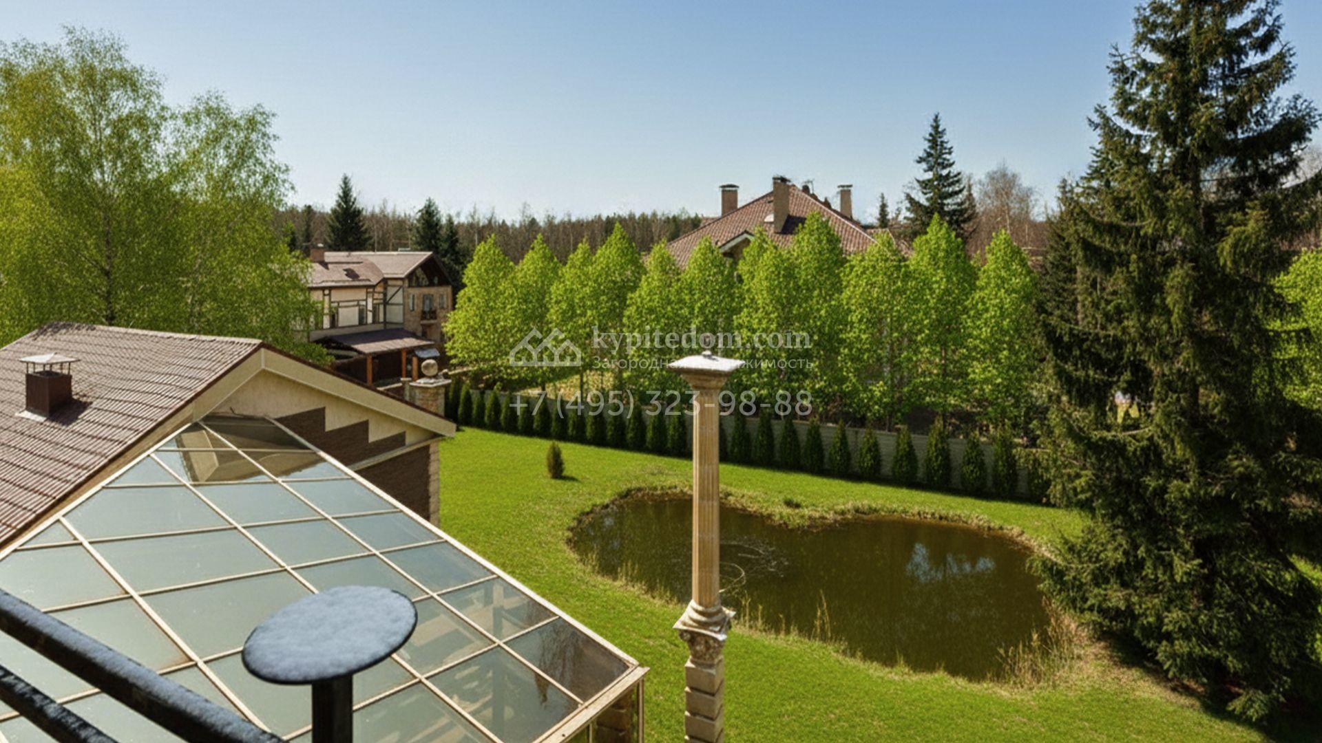 В отделке интерьера использовали натуральный массив дуба, сосну, оникс, сланец и мозаику. Дом обставили дизайнерской мебелью, оборудовали санузлы и светлую просторную кухню. В резиденции подключена система «умный дом» для контроля отопления, освещения и других параметров. Из окон спален открывается вид на ровную гладь декоративного пруда. Дополнительно на территории построили дом персонала с гаражом для двух машин и русскую дровяную баню.