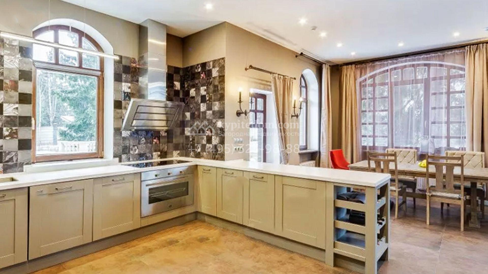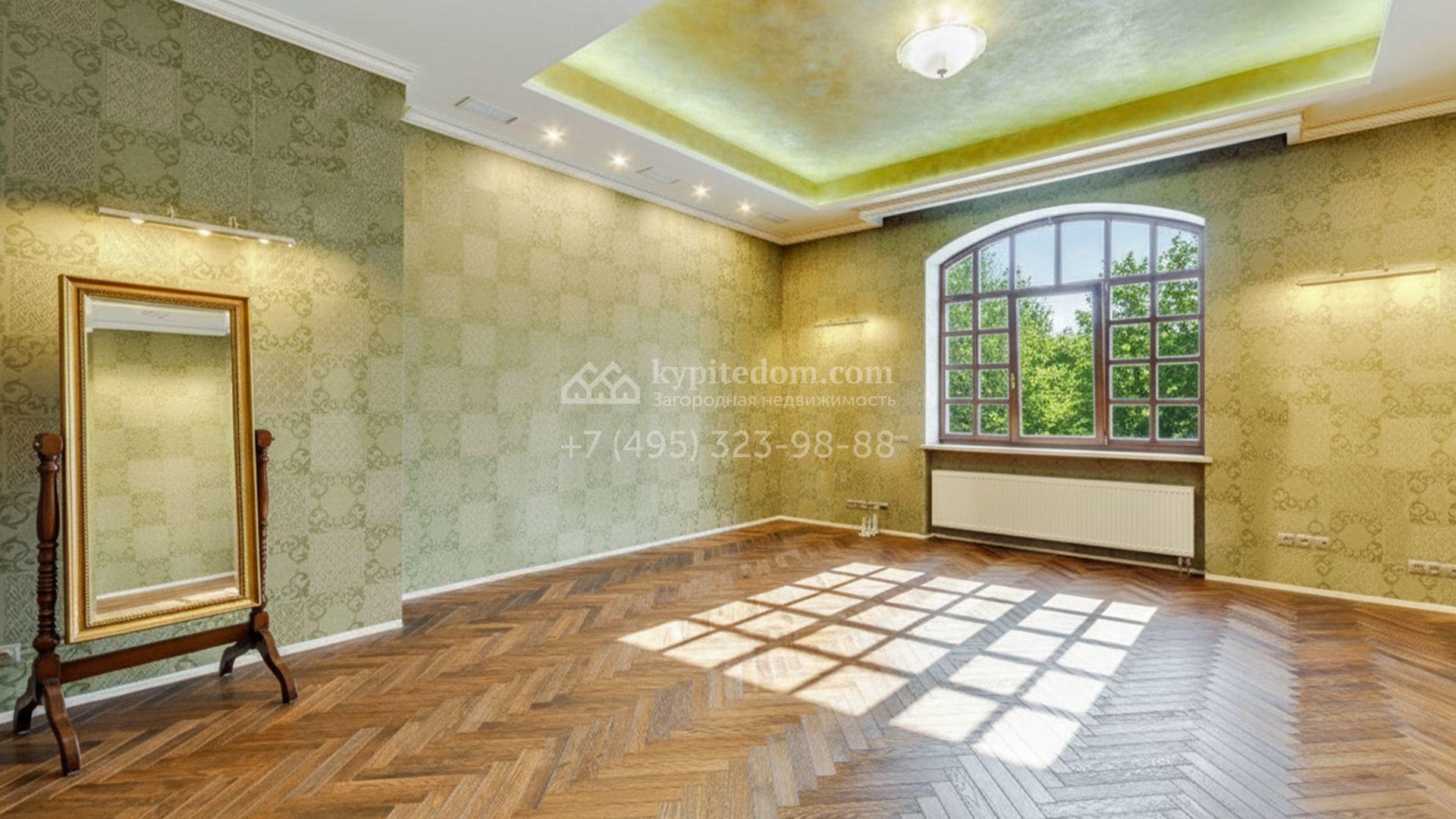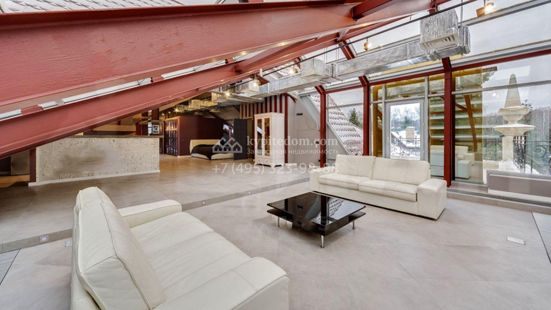 В отделке интерьера использовали натуральный массив дуба, сосну, оникс, сланец и мозаику. Дом обставили дизайнерской мебелью, оборудовали санузлы и светлую просторную кухню. В резиденции подключена система «умный дом» для контроля отопления, освещения и других параметров. Из окон спален открывается вид на ровную гладь декоративного пруда. Дополнительно на территории построили дом персонала с гаражом для двух машин и русскую дровяную баню.